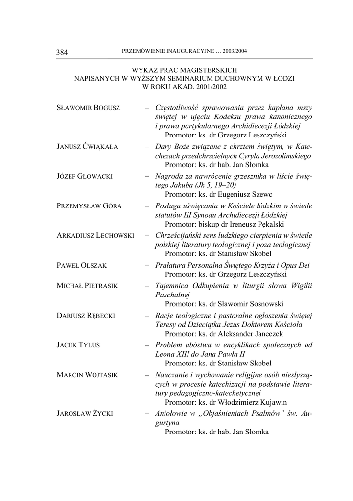 PRZEMÓWIENIE INAUGURACYJNE … 2003/2004 384 WYKAZ PRAC MAGISTERSKICH NAPISANYCH W WYŻSZYM SEMINARIUM DUCHOWNYM W ŁODZI W ROKU AKAD. 2001/2002 SŁAWOMIR BOGUSZ JANUSZ ĆWIĄKAŁA JÓZEF GŁOWACKI PRZEMYSŁAW GÓRA ARKADIUSZ LECHOWSKI PAWEŁ OLSZAK MICHAŁ PIETRASIK DARIUSZ RĘBECKI JACEK TYLUŚ MARCIN WOJTASIK JAROSŁAW ŻYCKI – Częstotliwość sprawowania przez kapłana mszy świętej w ujęciu Kodeksu prawa kanonicznego i prawa partykularnego Archidiecezji Łódzkiej Promotor: ks. dr Grzegorz Leszczyński – Dary Boże związane z chrztem świętym, w Katechezach przedchrzcielnych Cyryla Jerozolimskiego Promotor: ks. dr hab. Jan Słomka – Nagroda za nawrócenie grzesznika w liście świętego Jakuba (Jk 5, 19–20) Promotor: ks. dr Eugeniusz Szewc – Posługa uświęcania w Kościele łódzkim w świetle statutów III Synodu Archidiecezji Łódzkiej Promotor: biskup dr Ireneusz Pękalski – Chrześcijański sens ludzkiego cierpienia w świetle polskiej literatury teologicznej i poza teologicznej Promotor: ks. dr Stanisław Skobel – Prałatura Personalna Świętego Krzyża i Opus Dei Promotor: ks. dr Grzegorz Leszczyński – Tajemnica Odkupienia w liturgii słowa Wigilii Paschalnej Promotor: ks. dr Sławomir Sosnowski – Racje teologiczne i pastoralne ogłoszenia świętej Teresy od Dzieciątka Jezus Doktorem Kościoła Promotor: ks. dr Aleksander Janeczek – Problem ubóstwa w encyklikach społecznych od Leona XIII do Jana Pawła II Promotor: ks. dr Stanisław Skobel – Nauczanie i wychowanie religijne osób niesłyszących w procesie katechizacji na podstawie literatury pedagogiczno-katechetycznej Promotor: ks. dr Włodzimierz Kujawin – Aniołowie w „Objaśnieniach Psalmów” św. Augustyna Promotor: ks. dr hab. Jan Słomka PRZEMÓWIENIE INAUGURACYJNE … 2003/2004 385 WYKAZ PRAC MAGISTERSKICH NAPISANYCH W WYŻSZYM SEMINARIUM DUCHOWNYM W ŁODZI W ROKU AKAD. 2002/2003 WALDEMAR BARTOCHA MARCIN KOŁACZ STANISŁAW KOTOWSKI MARCIN MAJSIK PRZEMYSŁAW SZEWCZYK ADAM WALCZYK JACEK WOJCIECHOWSKI – Struktura prawna i uprawnienia Konferencji Episkopatu Polski Promotor: biskup dr Ireneusz Pękalski – Zagadnienie pokory u Ojców Pustyni Promotor: ks. dr hab. Jan Słomka – Rola uczuć w rozwoju życia duchowego na podstawie programu formacyjno-oazowego ks. Franciszka Blachnickiego Promotor: ks. dr Aleksander Janeczek – Koncepcja duszy w filozofii Edyty Stein Promotor: ks. dr Marek Pluta – Nauczanie o Eucharystii w komentarzach św. Augustyna do 6 rozdziału Ewangelii św. Jana Promotor: ks. dr hab. Jan Słomka – Wpływ kierownictwa duchowego Sługi Bożego księdza Michała Sopoćki na duchowość świętej Faustyny Kowalskiej Promotor: ks. dr Aleksander Janeczek – Kształtowanie właściwej postawy wobec wartości pracy w świetle Ogólnopolskiej Konferencji Naukowej zorganizowanej w Turawie w dniach 1–2 czerwca 1993 r. Promotor: ks. dr Jan Wolski