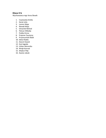 Klasa II b Wychowawca mgr Anna Słowik 1. 2. 3. 4. 5. 6. 7. 8. 9. 10. 11. 12. 13. 14. 15. 16. Czyżowska Emilia Karaś Julia Lorenc Maja Nowak Maja Omachel Michał Pelczar Mikołaj Podkul Anna Prajsnar Faustyna Przymusioski Rafał Sekut Nadia Staroo Dawid Szul Jagoda Urban Weronika Wnęk Konrad Wojtuś Filip Żywiec Jakub