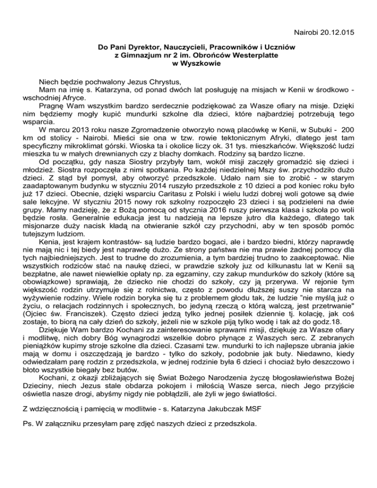 Nairobi 20.12.015 Do Pani Dyrektor, Nauczycieli, Pracowników i Uczniów z Gimnazjum nr 2 im. Obrońców Westerplatte w Wyszkowie Niech będzie pochwalony Jezus Chrystus, Mam na imię s. Katarzyna, od ponad dwóch lat posługuję na misjach w Kenii w środkowo wschodniej Afryce. Pragnę Wam wszystkim bardzo serdecznie podziękować za Wasze ofiary na misje. Dzięki nim będziemy mogły kupić mundurki szkolne dla dzieci, które najbardziej potrzebują tego wsparcia. W marcu 2013 roku nasze Zgromadzenie otworzyło nową placówkę w Kenii, w Subuki - 200 km od stolicy - Nairobi. Mieści sie ona w tzw. rowie tektonicznym Afryki, dlatego jest tam specyficzny mikroklimat górski. Wioska ta i okolice liczy ok. 31 tys. mieszkańców. Większość ludzi mieszka tu w małych drewnianych czy z blachy domkach. Rodziny są bardzo liczne. Od początku, gdy nasza Siostry przybyły tam, wokół misji zaczęły gromadzić się dzieci i młodzież. Siostra rozpoczęła z nimi spotkania. Po każdej niedzielnej Mszy św. przychodziło dużo dzieci. Z stąd był pomysł, aby otworzyć przedszkole. Udało nam sie to zrobić - w starym zaadaptowanym budynku w styczniu 2014 ruszyło przedszkole z 10 dzieci a pod koniec roku było już 17 dzieci. Obecnie, dzięki wsparciu Caritasu z Polski i wielu ludzi dobrej woli gotowe są dwie sale lekcyjne. W styczniu 2015 nowy rok szkolny rozpoczęło 23 dzieci i są podzieleni na dwie grupy. Mamy nadzieję, że z Bożą pomocą od stycznia 2016 ruszy pierwsza klasa i szkoła po woli będzie rosła. Generalnie edukacja jest tu nadzieją na lepsze jutro dla każdego, dlatego tak misjonarze duży nacisk kładą na otwieranie szkół czy przychodni, aby w ten sposób pomóc tutejszym ludziom. Kenia, jest krajem kontrastów- są ludzie bardzo bogaci, ale i bardzo biedni, którzy naprawdę nie mają nic i tej biedy jest naprawdę dużo. Ze strony państwa nie ma prawie żadnej pomocy dla tych najbiedniejszych. Jest to trudne do zrozumienia, a tym bardziej trudno to zaakceptować. Nie wszystkich rodziców stać na naukę dzieci, w prawdzie szkoły juz od kilkunastu lat w Kenii są bezpłatne, ale nawet niewielkie opłaty np. za egzaminy, czy zakup mundurków do szkoły (które są obowiązkowe) sprawiają, że dziecko nie chodzi do szkoły, czy ją przerywa. W rejonie tym większość rodzin utrzymuje się z rolnictwa, często z powodu dłuższej suszy nie starcza na wyżywienie rodziny. Wiele rodzin boryka się tu z problemem głodu tak, że ludzie ”nie myślą już o życiu, o relacjach rodzinnych i społecznych, bo jedyną rzeczą o którą walczą, jest przetrwanie" (Ojciec św. Franciszek). Często dzieci jedzą tylko jednej posiłek dziennie tj. kolację, jak coś zostaje, to biorą na cały dzień do szkoły, jeżeli nie w szkole piją tylko wodę i tak aż do godz.18. Dziękuje Wam bardzo Kochani za zainteresowanie sprawami misji, dziękuję za Wasze ofiary i modlitwę, nich dobry Bóg wynagrodzi wszelkie dobro płynące z Waszych serc. Z zebranych pieniążków kupimy stroje szkolne dla dzieci. Czasami tzw. mundurki to ich najlepsze ubrania jakie mają w domu i oszczędzają je bardzo - tylko do szkoły, podobnie jak buty. Niedawno, kiedy odwiedzałam parę rodzin z przedszkola, w jednej rodzinie była 6 dzieci i chociaż było deszczowo i błoto wszystkie biegały bez butów. Kochani, z okazji zbliżających się Świat Bożego Narodzenia życzę błogosławieństwa Bożej Dzieciny, niech Jezus stale obdarza pokojem i miłością Wasze serca, niech Jego przyjście oświetla nasze drogi, abyśmy nigdy nie pobłądzili, ale żyli w jego światłości. Z wdzięcznością i pamięcią w modlitwie - s. Katarzyna Jakubczak MSF Ps. W załączniku przesyłam parę zdjęć naszych dzieci z przedszkola. w odi edzi nach