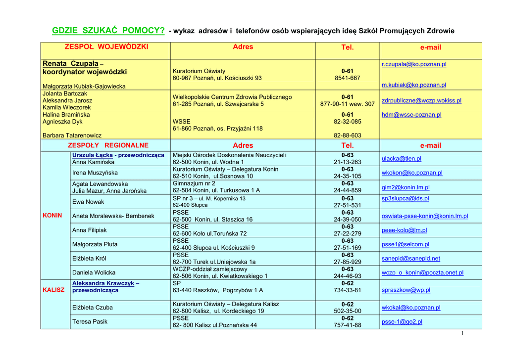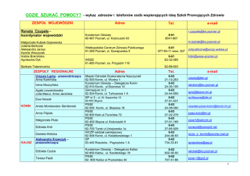 GDZIE SZUKAĆ POMOCY? - wykaz adresów i telefonów osób wspierających ideę Szkół Promujących Zdrowie ZESPOŁ WOJEWÓDZKI Renata Czupała – koordynator wojewódzki Małgorzata Kubiak-Gajowiecka Jolanta Bartczak Aleksandra Jarosz Kamila Wieczorek Halina Bramińska Agnieszka Dyk Adres Agata Lewandowska Julia Mazur, Anna Jarońska Ewa Nowak KONIN Aneta Moralewska- Bembenek Anna Filipiak Małgorzata Pluta Elżbieta Król Daniela Wolicka KALISZ Aleksandra Krawczyk – przewodnicząca Elżbieta Czuba Teresa Pasik 0-61 8541-667 [email protected] Wielkopolskie Centrum Zdrowia Publicznego 61-285 Poznań, ul. Szwajcarska 5 WSSE 61-860 Poznań, os. Przyjaźni 118 0-61 877-90-11 wew. 307 0-61 82-32-085 [email protected] [email protected] 82-88-603 Adres ZESPOŁY REGIONALNE Irena Muszyńska e-mail [email protected] Kuratorium Oświaty 60-967 Poznań, ul. Kościuszki 93 Barbara Tatarenowicz Urszula Łącka - przewodnicząca Anna Kamińska Tel. Miejski Ośrodek Doskonalenia Nauczycieli 62-500 Konin, ul. Wodna 1 Kuratorium Oświaty – Delegatura Konin 62-510 Konin, ul.Sosnowa 10 Gimnazjum nr 2 62-504 Konin, ul. Turkusowa 1 A SP nr 3 – ul. M. Kopernika 13 Tel. PSSE 62-500 Konin, ul. Staszica 16 PSSE 62-600 Koło ul.Toruńska 72 PSSE 62-400 Słupca ul. Kościuszki 9 PSSE 62-700 Turek ul.Uniejowska 1a WCZP-oddział zamiejscowy 62-506 Konin, ul. Kwiatkowskiego 1 SP 63-440 Raszków, Pogrzybów 1 A 0-63 21-13-263 0-63 24-35-105 0-63 24-44-859 0-63 27-51-531 0-63 24-39-050 0-63 27-22-279 0-63 27-51-169 0-63 27-85-929 0-63 244-46-93 0-62 734-33-81 Kuratorium Oświaty – Delegatura Kalisz 62-800 Kalisz, ul. Kordeckiego 19 PSSE 62- 800 Kalisz ul.Poznańska 44 0-62 502-35-00 0-62 757-41-88 62-400 Słupca e-mail [email protected] [email protected] [email protected] [email protected] [email protected] [email protected] [email protected] [email protected] [email protected] [email protected] [email protected] [email protected] 1 Ewa Marszałek Julia Pilichniewicz-Poczta Małgorzta Błaszczyk Aleksandra Knychała Małgorzata Jóźwiak Magdalena Mróz-Radoms Żaneta Kowalska Dorota Nowakowska -Jany Wawrzyniec Kowalskiprzewodniczący Kalina Pabisiak -Ignaszewska Urszula Grześkowiak LESZNO Beata Pniewska Maria Machowiak Halina Żygadło Irena Sierpowska-Glapiak Bogumiła Żyto PIŁA Beata Maszewska – przewodnicząca Aleftyna Słobodeniuk Wanda Wiśniewska Alicja Kurkiewicz PSSE 63-600 Kępno ul.Pocztowa 1/3 PSSE 63-700 Krotoszyn ul.Floriańska 10 PSSE 63-400 Ostrów Wlkp. ul.Stefana Rowińskiego 3 PSSE 63-500 Ostrzeszów ul. Gen.Sikorskiego 58 PEES 630300 Pleszew ul.Poznańska 30 PSSE 63-200 Jarocin ul.Wąska 2 Poradnia Psychologiczno - Pedagogiczna 62-800 Kalisz, ul. H. Sawickiej 3 b WCZP-oddział zamiejscowy 62-800 Kalisz, ul. Kolegialna 4 OKUN – 64-100 Leszno, ul. Bolesława Chrobrego 15 0-62 782-32-38 0-62 725032-34 wew.235 0-62 737-89-00 0-62 732-07-70 0-62 508-13-30 0-62 74-76-243 0-62 764-00-00 0-62 762-75-97 0-65 529-90-62 PSSE64-100 Leszno, ul. Dworcowa 11 PSSE 63-800 Gostyń ul.Wrocławska 8 PSSE 64-000 Kościan ul.Piaskowa 42a PSSE 63-900 Rawicz ul.Wały Jana Dąbrowskiego 2 Kuratorium Oświaty- Delegatura Leszno 0-65 52-05-949 0-65 57-23-089 0-65 51-22-233 0-65 54-53-937 SP nr 5 64-100 Leszno ul.Gronowska 45 SP nr 3 63-900 Rawicz ul. Wały Dąbrowskiego 1 Kuratorium Oświaty- Delegatura Piła 64-920 Piła, Al. Niepodległosci 33 0-65 527-12-20 0-65 546-27-76 0-67 253-01-62 [email protected] [email protected] [email protected] [email protected] [email protected] [email protected] [email protected] [email protected] [email protected] [email protected] [email protected] [email protected] [email protected] [email protected] [email protected] ODN PSSE 64-920 Piła, ul. Aleja Wojska Polskiego 43 PSSE 64-800 Chodzież ul.Składowa 5 0-67 351-98-40 0-67 28-20-272 [email protected] [email protected] 2 Tomasz Mądrowski Elżbieta Borczyk Lucyna Kacprzak Alicja Szwedzińska Danuta Joachimiak Elżbieta Horak Jolanta Bartczak POZNAŃ Aleksandra Jarosz Kamila Wieczorek Janusz Pituła Jolanta Kaptur Hanna Majchrzak Maria Gilowska Urszula Piaszczyńska Hanna Jankowska Ewa Krzyżańska Honorata Ciechańska Anastazja Krysztofek-Kinal Krystna Nowakowska Urszula Gołąb Krystna Ciesielczyk Elżbieta Poniewierska Anna Mandyka PSSE 64-700 Czarnków ul.Zamkowa 8 PSSE 77-400 Złotów pl.Wolności 13 WCZP- oddział zamiejscowy 64-920 Piła, ul. Lotnicza 3 Poradnia Psychologiczno - Pedagogiczna 64-920 Piła, ul. Sikorskiego 19 SP nr 3 64-980 Trzcianka, ul. Broniewskiego 2 0-67 25-52-240 0-67 26-33-427 0-67 212-29-95 0-67 351-75-51 0-67 216-21 32 Wielkopolskie Centrum Zdrowia Publicznego 61-285 Poznań, ul. Szwajcarska 5 0-61 877-90-11 wew. 307 ODN- Poznań 61-714 Poznań, ul. Aleja Niepodległości 34 Gimnazjum nr 3 62-020 Swarzędz , Os. Czwartaków 5/26 ZS z OS nr 1 61-678 Poznań , Os. Pod Lipami 106 XII LO Poznań ul. Kutrzeby 12 Wydz. Zdrowia i Spraw Społecznych UM Poznania 61-841 Poznań, Plac Kolegiacki 17 PSSE 61-771 Poznań, ul. Sieroca 10 PSSE 62-200 Gniezno ul.Św.wawrzyńca 18 PSSE 62-065 Grodzisk Wlkp. ul.Rakoniewicka 42 PSSE 64- 400 Międzychód ul.Strzelecka 12 PSSE 64-300 Nowy Tomyśl pl.Niepodległości 4 PSSE 64-600 Oborniki ul.J.Piłsudskiego 76 PSSE 64-500 Szamotuły ul.Chrobrego 8 PSSE 63-100 Śrem ul.Wiejska 2 PSSE 63-00- Środa Wlkp. ul.Żwirki i Wigury 1 0-61 85-84-730 0-61 8174-930 0-61 8-200-591 0-61 852-55-58 0-61 87-85-283 0-61 82-02-337 wew.117 0-61 42-62-242 0-61 44-46-067 0-95 74-82-411 0-61 44-20-800 0-61 29-60-407 0-61 29-21-570 0-61 28-35-475 0-61 28-67-081 [email protected] [email protected] [email protected] [email protected] [email protected] [email protected] [email protected] [email protected] [email protected] [email protected] [email protected] [email protected] [email protected] [email protected] [email protected] [email protected] [email protected] 3 Ina Łapacz Maria Wróblewska Elżbieta Roszak PSSE 62-100 Wągrowiec ul.Gnieźnieńska 49 PSSE 64-200 Wolsztyn ul.Drzymały 16