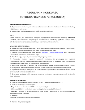 REGULAMIN KONKURSU FOTOGRAFICZNEGO ‘Z KULTURKĄ’ ORGANIZATOR i UCZESTNICY 1. Organizatorem konkursu jest Państwowe Pomaturalne Studium Kształcenia Animatorów Kultury i Bibliotekarzy w Krośnie. 2. Uczestnikami konkursu są uczniowie szkół ponadgimnazjalnych. CELE Celem konkursu jest rozbudzanie, rozwijanie i pogłębianie zainteresowań młodzieŜy fotografią i kulturą, upowszechnianie fotografii jako dziedziny sztuki oraz formy spędzania wolnego czasu, jak równieŜ promowanie udziału młodzieŜy w szeroko rozumianej kulturze. WARUNKI UCZESTNICTWA 1. KaŜdy uczestnik moŜe przesłać od 1 do 5 zdjęć będących interpretacją tematu ‘Z KULTURKĄ’, wykonanych w dowolnej technice, min. 2000 pikseli na dłuŜszym boku. 2. Zdjęcia naleŜy przesyłać na adres mailowy [email protected] wraz z imieniem i nazwiskiem oraz nazwą szkoły autora zdjęć. 3. Przesłanie zdjęć wiąŜe się z akceptacją niniejszego regulaminu. 4. Akceptując niniejszy regulamin uczestnik oświadcza, Ŝe przysługują mu wyłączne i nieograniczone prawa autorskie do nadesłanych fotografii oraz Ŝe wszystkie osoby widniejące na fotografiach wyraŜają zgodę na ich publiczne udostępnienie. 5. Fotografie zgłaszane na Konkurs nie mogą naruszać prawa ani praw osób trzecich, w tym w szczególności dóbr osobistych osób trzecich, a takŜe ogólnie przyjętych norm obyczajowych. 6. Organizator zastrzega sobie prawo do upubliczniania i wykorzystania nadesłanych zdjęć w celach promocyjnych konkursu oraz Studium. 7. Organizator zastrzega sobie prawo do odwołania konkursu w przypadku otrzymania zbyt małej ilości zgłoszeń. PRZEBIEG KONKURSU 1. Konkurs rozpoczyna się w dniu 10 marca 2015 r. i trwa do 19 kwietnia 2015 r. 2. Konkurs składa się z dwóch etapów: - Etap I – trwa do 10 kwietnia 2015 r. – nadsyłanie zdjęć, - 13 kwiecień 2015 r. - wyłonienie przez komisję konkursową zdjęć finałowych, - Etap II – trwa od 13 do 19 kwietnia do godz. 22:00 – głosowanie za pośrednictwem portalu społecznościowego Facebook. 3. Nagrody: - nagroda internautów – tablet multimedialny 4. Warunki otrzymania nagrody: - nagrodę internautów – tablet multimedialny otrzyma autor zdjęcia, które w okresie od 13 do 19 kwietnia 2015 r. zdobędzie najwięcej głosów za pomocą funkcji ‘lubię to’ (polubień) na portalu społecznościowym Facebook. 5. Oficjalne ogłoszenie wyników oraz wręczenie nagrody odbędzie się 23 kwietnia 2015r. w Regionalnym Centrum Kultur Pogranicza w Krośnie podczas wernisaŜu wystawy fotograficznej ‘Taniec obrazów- obraz tańca’. Kontakt: Państwowe Pomaturalne Studium Kształcenia Animatorów Kultury i Bibliotekarzy w Krośnie Ul. Mirandoli Pika 8 38-400 Krosno Tel. 13 43 20544 / [email protected]/ Koordynator Kinga Przystasz