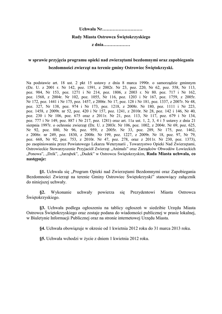 Uchwała Nr……………………… Rady Miasta Ostrowca Świętokrzyskiego z dnia……………… w sprawie przyjęcia programu opieki nad zwierzętami bezdomnymi oraz zapobiegania bezdomności zwierząt na terenie gminy Ostrowiec Świętokrzyski. Na podstawie art. 18 ust. 2 pkt 15 ustawy z dnia 8 marca 1990r. o samorządzie gminnym (Dz. U. z 2001 r. Nr 142, poz. 1591, z 2002r. Nr 23, poz. 220, Nr 62, poz. 558, Nr 113, poz. 984, Nr 153, poz. 1271 i Nr 214, poz. 1806, z 2003 r. Nr 80. poz. 717 i Nr 162, poz. 1568, z 2004r. Nr 102, poz. 1055, Nr 116, poz. 1203 i Nr 167, poz. 1759, z 2005r. Nr 172, poz. 1441 i Nr 175, poz. 1457, z 2006r. Nr 17, poz. 128 i Nr 181, poz. 1337, z 2007r. Nr 48, poz. 327, Nr 138, poz. 974 i Nr 173, poz. 1218, z 2008r. Nr 180, poz. 1111 i Nr 223, poz. 1458, z 2009r. nr 52, poz. 420 i Nr 157, poz. 1241, z 2010r. Nr 28, poz. 142 i 146, Nr 40, poz. 230 i Nr 106, poz. 675 oraz z 2011r. Nr 21, poz. 113, Nr 117, poz. 679 i Nr 134, poz. 777 i Nr 149, poz. 887 i Nr 217, poz. 1281) oraz art. 11a ust. 1, 2, 3, 4 i 5 ustawy z dnia 21 sierpnia 1997r. o ochronie zwierząt (Dz. U. z 2003r. Nr 106, poz. 1002, z 2004r. Nr 69, poz. 625, Nr 92, poz. 880, Nr 96, poz. 959, z 2005r. Nr 33, poz. 289, Nr 175, poz. 1462, z 2006r. nr 249, poz. 1830, z 2008r. Nr 199, poz. 1227, z 2009r. Nr 18, poz. 97, Nr 79, poz. 668, Nr 92, poz. 753, z 2010r. Nr 47, poz. 278, oraz z 2011r. Nr 230, poz. 1373), po zaopiniowaniu przez Powiatowego Lekarza Weterynarii , Towarzystwo Opieki Nad Zwierzętami, Ostrowieckie Stowarzyszenie Przyjaciół Zwierząt „Animals” oraz Zarządców Obwodów Łowieckich „Ponowa”, „Dzik”, „Jarząbek”, „Dudek” w Ostrowcu Świętokrzyskim, Rada Miasta uchwala, co następuje: §1. Uchwala się „Program Opieki nad Zwierzętami Bezdomnymi oraz Zapobiegania Bezdomności Zwierząt na terenie Gminy Ostrowiec Świętokrzyski” stanowiący załącznik do niniejszej uchwały. §2. Wykonanie Świętokrzyskiego. uchwały powierza się Prezydentowi Miasta Ostrowca §3. Uchwała podlega ogłoszeniu na tablicy ogłoszeń w siedzibie Urzędu Miasta Ostrowca Świętokrzyskiego oraz zostaje podana do wiadomości publicznej w prasie lokalnej, w Biuletynie Informacji Publicznej oraz na stronie internetowej Urzędu Miasta. §4. Uchwała obowiązuje w okresie od 1 kwietnia 2012 roku do 31 marca 2013 roku. §5. Uchwała wchodzi w Ŝycie z dniem 1 kwietnia 2012 roku. Załącznik do uchwały Nr………… Rady Miasta Ostrowca Świętokrzyskiego z dnia…………………………………….. PROGRAM OPIEKI NAD ZWIERZĘTAMI BEZDOMNYMI ORAZ ZAPOBIEGANIA BEZDOMNOŚCI ZWIERZĄT NA TERENIE GMINY OSTROWIEC ŚWIĘTOKRZYSKI Rozdział I Przepisy ogólne §1. Działania Gminy w zakresie rozwiązywania problemu bezdomności zwierząt domowych polegają na realizacji następujących celów: 1) zapewnieniu opieki bezdomnym zwierzętom z terenu Gminy Ostrowiec Świętokrzyski oraz wprowadzeniu mechanizmów zachęcających mieszkańców do dokonywania adopcji zwierząt; 2) zapewnieniu bezpieczeństwa mieszkańcom Gminy ze strony zagroŜeń powodowanych przez bezdomne zwierzęta poprzez konsekwentne egzekwowanie przepisów prawa; 3) zmniejszeniu niekontrolowanego wzrostu populacji zwierząt bezdomnych poprzez sterylizację psów i kotów w schroniskach; 4) edukacji i upowszechnianiu wiedzy społeczeństwa w zakresie metod zapobiegania bezdomności zwierząt, ze szczególnym uwzględnieniem sterylizacji i kastracji oraz elektronicznego znakowania (chipowania) zwierząt. §2. Funkcję koordynatora działań zmierzających do ograniczenia bezdomności zwierząt pełni Wydział Gospodarki Komunalnej Urzędu Miasta Ostrowca Świętokrzyskiego. §3. Realizację działań dotyczących przeciwdziałaniu bezdomności zwierząt prowadzą: 1) Wydział Gospodarki Komunalnej Urzędu Miasta Ostrowca Świętokrzyskiego we współpracy z Powiatowym Lekarzem Weterynarii; 2) organizacje społeczne, których statutowym celem działania jest przeciwdziałanie bezdomności zwierząt, schronisko dla zwierząt, lecznica weterynaryjna, Zakład Usług Miejskich – samorządowy zakład budŜetowy z siedzibą w Ostrowcu Świętokrzyskim; 3) StraŜ Miejska oraz Policja poprzez egzekwowanie wobec właścicieli zwierząt obowiązków wynikających z przepisów ustawy o ochronie zwierząt, ustawy o utrzymaniu czystości i porządku w gminach oraz Regulaminu utrzymania czystości i porządku na terenie miasta Ostrowca Świętokrzyskiego. Rozdział II Realizacja załoŜonych celów §4. Zapewnienie opieki bezdomnym zwierzętom polegać będzie na: 1) odławianiu bezdomnych zwierząt, które prowadzone będzie na zlecenie Gminy przez przeszkolonych pracowników Zakładu Usług Miejskich w Ostrowcu Świętokrzyskim w sposób humanitarny, nie stwarzający zagroŜenia dla Ŝycia i zdrowia zwierząt oraz nie zadający im bólu i cierpienia; 2) wyłapywaniu bezdomnych zwierząt, które będzie dokonywane za pomocą specjalistycznego, przeznaczonego do tego celu sprzętu to jest: pętle, widły zaporowe, chwytaki siatkowe, klatki do umieszczenia złapanych zwierząt, ubranie ochronne dla rakarza; 3) prowadzeniu szczegółowej ewidencji zgłoszeń oraz kontroli ich realizacji przez wyznaczonego do tego pracownika Referatu Gospodarki Komunalnej WGK w godzinach pracy Urzędu Miasta, zaś po godzinach pracy i w dni świąteczne przez funkcjonariusza StraŜy Miejskiej pełniącego słuŜbę dyŜurną; 4) tworzeniu i prowadzeniu rejestru społecznych opiekunów kotów wolno Ŝyjących oraz udzielaniu opiekunom pomocy w zakresie opieki nad wolno Ŝyjącymi kotami, w celu ograniczenia i kontroli populacji tych zwierząt. WaŜnym aspektem tych działań są zabiegi sterylizacji i kastracji kotów, a dodatkowo ich odpchlenie i obowiązkowe szczepienie (przeciwko wściekliźnie), a w przypadku chorób – leczenie. 5) sprawowaniu opieki nad kotami wolno Ŝyjącymi, w tym ich dokarmianie, przy współpracy ze społecznymi opiekunami ko