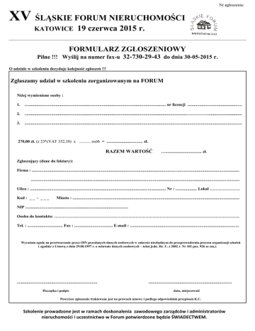 Nr zgłoszenia: XV ŚLĄSKIE FORUM NIERUCHOMOŚCI KATOWICE 19 czerwca 2015 r. FORMULARZ ZGŁOSZENIOWY Pilne !!! Wyślij na numer fax-u 32-730-29-43 do dnia 30-05-2015 r. O udziale w szkoleniu decyduje kolejność zgłoszeń !!! Zgłaszamy udział w szkoleniu zorganizowanym na FORUM Niżej wymienione osoby : 1. .................................................................................................................................... nr licencji ................................................... 2. .......................................................................................................................................................……………................................ 3. ........................................................................................................................................................................................................... 270,00 zł. (z 23%VAT 332,10) x ........... osób = .................................. zł. RAZEM WARTOŚĆ ….................................. zł. Zgłaszający (dane do faktury): Firma : ....................................................................................................................................... ........................................................... ....................................................................................................................................................................................... ............ Ulica : .............................................................................................................. ................. Nr : .................... Lokal ………………… Kod : _ _ - _ _ _ Miasto : ............................................................................................................................................................ NIP ................................................................................................ Osoba do kontaktu: …………………………………………………………………………………………………………………. Tel. : ................................. Fax : .................................... E-mail : ...................................................................................................... Wyrażam zgodę na przetwarzanie przez OIN przesłanych danych osobowych w zakresie niezbędnym do przeprowadzenia procesu organizacji szkoleń ( zgodnie z Ustawą z dnia 29.08.1997 r. o ochronie danych osobowych – tekst jedn. Dz. U. z 2002 r. Nr 101 poz. 926 ze zm.). ........................................................................... Pieczątka i podpis .............................................................................. data, miejscowość Powyższe zgłoszenie traktowane jest na prawach umowy i podlega odpowiednim przepisom K.C. Szkolenie prowadzone jest w ramach doskonalenia zawodowego zarządców i administratorów nieruchomości i uczestnictwo w Forum potwierdzone będzie ŚWIADECTWEM.