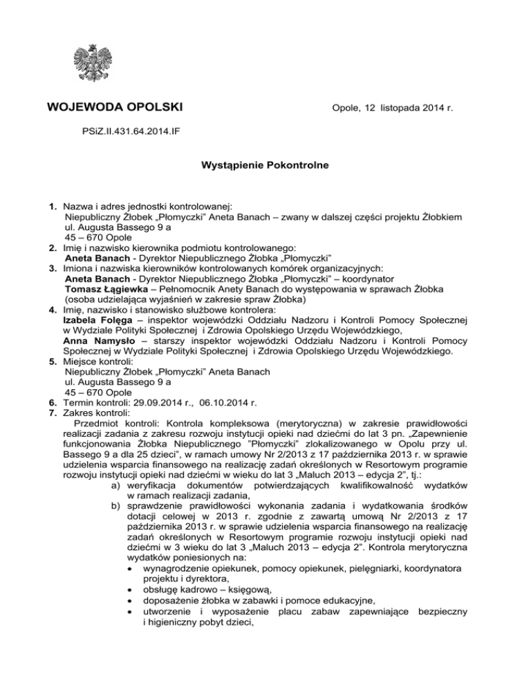 WOJEWODA OPOLSKI Opole, 12 listopada 2014 r. PSiZ.II.431.64.2014.IF Wystąpienie Pokontrolne 1. Nazwa i adres jednostki kontrolowanej: Niepubliczny Żłobek „Płomyczki” Aneta Banach – zwany w dalszej części projektu Żłobkiem ul. Augusta Bassego 9 a 45 – 670 Opole 2. Imię i nazwisko kierownika podmiotu kontrolowanego: Aneta Banach - Dyrektor Niepublicznego Żłobka „Płomyczki” 3. Imiona i nazwiska kierowników kontrolowanych komórek organizacyjnych: Aneta Banach - Dyrektor Niepublicznego Żłobka „Płomyczki” – koordynator Tomasz Łągiewka – Pełnomocnik Anety Banach do występowania w sprawach Żłobka (osoba udzielająca wyjaśnień w zakresie spraw Żłobka) 4. Imię, nazwisko i stanowisko służbowe kontrolera: Izabela Folęga – inspektor wojewódzki Oddziału Nadzoru i Kontroli Pomocy Społecznej w Wydziale Polityki Społecznej i Zdrowia Opolskiego Urzędu Wojewódzkiego, Anna Namysło – starszy inspektor wojewódzki Oddziału Nadzoru i Kontroli Pomocy Społecznej w Wydziale Polityki Społecznej i Zdrowia Opolskiego Urzędu Wojewódzkiego. 5. Miejsce kontroli: Niepubliczny Żłobek „Płomyczki” Aneta Banach ul. Augusta Bassego 9 a 45 – 670 Opole 6. Termin kontroli: 29.09.2014 r., 06.10.2014 r. 7. Zakres kontroli: Przedmiot kontroli: Kontrola kompleksowa (merytoryczna) w zakresie prawidłowości realizacji zadania z zakresu rozwoju instytucji opieki nad dziećmi do lat 3 pn. „Zapewnienie funkcjonowania Żłobka Niepublicznego ”Płomyczki” zlokalizowanego w Opolu przy ul. Bassego 9 a dla 25 dzieci”, w ramach umowy Nr 2/2013 z 17 października 2013 r. w sprawie udzielenia wsparcia finansowego na realizację zadań określonych w Resortowym programie rozwoju instytucji opieki nad dziećmi w wieku do lat 3 „Maluch 2013 – edycja 2”, tj.: a) weryfikacja dokumentów potwierdzających kwalifikowalność wydatków w ramach realizacji zadania, b) sprawdzenie prawidłowości wykonania zadania i wydatkowania środków dotacji celowej w 2013 r. zgodnie z zawartą umową Nr 2/2013 z 17 października 2013 r. w sprawie udzielenia wsparcia finansowego na realizację zadań określonych w Resortowym programie rozwoju instytucji opieki nad dziećmi w 3 wieku do lat 3 „Maluch 2013 – edycja 2”. Kontrola merytoryczna wydatków poniesionych na: wynagrodzenie opiekunek, pomocy opiekunek, pielęgniarki, koordynatora projektu i dyrektora, obsługę kadrowo – księgową, doposażenie żłobka w zabawki i pomoce edukacyjne, utworzenie i wyposażenie placu zabaw zapewniające bezpieczny i higieniczny pobyt dzieci, utrzymanie najmowanego lokalu, w którym zlokalizowany jest żłobek – czynsz, opłaty eksploatacyjne, wyżywienie dzieci, zakup środków utrzymania czystości i dezynfekcji, doposażenie stanowisk pracy. Oceny działalności Żłobka dokonano, w oparciu o przedłożone w trakcie kontroli dokumenty, kontrolę na miejscu realizacji zadania oraz sporządzoną dokumentację fotograficzną. Ustalenia kontroli. Na podstawie art. 28 ustawy z dnia 4 lutego 2011 r. o opiece nad dziećmi w wieku do lat 3 (Dz. U. Nr 45, poz. 235 z późn. zm.) 11 lipca 2013 r. Niepubliczny Żłobek „Płomyczki” Aneta Banach został wpisany do prowadzonego przez Prezydenta Miasta Opole rejestru żłobków pod nr 14/Ż/2013 (zaświadczenie o wpisie do rejestru żłobków stanowi Załącznik nr 1 do akt kontroli). W ramach realizacji Resortowego programu rozwoju instytucji opieki nad dziećmi w wieku do lat 3 „Maluch 20013 – Edycja 2”, Niepubliczny Żłobek „Płomyczki” dnia 26 sierpnia 2013 r. przedłożył do Opolskiego Urzędu Wojewódzkiego korektę Oferty konkursowej „Maluch 2013 – edycja 2” na zapewnienie funkcjonowania miejsc opieki nad dziećmi wieku do lat 3, na podstawie której zawarto umowę Nr 2/2013 z dnia 17 października 2013 r. w sprawie udzielenia wparcia finansowego na realizację zadań określonych w Resortowym Programie rozwoju instytucji opieki nad dziećmi w wieku do lat 3 „Maluch 2013 – edycja 2” na kwotę dofinansowania 131.250,00 zł. Środki finansowe przekazano Żłobkowi w 3 transzach (I transza – 24 października 2013 r. – 75.971,00 zł, II transza – 13 listopada 2013 r. – 31.873,00 zł, III transza – 12 grudnia 2013 r. – 23.406,00 zł) na rachunek bankowy podmiotu wskazany w ww. umowie (wyciągi bankowe stanowią Załącznik nr 2 do akt kontroli). W wyniku dokonanego przez podmiot zwrotu środków w wysokości 2.820,50 zł, kwota dofinansowania ostatecznie wyniosła 128.429,50 zł. Zgodnie z zapisami § 1 ust. 11 ww. umowy, Żłobek zobowiązany był do obniżenia miesięcznych opłat rodziców za dziecko uczęszczające do instytucji opieki nad dziećmi za okres otrzymywania dotacji – o kwotę równą otrzymanej kwocie dotacji na 1 miejsce opieki. Z przedłożonych przez Żłobek dokumentów, tj. listy dzieci objętych dofinansowaniem z resortowego programu rozwoju instytucji opieki nad dziećmi w wieku do lat 3 „MALUCH” realizowanego w konkursie „MALUCH 2013 – edycja 2” , zestawienia wypłat opłaty stałej wraz z wyżywieniem, dowodów wpłaty (pokwitowań), oraz wyciągów bankowych/potwierdzeń transakcji wynika, iż Żłobek dopełnił obowiązku wynikającego z umowy (ww. dokumenty stanowią Załącznik nr 3 do akt kontroli). W zatwierdzonym Sprawozdaniu z realizacji zadania w ramach Programu rozwoju instytucji opieki nad dziećmi w wieku do lat 3 „MALUCH” realizowanego w konkursie „MALUCH 2013 – edycja 2” przedłożonym do Opolskiego Urzędu Wojewódzkiego 30 stycznia 2014 r., Żłobek wykazał 179 dokumentów księgowych w ramach których poniesione wydatki opłacone zostały w całości lub w części ze środków pochodzących z dotacji bądź ze środków własnych Żłobka. Dowody księgowe wyszczególnione w Sprawozdaniu zawierają podatek VAT. Zgodnie z oświadczeniem o kwalifikowalności VAT Pełnomocnika Niepublicznego Żłobka „Płomyczki” z dnia 3 paździer