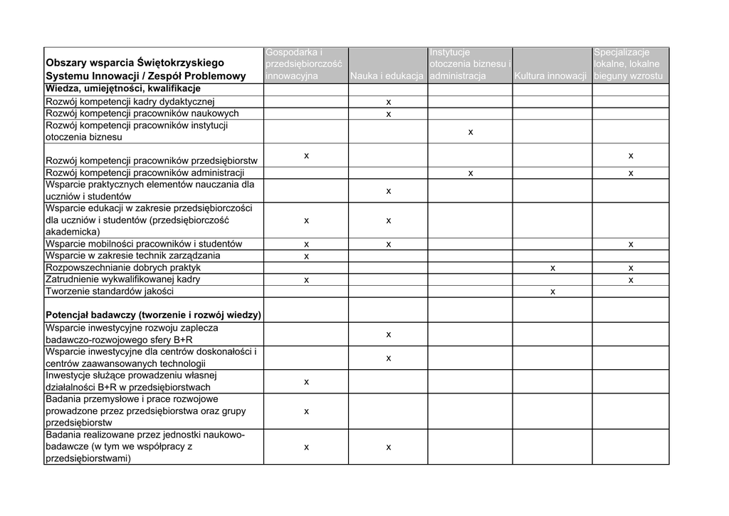 Obszary wsparcia Świętokrzyskiego Systemu Innowacji / Zespół Problemowy Specjalizacje Instytucje Gospodarka i lokalne, lokalne otoczenia biznesu i przedsiębiorczość Kultura innowacji bieguny wzrostu innowacyjna Nauka i edukacja administracja Wiedza, umiejętności, kwalifikacje Rozwój kompetencji kadry dydaktycznej Rozwój kompetencji pracowników naukowych Rozwój kompetencji pracowników instytucji otoczenia biznesu Rozwój kompetencji pracowników przedsiębiorstw Rozwój kompetencji pracowników administracji Wsparcie praktycznych elementów nauczania dla uczniów i studentów Wsparcie edukacji w zakresie przedsiębiorczości dla uczniów i studentów (przedsiębiorczość akademicka) Wsparcie mobilności pracowników i studentów Wsparcie w zakresie technik zarządzania Rozpowszechnianie dobrych praktyk Zatrudnienie wykwalifikowanej kadry Tworzenie standardów jakości Potencjał badawczy (tworzenie i rozwój wiedzy) Wsparcie inwestycyjne rozwoju zaplecza badawczo-rozwojowego sfery B+R Wsparcie inwestycyjne dla centrów doskonałości i centrów zaawansowanych technologii Inwestycje służące prowadzeniu własnej działalności B+R w przedsiębiorstwach Badania przemysłowe i prace rozwojowe prowadzone przez przedsiębiorstwa oraz grupy przedsiębiorstw Badania realizowane przez jednostki naukowobadawcze (w tym we współpracy z przedsiębiorstwami) x x x x x x x x x x x x x x x x x x x x x x x x x Wsparcie zakupu aktywów niematerialnych i prawnych Wsparie dla współpracy zagranicznej sfery naukowo-badawczej Tworzenie standardów jakości Sieci, klastry Budowa i rozbudowa klastrów Tworzenie i rozwój sieci współpracy pomiędzy przedsiębiorstwami (grupy kooperacyjne przedsiębiorstw) Rozwój sieci instytucji otoczenia biznesu Integracja sektora B+R w regionie Wsparcie tworzenia i rozwoju sieci o charakterze międzynarodowym Technologie społeczeństwa informacyjnego Rozwój infrastruktury społeczeństwa informacyjnego (dostępu do internetu itp.) w regionie Rozwój publicznych usług elektronicznych Inwestycje z zakresu zastosowania i wykorzystania technologii ICT w przedsiębiorstwach Wsparcie w zakresie wykorzystania technologii ICT w IOB Informatyzacja sfery B+R Włączenie technologii ICT w system zarządzania w administracji. Tworzenie standardów jakości Transfer wiedzy i technologii Tworzenie i rozwój parków technologicznych Tworzenie i rozwój inkubatorów technologicznych Tworzenie i rozwój inkubatorów przedsiębiorczości x x x x x x x x x x x x x x x x x x x x x x x x Tworzenie i rozwój inkubatorów przedsiębiorczości akademickiej Wsparcie powstawania nowych firm technologicznych (wysokich technologii) Wsparcie przedsiębiorczości, NTBF, Wsparcie rozwoju spinoff, spin-out. Start-up Wsparcie w zakresie technik i procedur transferu technologii Wsparcie systemu ochrony własności intelektualnej Rozwój systemu wymiany wiedzy i informacji pomiędzy firmami i instytucjami z międzynarodowym doświadczeniem Tworzenie standardów jakości Usługi dla innowacji Wsparcie tworzenia nowych instytucji doradczych Usługi szkoleniowe Usługi informacyjne i doradczo-konsultingowe Rozwój aplikacji informatycznych służących uruchamianiu platform usług elektronicznych dla rozwoju usług informacyjnych, szkoleniowych i doradczo-konsultingowych Rozwój usług informacyjnych, szkoleniowych, doradczo-konsultingowych wspomagających tworzenie i rozwój klasterów i sieci współpracy Tworzenie standardów organizacyjnych IOB Wsparcie w organizacji i promocji IOB na rynku Wdrażanie standardów jakości (procedury TT, i inne) Stworzenie zintegrowanego systemu informacji o zasobach innowacyjnych Tworzenie standardów jakości Finanse na innowacje Tworzenie i rozwój funduszy venture capital x x x x x x x x x x x x x x x x x x x x x x x x x x x x x x Tworzenie i rozwój funduszy seed capital Tworzenie i rozwój funduszy pożyczkowych Tworzenie i rozwój funduszy poręczeń kredytowych Bezpośrednie wsparcie finansowe firm (nieruchomości, maszyn, urządzeń) Wsparcie na zakup wartości niematerialnych i prawnych Tworzenie standardów jakości Administracja i zarządzanie polityką innowacyjną Rozwój narzędzi zarządzania RSI Rozwój narzędzi monitorowania i ewaluacji RSI Tworzenie narzędzi służących operacjonalizacji RSI Studia, analizy, ekspertyzy na potrzeby tworzenia i aktualizacji RSI Stworzenie systemu monitorowania potrzeb przedsiębiorstw przez sektor B+R. Wdrażanie systemowych rozwiązań usprawniających proces zarządzania Wzmocnienie kompetencji analitycznych kadr instytucji odpowiedzialnych za monitorowanie i ewaluację polityk Tworzenie kultury innowacji Kreowanie postaw proinnowacyjnych wśród jednostek samorządu terytorialnego Organizacja imprez słuzących bezpośredniej komunikacji pomiędzy aktorami procesów innowacyjnych Tworzenie systemu komunikacji i wymiany informacji między regionalnymi aktorami procesów innowacyjnych Budowanie lokalnego partnerstwa publicznoprywatnego x x x x x x x x nd nd nd nd nd nd nd nd nd nd nd nd nd nd nd nd nd nd nd nd x x x x x x x x x x x Nawiązanie współpracy i realizacja wspólnych działań przez uczelnie w regionie Zaplanowanie współpracy z regionalnymi i lokalnymi mediami. Tworzenie standardów jakości x x x