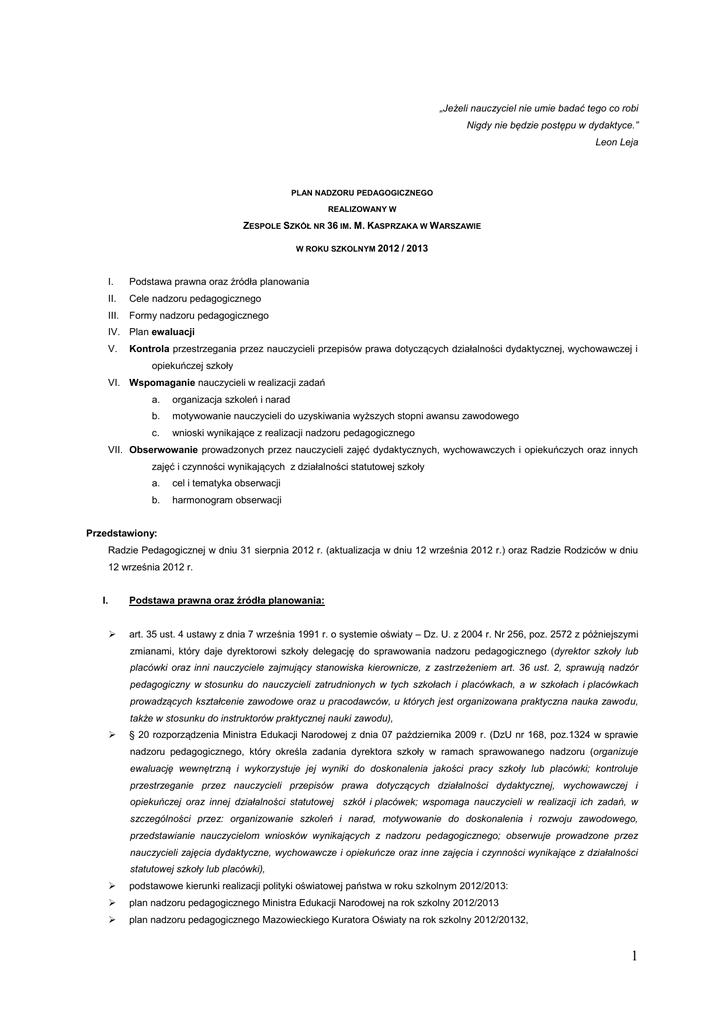 „Jeżeli nauczyciel nie umie badać tego co robi Nigdy nie będzie postępu w dydaktyce.” Leon Leja PLAN NADZORU PEDAGOGICZNEGO REALIZOWANY W ZESPOLE SZKÓŁ NR 36 IM. M. KASPRZAKA W WARSZAWIE W ROKU SZKOLNYM 2012 / 2013 I. Podstawa prawna oraz źródła planowania II. Cele nadzoru pedagogicznego III. Formy nadzoru pedagogicznego IV. Plan ewaluacji V. Kontrola przestrzegania przez nauczycieli przepisów prawa dotyczących działalności dydaktycznej, wychowawczej i opiekuńczej szkoły VI. Wspomaganie nauczycieli w realizacji zadań a. organizacja szkoleń i narad b. motywowanie nauczycieli do uzyskiwania wyższych stopni awansu zawodowego c. wnioski wynikające z realizacji nadzoru pedagogicznego VII. Obserwowanie prowadzonych przez nauczycieli zajęć dydaktycznych, wychowawczych i opiekuńczych oraz innych zajęć i czynności wynikających z działalności statutowej szkoły a. cel i tematyka obserwacji b. harmonogram obserwacji Przedstawiony: Radzie Pedagogicznej w dniu 31 sierpnia 2012 r. (aktualizacja w dniu 12 września 2012 r.) oraz Radzie Rodziców w dniu 12 września 2012 r. I. Podstawa prawna oraz źródła planowania: art. 35 ust. 4 ustawy z dnia 7 września 1991 r. o systemie oświaty – Dz. U. z 2004 r. Nr 256, poz. 2572 z późniejszymi zmianami, który daje dyrektorowi szkoły delegację do sprawowania nadzoru pedagogicznego (dyrektor szkoły lub placówki oraz inni nauczyciele zajmujący stanowiska kierownicze, z zastrzeżeniem art. 36 ust. 2, sprawują nadzór pedagogiczny w stosunku do nauczycieli zatrudnionych w tych szkołach i placówkach, a w szkołach i placówkach prowadzących kształcenie zawodowe oraz u pracodawców, u których jest organizowana praktyczna nauka zawodu, także w stosunku do instruktorów praktycznej nauki zawodu), § 20 rozporządzenia Ministra Edukacji Narodowej z dnia 07 października 2009 r. (DzU nr 168, poz.1324 w sprawie nadzoru pedagogicznego, który określa zadania dyrektora szkoły w ramach sprawowanego nadzoru (organizuje ewaluację wewnętrzną i wykorzystuje jej wyniki do doskonalenia jakości pracy szkoły lub placówki; kontroluje przestrzeganie przez nauczycieli przepisów prawa dotyczących działalności dydaktycznej, wychowawczej i opiekuńczej oraz innej działalności statutowej szkół i placówek; wspomaga nauczycieli w realizacji ich zadań, w szczególności przez: organizowanie szkoleń i narad, motywowanie do doskonalenia i rozwoju zawodowego, przedstawianie nauczycielom wniosków wynikających z nadzoru pedagogicznego; obserwuje prowadzone przez nauczycieli zajęcia dydaktyczne, wychowawcze i opiekuńcze oraz inne zajęcia i czynności wynikające z działalności statutowej szkoły lub placówki), podstawowe kierunki realizacji polityki oświatowej państwa w roku szkolnym 2012/2013: plan nadzoru pedagogicznego Ministra Edukacji Narodowej na rok szkolny 2012/2013 plan nadzoru pedagogicznego Mazowieckiego Kuratora Oświaty na rok szkolny 2012/20132, 1 wnioski z realizacji planu nadzoru pedagogicznego i planu pracy szkoły za rok szkolny 2011/2012, wymagania wobec szkół podstawowych, gimnazjów, szkół ponadgimnazjalnych i szkół artystycznych oraz placówek kształcenia ustawicznego, placówek kształcenia praktycznego i ośrodków dokształcania i doskonalenia zawodowego, określone w rozporządzeniu o nadzorze pedagogicznym, II. priorytety w zakresie doskonalenia zawodowego nauczycieli w województwie mazowieckim na 2013 r. Cele nadzoru pedagogicznego Ocena stanu i warunków działalności dydaktycznej, wychowawczej i opiekuńczej szkoły i nauczycieli Analiza i ocena efektów działalności dydaktycznej, wychowawczej i opiekuńczej oraz innej działalności statutowej szkoły Udzielanie pomocy nauczycielom w wykonywaniu ich zadań dydaktycznych, wychowawczych i opiekuńczych Inspirowanie nauczycieli do innowacji pedagogicznych, metodycznych i organizacyjnych III. Formy nadzoru pedagogicznego Ewaluacja Kontrola Wspomaganie nauczycieli 2 IV. Lp. Plan ewaluacji i wykorzystanie jej wyników do doskonalenia jakości pracy szkoły. Wymaganie Cele ewaluacji Forma Termin Narzędzia Termin określenia wniosków Odpowiedzialny 1. EFEKTY DZIAŁALNOŚCI DYDAKTYCZNEJ, WYCHOWAWCZEJ I OPIEKUŃCZEJ ORAZ INNEJ DZIAŁLNOŚCI STATUTOWEJ SZKOŁY LUB PLACÓWKI. Szkoła lub placówka osiąga cele zgodne z polityką oświatową państwa. Szkoła lub placówka doskonali efekty swojej pracy. 1.1 Analizuje się wyniki egzaminu maturalnego i egzaminu zawodowego Ocena wykorzystania wniosków z analizy wyników egzaminów zewnętrznych do poprawy jakości pracy szkoły oraz wzrostu efektów kształcenia Analiza dokumentów 08 .2012 10. 2012 01. 2013 Arkusz informacyjny Analizator matur Zespoły przedmiotowe –analiza; Dyrektor szkoły Dyrektor szkoły– raport 08.2012, prezentacja na RP (10. 2012) Normy staninowe EWD 2. FUNKCJONOWANIE SZKOŁY LUB PLACÓWKI W ŚRODOWISKU LOKALNYM. Szkoła lub placówka jest integralnym elementem środowiska, w którym działa. Szkoła lub placówka współpracuje ze środowiskiem na rzecz rozwoju własnego i lokalnego. Szkoła lub placówka racjonalnie wykorzystuje warunku, w których działa. 3.3. Promowana jest wartość edukacji Uzyskanie informacji, czy właściwie jest prowadzona promocja szkoły, czy i w jaki sposób zmodyfikować działanie promocyjne szkoły Ankietowanie Wywiad dyrektorem Od 11.2012 Ankieta dla rodziców z do 02.2013 Ankieta dla uczniów Przewodniczący Zespołu ds. ewaluacji 02.2013 rada pedagogiczna 3. ZARZĄDZANIE SZKOŁĄ LUB PLACÓWKĄ Zarządzanie zapewnia sprawne funkcjonowanie szkoły lub placówki. 4.2. Sprawowany jest wewnętrzny nadzór pedagogiczny Zbadanie skuteczności sprawowanego nadzoru pedagogicznego Analiza dokumentów 10. 2012 Protokoły kontroli wewnętrznej Dyrektor Zastępca dyrektora Kierownik laboratorium zajęć praktycznych 02.2013-plenarna pedagogiczna rada V. Kontrola przestrzegania przez nauczycieli przepisów prawa dotyczących działalności 