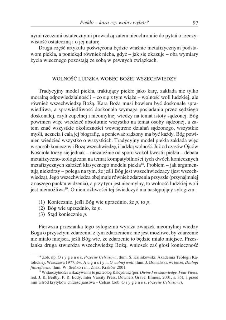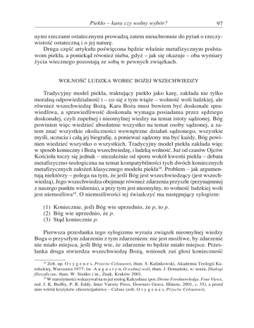Piekło – kara czy wolny wybór? 97 nymi rzeczami ostatecznymi prowadzą zatem nieuchronnie do pytań o rzeczy− wistość ostateczną i o jej naturę. Druga część artykułu poświęcona będzie właśnie metafizycznym podsta− wom piekła, a poniekąd również nieba, gdyż – jak się okazuje – oba wymiary życia wiecznego pozostają ze sobą w pewnych związkach. WOLNOŚĆ LUDZKA WOBEC BOŻEJ WSZECHWIEDZY Tradycyjny model piekła, traktujący piekło jako karę, zakłada nie tylko moralną odpowiedzialność i – co się z tym wiąże – wolność woli ludzkiej, ale również wszechwiedzę Bożą. Kara Boża musi bowiem być doskonale spra− wiedliwa, a sprawiedliwość doskonała wymaga posiadania przez sędziego doskonałej, czyli zupełnej i nieomylnej wiedzy na temat istoty sądzonej. Bóg powinien więc wiedzieć absolutnie wszystko na temat osoby sądzonej, a za− tem znać wszystkie okoliczności wewnętrzne działań sądzonego, wszystkie myśli, uczucia i całą jej biografię, a ponieważ sądzony ma być każdy, Bóg powi− nien wiedzieć wszystko o wszystkich. Tradycyjny model piekła zakłada więc w sposób konieczny i Bożą wszechwiedzę, i ludzką wolność. Już od czasów Ojców Kościoła toczy się jednak – niezależnie od sporu wokół kwestii piekła – debata metafizyczno−teologiczna na temat kompatybilności tych dwóch koniecznych metafizycznych założeń klasycznego modelu piekła18. Problem – jak argumen− tują niektórzy – polega na tym, że jeśli Bóg jest wszechwiedzący (jest wszech− wiedzą), Jego wszechwiedza obejmuje również zdarzenia przyszłe (przynajmniej z naszego punktu widzenia), a przy tym jest nieomylny, to wolność ludzkiej woli jest niemożliwa19. O niemożliwości tej świadczyć ma następujący sylogizm: (1) Koniecznie, jeśli Bóg wie uprzednio, że p, to p. (2) Bóg wie uprzednio, że p. (3) Stąd koniecznie p. Pierwsza przesłanka tego sylogizmu wyraża związek nieomylnej wiedzy Boga o przyszłym zdarzeniu z tym zdarzeniem: nie jest możliwe, by zdarzenie nie miało miejsca, jeśli Bóg wie, że zdarzenie to będzie miało miejsce. Przes− łanka druga stwierdza wszechwiedzę Bożą, wniosek zaś głosi konieczność 18 Zob. np. O r y g e n e s, Przeciw Celsusowi, tłum. S. Kalinkowski, Akademia Teologii Ka− tolickiej, Warszawa 1977; św. A u g u s t y n, O wolnej woli, tłum. J. Domański, w: tenże, Dialogi filozoficzne, tłum. W. Sieńko i in., Znak, Kraków 2001. 19 W starożytności wskazywał na to już teolog Kalcydiusz (por. Divine Foreknowledge. Four Views, red. J. K. Beilby, P. R. Eddy, Inter Varsity Press, Downers Grave, Illinois, 2001, s. 35), a przed nim wśród krytyków chrześcijaństwa – Celsus (zob. O r y g e n e s, Przeciw Celsusowi). 98 Dariusz ŁUKASIEWICZ zdarzenia, o którym Bóg wie uprzednio, że się wydarzy. Niech zdarzeniem tym będzie na przykład to, że Judasz zostanie potępiony. Zastępując w po− wyższym sylogizmie zmienną zdaniową p zdaniem „Judasz zostanie potępio− ny”, otrzymujemy następujący sylogizm: (4) Koniecznie, jeśli Bóg wie uprzednio, że Judasz zostanie potępiony, to Judasz zostanie potępiony. (5) Bóg wie uprzednio, że Judasz zostanie potępiony. (6) Stąd koniecznie Judasz zostanie potępiony. Potępienie Judasza jest więc jakoś „spowodowane” przez wiedzę Boga, ale czy wobec tego to, że Judasz zostanie potępiony, jest sprawiedliwe? Chociaż nie będziemy w niniejszych rozważaniach wchodzić we wszystkie szczegóły debaty nad kwestią kompatybilności wiedzy Bożej, wolności ludzkiej i spra− wiedliwości Bożej20, odnotować należy fakt, że zwolennicy klasycznego mo− delu piekła (np. św. Augustyn, św. Anzelm czy św. Tomasz z Akwinu) istotnie zakładali wszechwiedzę Bożą obejmującą zdarzenia przyszłe. Słusznie jednak argumentowali, że wniosek (6) nie wynika logicznie z przesłanek (4) i (5). Albowiem z przesłanek tych wynika jedynie, że Judasz zostanie potępiony (należy dodać: przy założeniu, że – po pierwsze – dopuścił się on w sposób wolny czynów, o których wiemy, że Bóg wie, że Judasz je popełnił, oraz – po drugie – że Bóg istotnie potępi Judasza za to, co zrobił). Problem kompatybil− ności wiedzy Bożej, wolności ludzkiej i sprawiedliwości Bożej nie daje się jednak tak łatwo uchylić, gdyż powyższe sylogizmy można zmodyfikować, wprowadzając do nich założenie o konieczności Bożej wszechwiedzy. (4) Koniecznie, jeśli Bóg wie uprzednio, że Judasz zostanie potępiony, to Judasz zostanie potępiony. (5) Koniecznie Bóg wie uprzednio, że Judasz zostanie potępiony. (6) Stąd koniecznie Judasz zostanie potępiony. Ostatni sylogizm jest logicznie poprawnym rozumowaniem: wniosek wy− nika z przesłanek. Cała niemalże debata nad wszechwiedzą i wolnością Bożą, a w kontekście tradycyjnego modelu piekła rozumianego jako kara również debata nad Bożą sprawiedliwością, musiała się więc skupić przede wszystkim na prawdziwości przesłanki (5). Dlaczego Boża wiedza o przyszłości jest ko− nieczna oraz co to w ogóle znaczy, że jest ona konieczna? Otóż konieczność Bożej wiedzy rozumie się jako konieczność historyczną albo jako koniecz− 20 Na temat ten zob. D. Ł u k a s i e w i c z, Bóg, wszechwiedza, wolność, Wydawnictwo Epi− gram, Bydgoszcz 2007. Piekło – kara czy wolny wybór? 99 ność przeszłości: niemożliwe jest, aby to co było, nie było. Przeszłości nie można zmienić ani anulować. Skoro Boża wiedza o przyszłości jest uprzednia wobec niej, to znaczy, że jest ona przeszła, a zatem niezmienna. Jeżeli więc Bóg wiedział, że Judasz zostanie potępiony, to koniecznie się tak stanie, bo nie może się już wydarzyć nic, co mogłoby zmienić przeszłość, do której nale− ży również Boża wiedza o przyszłym losie Judasza. Niezmienność przeszłości pociąga więc za sobą nieuchronność przyszł
