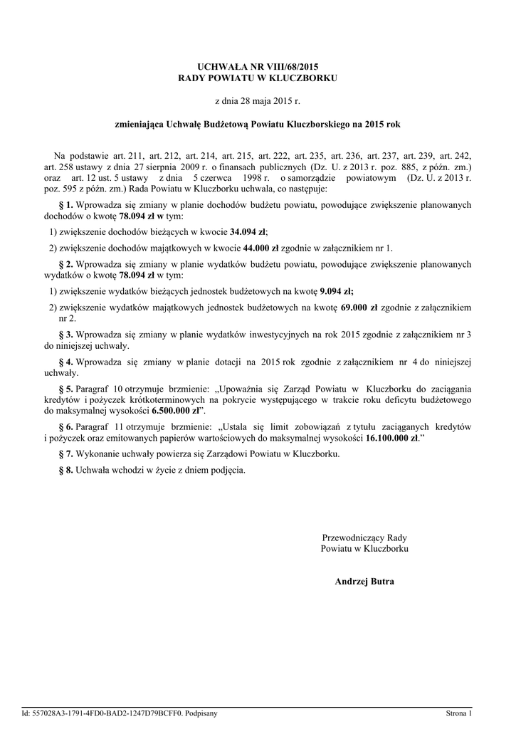 UCHWAŁA NR VIII/68/2015 RADY POWIATU W KLUCZBORKU z dnia 28 maja 2015 r. zmieniająca Uchwałę Budżetową Powiatu Kluczborskiego na 2015 rok Na podstawie art. 211, art. 212, art. 214, art. 215, art. 222, art. 235, art. 236, art. 237, art. 239, art. 242, art. 258 ustawy z dnia 27 sierpnia 2009 r. o finansach publicznych (Dz. U. z 2013 r. poz. 885, z późn. zm.) oraz art. 12 ust. 5 ustawy z dnia 5 czerwca 1998 r. o samorządzie powiatowym (Dz. U. z 2013 r. poz. 595 z późn. zm.) Rada Powiatu w Kluczborku uchwala, co następuje: § 1. Wprowadza się zmiany w planie dochodów budżetu powiatu, powodujące zwiększenie planowanych dochodów o kwotę 78.094 zł w tym: 1) zwiększenie dochodów bieżących w kwocie 34.094 zł; 2) zwiększenie dochodów majątkowych w kwocie 44.000 zł zgodnie w załącznikiem nr 1. § 2. Wprowadza się zmiany w planie wydatków budżetu powiatu, powodujące zwiększenie planowanych wydatków o kwotę 78.094 zł w tym: 1) zwiększenie wydatków bieżących jednostek budżetowych na kwotę 9.094 zł; 2) zwiększenie wydatków majątkowych jednostek budżetowych na kwotę 69.000 zł zgodnie z załącznikiem nr 2. § 3. Wprowadza się zmiany w planie wydatków inwestycyjnych na rok 2015 zgodnie z załącznikiem nr 3 do niniejszej uchwały. § 4. Wprowadza się zmiany w planie dotacji na 2015 rok zgodnie z załącznikiem nr 4 do niniejszej uchwały. § 5. Paragraf 10 otrzymuje brzmienie: „Upoważnia się Zarząd Powiatu w Kluczborku do zaciągania kredytów i pożyczek krótkoterminowych na pokrycie występującego w trakcie roku deficytu budżetowego do maksymalnej wysokości 6.500.000 zł”. § 6. Paragraf 11 otrzymuje brzmienie: „Ustala się limit zobowiązań z tytułu zaciąganych kredytów i pożyczek oraz emitowanych papierów wartościowych do maksymalnej wysokości 16.100.000 zł.” § 7. Wykonanie uchwały powierza się Zarządowi Powiatu w Kluczborku. § 8. Uchwała wchodzi w życie z dniem podjęcia. Przewodniczący Rady Powiatu w Kluczborku Andrzej Butra Id: 557028A3-1791-4FD0-BAD2-1247D79BCFF0. Podpisany Strona 1 Załącznik Nr 1 do Uchwały Nr VIII/68/2015 Rady Powiatu w Kluczborku z dnia 28 maja 2015 r. Budżet na rok 2015 DOCHODY Dział Rozdział Nazwa 801 Oświata i wychowanie 80140 Centra kształcenia ustawicznego i praktycznego oraz ośrodki dokształcania zawodowego Zwiększenie Zmniejszenie 3 010 3 010 0 0 3 010 0 6 150 6 150 0 0 6 150 0 68 934 68 934 0 0 Dotacje celowe otrzymane z budżetu państwa na zadania bieżące 2110 z zakresu administracji rządowej oraz inne zadania zlecone ustawami realizowane przez powiat 24 934 0 Dotacje celowe otrzymane z budżetu państwa na inwestycje 6410 i zakupy inwestycyjne z zakresu administracji rządowej oraz inne zadania zlecone ustawami realizowane przez powiat 44 000 0 78 094 0 Dotacje celowe otrzymane z powiatu na zadania bieżące 2320 realizowane na podstawie porozumień (umów) między jednostkami samorządu terytorialnego 852 Pomoc społeczna 85202 Domy pomocy społecznej 0960 Otrzymane spadki, zapisy i darowizny w postaci pieniężnej 853 Pozostałe zadania w zakresie polityki społecznej 85334 Pomoc dla repatriantów RAZEM DOCHODY Id: 557028A3-1791-4FD0-BAD2-1247D79BCFF0. Podpisany Strona 2 Załącznik Nr 2 do Uchwały Nr VIII/68/2015 Rady Powiatu w Kluczborku z dnia 28 maja 2015 r. Budżet na rok 2015 WYDATKI Dział Rozdział Nazwa 852 Pomoc społeczna 85202 Domy pomocy społecznej Wydatki bieżące w tym: wydatki jednostek budżetowych, w tym: wydatki związane z realizacją ich statutowych zadań; 853 Pozostałe zadania w zakresie polityki społecznej 85334 Pomoc dla repatriantów Wydatki bieżące w tym: wydatki jednostek budżetowych, w tym: wynagrodzenia i składki od nich naliczane, Wydatki majątkowe w tym: inwestycje i zakupy inwestycyjne w tym: dotacje celowe na zadnia inwestycyjne dla jednostek spoza sektora finansów publicznych 854 Edukacyjna opieka wychowawcza 85410 Internaty i bursy szkolne Wydatki bieżące w tym: wydatki jednostek budżetowych, w tym: wydatki związane z realizacją ich statutowych zadań; 900 Gospodarka komunalna i ochrona środowiska 90095 Pozostała działalność Wydatki bieżące Id: 557028A3-1791-4FD0-BAD2-1247D79BCFF0. Podpisany Zwiększenie Zmniejszenie 6 150 6 150 0 0 6 150 0 6 150 0 6 150 0 68 934 68 934 0 0 24 934 0 24 934 0 24 934 0 44 000 0 44 000 0 44 000 0 3 010 3 010 0 0 3 010 0 3 010 0 3 010 0 25 000 25 000 25 000 25 000 0 25 000 Strona 3 Dział Rozdział w tym: Nazwa wydatki jednostek budżetowych, w tym: wydatki związane z realizacją ich statutowych zadań; Wydatki majątkowe w tym: inwestycje i zakupy inwestycyjne w tym: dotacje celowe na zadnia inwestycyjne dla jednostek spoza sektora finansów publicznych RAZEM WYDATKI Id: 557028A3-1791-4FD0-BAD2-1247D79BCFF0. Podpisany Zwiększenie Zmniejszenie 0 25 000 0 25 000 25 000 0 25 000 0 25 000 0 103 094 25 000 Strona 4 Załącznik Nr 3 do Uchwały Nr VIII/68/2015 Rady Powiatu w Kluczborku z dnia 28 maja 2015 r. Budżet na rok 2015 WYDATKI Dział 600 Rozdział Nazwa Transport i łączność 0 7 692 451 160 000 0 0 160 000 160 000 0 0 160 000 7 532 451 0 0 7 532 451 2 254 506 0 0 2 254 506 1 077 811 0 0 1 077 811 1 899 340 0 0 1 899 340 2 300 794 0 0 2 300 794 Gospodarka mieszkaniowa 3 158 043 0 0 3 158 043 70005 3 158 043 0 0 3 158 043 Remont i przebudowa budynku w Lasowicach w celu przystososowania na dom dziecka 200 000 0 0 200 000 Remont budynku przy Jagiellońskiej 3 w Kluczborku 500 000 0 0 500 000 378 351 0 0 378 351 2 079 692 0 0 2 079 692 Działalność usługowa 67 100 0 0 67 100 71030 67 100 0 0 67 100 67 100 0 0 67 100 Administracja publiczna 30 900 0 0 30 900 75020 30 900 0 0 30 900 60004 Lokalny transport zbiorowy 60014 Wniesienie wkładu do spółki PKS w Kluczborku sp. z o.o. Drogi publiczne powiatowe Gospodarka gruntami i nieruchomościami Termomodernizacja budynku Urzędu Miejskiego i Starostwa Powiatowego w Kluczborku Zwiększenie efektywności energetycznej w obiekt