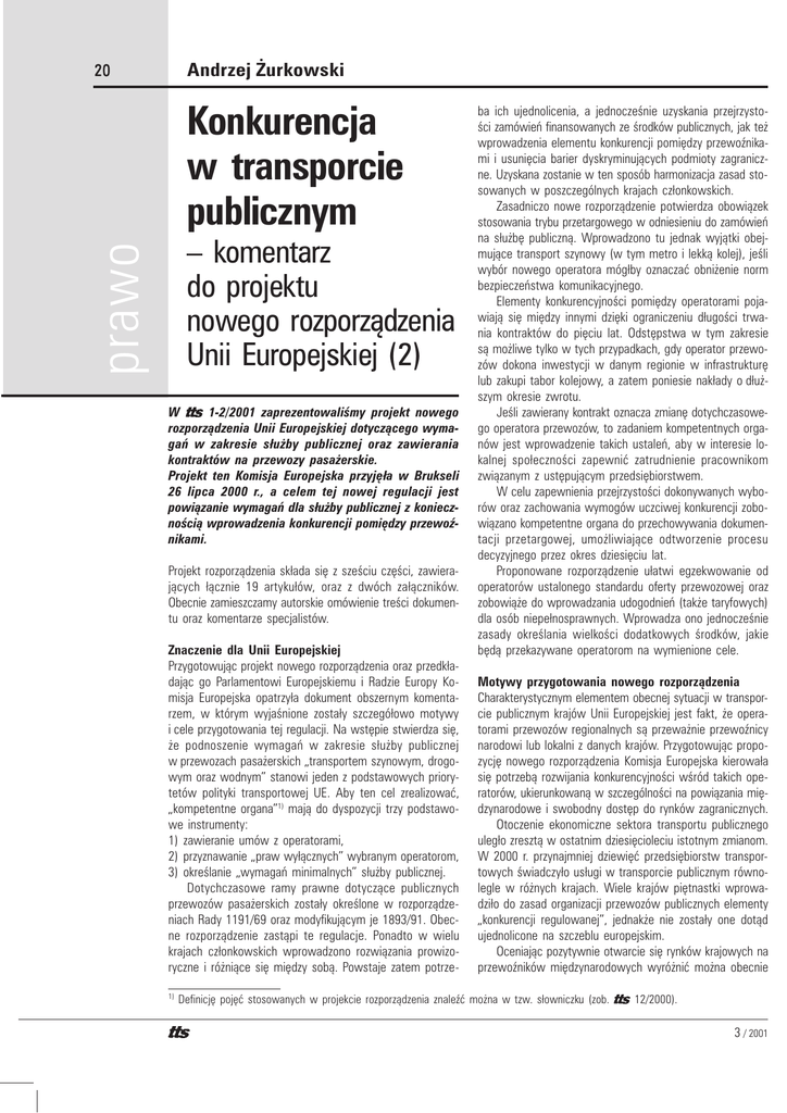 Andrzej ¯urkowski 20 Konkurencja w transporcie publicznym prawo – komentarz do projektu nowego rozporz¹dzenia Unii Europejskiej (2) W 1-2/2001 zaprezentowaliœmy projekt nowego rozporz¹dzenia Unii Europejskiej dotycz¹cego wymagañ w zakresie s³u¿by publicznej oraz zawierania kontraktów na przewozy pasa¿erskie. Projekt ten Komisja Europejska przyjê³a w Brukseli 26 lipca 2000 r., a celem tej nowej regulacji jest powi¹zanie wymagañ dla s³u¿by publicznej z koniecznoœci¹ wprowadzenia konkurencji pomiêdzy przewoŸnikami. Projekt rozporz¹dzenia sk³ada siê z szeœciu czêœci, zawieraj¹cych ³¹cznie 19 artyku³ów, oraz z dwóch za³¹czników. Obecnie zamieszczamy autorskie omówienie treœci dokumentu oraz komentarze specjalistów. Znaczenie dla Unii Europejskiej Przygotowuj¹c projekt nowego rozporz¹dzenia oraz przedk³adaj¹c go Parlamentowi Europejskiemu i Radzie Europy Komisja Europejska opatrzy³a dokument obszernym komentarzem, w którym wyjaœnione zosta³y szczegó³owo motywy i cele przygotowania tej regulacji. Na wstêpie stwierdza siê, ¿e podnoszenie wymagañ w zakresie s³u¿by publicznej w przewozach pasa¿erskich „transportem szynowym, drogowym oraz wodnym” stanowi jeden z podstawowych priorytetów polityki transportowej UE. Aby ten cel zrealizowaæ, „kompetentne organa”1) maj¹ do dyspozycji trzy podstawowe instrumenty: 1) zawieranie umów z operatorami, 2) przyznawanie „praw wy³¹cznych” wybranym operatorom, 3) okreœlanie „wymagañ minimalnych” s³u¿by publicznej. Dotychczasowe ramy prawne dotycz¹ce publicznych przewozów pasa¿erskich zosta³y okreœlone w rozporz¹dzeniach Rady 1191/69 oraz modyfikuj¹cym je 1893/91. Obecne rozporz¹dzenie zast¹pi te regulacje. Ponadto w wielu krajach cz³onkowskich wprowadzono rozwi¹zania prowizoryczne i ró¿ni¹ce siê miêdzy sob¹. Powstaje zatem potrze1) ba ich ujednolicenia, a jednoczeœnie uzyskania przejrzystoœci zamówieñ finansowanych ze œrodków publicznych, jak te¿ wprowadzenia elementu konkurencji pomiêdzy przewoŸnikami i usuniêcia barier dyskryminuj¹cych podmioty zagraniczne. Uzyskana zostanie w ten sposób harmonizacja zasad stosowanych w poszczególnych krajach cz³onkowskich. Zasadniczo nowe rozporz¹dzenie potwierdza obowi¹zek stosowania trybu przetargowego w odniesieniu do zamówieñ na s³u¿bê publiczn¹. Wprowadzono tu jednak wyj¹tki obejmuj¹ce transport szynowy (w tym metro i lekk¹ kolej), jeœli wybór nowego operatora móg³by oznaczaæ obni¿enie norm bezpieczeñstwa komunikacyjnego. Elementy konkurencyjnoœci pomiêdzy operatorami pojawiaj¹ siê miêdzy innymi dziêki ograniczeniu d³ugoœci trwania kontraktów do piêciu lat. Odstêpstwa w tym zakresie s¹ mo¿liwe tylko w tych przypadkach, gdy operator przewozów dokona inwestycji w danym regionie w infrastrukturê lub zakupi tabor kolejowy, a zatem poniesie nak³ady o d³u¿szym okresie zwrotu. Jeœli zawierany kontrakt oznacza zmianê dotychczasowego operatora przewozów, to zadaniem kompetentnych organów jest wprowadzenie takich ustaleñ, aby w interesie lokalnej spo³ecznoœci zapewniæ zatrudnienie pracownikom zwi¹zanym z ustêpuj¹cym przedsiêbiorstwem. W celu zapewnienia przejrzystoœci dokonywanych wyborów oraz zachowania wymogów uczciwej konkurencji zobowi¹zano kompetentne organa do przechowywania dokumentacji przetargowej, umo¿liwiaj¹ce odtworzenie procesu decyzyjnego przez okres dziesiêciu lat. Proponowane rozporz¹dzenie u³atwi egzekwowanie od operatorów ustalonego standardu oferty przewozowej oraz zobowi¹¿e do wprowadzania udogodnieñ (tak¿e taryfowych) dla osób niepe³nosprawnych. Wprowadza ono jednoczeœnie zasady okreœlania wielkoœci dodatkowych œrodków, jakie bêd¹ przekazywane operatorom na wymienione cele. Motywy przygotowania nowego rozporz¹dzenia Charakterystycznym elementem obecnej sytuacji w transporcie publicznym krajów Unii Europejskiej jest fakt, ¿e operatorami przewozów regionalnych s¹ przewa¿nie przewoŸnicy narodowi lub lokalni z danych krajów. Przygotowuj¹c propozycjê nowego rozporz¹dzenia Komisja Europejska kierowa³a siê potrzeb¹ rozwijania konkurencyjnoœci wœród takich operatorów, ukierunkowan¹ w szczególnoœci na powi¹zania miêdzynarodowe i swobodny dostêp do rynków zagranicznych. Otoczenie ekonomiczne sektora transportu publicznego uleg³o zreszt¹ w ostatnim dziesiêcioleciu istotnym zmianom. W 2000 r. przynajmniej dziewiêæ przedsiêbiorstw transportowych œwiadczy³o us³ugi w transporcie publicznym równolegle w ró¿nych krajach. Wiele krajów piêtnastki wprowadzi³o do zasad organizacji przewozów publicznych elementy „konkurencji regulowanej”, jednak¿e nie zosta³y one dot¹d ujednolicone na szczeblu europejskim. Oceniaj¹c pozytywnie otwarcie siê rynków krajowych na przewoŸników miêdzynarodowych wyró¿niæ mo¿na obecnie Definicjê pojêæ stosowanych w projekcie rozporz¹dzenia znaleŸæ mo¿na w tzw. s³owniczku (zob. 12/2000). 3 / 2001 21 trzy typy strategii stosownych przez poszczególne kraje (regiony) w zakresie regulowania zagadnieñ transportu publicznego: rynki zamkniête – operatorzy lokalni s¹ chronieni prawami wy³¹cznoœci na œwiadczenie us³ug, rynki regulowane – operatorzy otrzymuj¹ prawa wy³¹czne przyznawane tylko na pewien okres i podlegaj¹ zasadom przetargów na œwiadczenie us³ug, rynki deregulowane – ca³kowity brak praw wy³¹cznych. Przeprowadzone badania kosztów jednostkowych przewozów pokazuj¹, ¿e w przypadku rynków zamkniêtych przewy¿szaj¹ one dwukrotnie koszty generowane przez przewoŸników na rynkach deregulowanych. Z kolei wprowadzenie zasad konkurencji regulowanej pozwala zarówno obni¿aæ koszty, jak te¿ skutecznie kontrolowaæ i podnosiæ jakoœæ œwiadczonych us³ug. Zastosowanie takich zasad okreœlone zosta³o jako realne i najlepiej dostosowane do obecnej rzeczywistoœci. Jest ono jednoczeœnie zgodne z rozwi¹zaniami dotycz¹cymi liberalizacji 