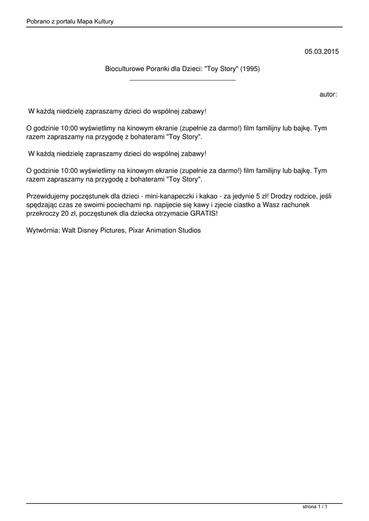 Pobrano z portalu Mapa Kultury 05.03.2015 Bioculturowe Poranki dla Dzieci: "Toy Story" (1995) ____________________________ autor: W każdą niedzielę zapraszamy dzieci do wspólnej zabawy! O godzinie 10:00 wyświetlimy na kinowym ekranie (zupełnie za darmo!) film familijny lub bajkę. Tym razem zapraszamy na przygodę z bohaterami "Toy Story". W każdą niedzielę zapraszamy dzieci do wspólnej zabawy! O godzinie 10:00 wyświetlimy na kinowym ekranie (zupełnie za darmo!) film familijny lub bajkę. Tym razem zapraszamy na przygodę z bohaterami "Toy Story". Przewidujemy poczęstunek dla dzieci - mini-kanapeczki i kakao - za jedynie 5 zł! Drodzy rodzice, jeśli spędzając czas ze swoimi pociechami np. napijecie się kawy i zjecie ciastko a Wasz rachunek przekroczy 20 zł, poczęstunek dla dziecka otrzymacie GRATIS! Wytwórnia: Walt Disney Pictures, Pixar Animation Studios strona 1 / 1