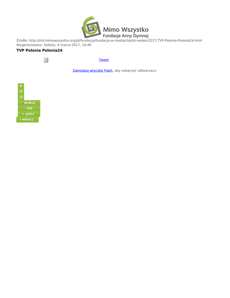 Źródło: http://old.mimowszystko.org/pl/fundacja/fundacja-w-mediach/pliki-wideo/2227,TVP-Polonia-Polonia24.html Wygenerowano: Sobota, 4 marca 2017, 10:49 TVP Polonia Polonia24 Tweet Zainstaluj wtyczkę Flash, aby zobaczyć odtwarzacz.