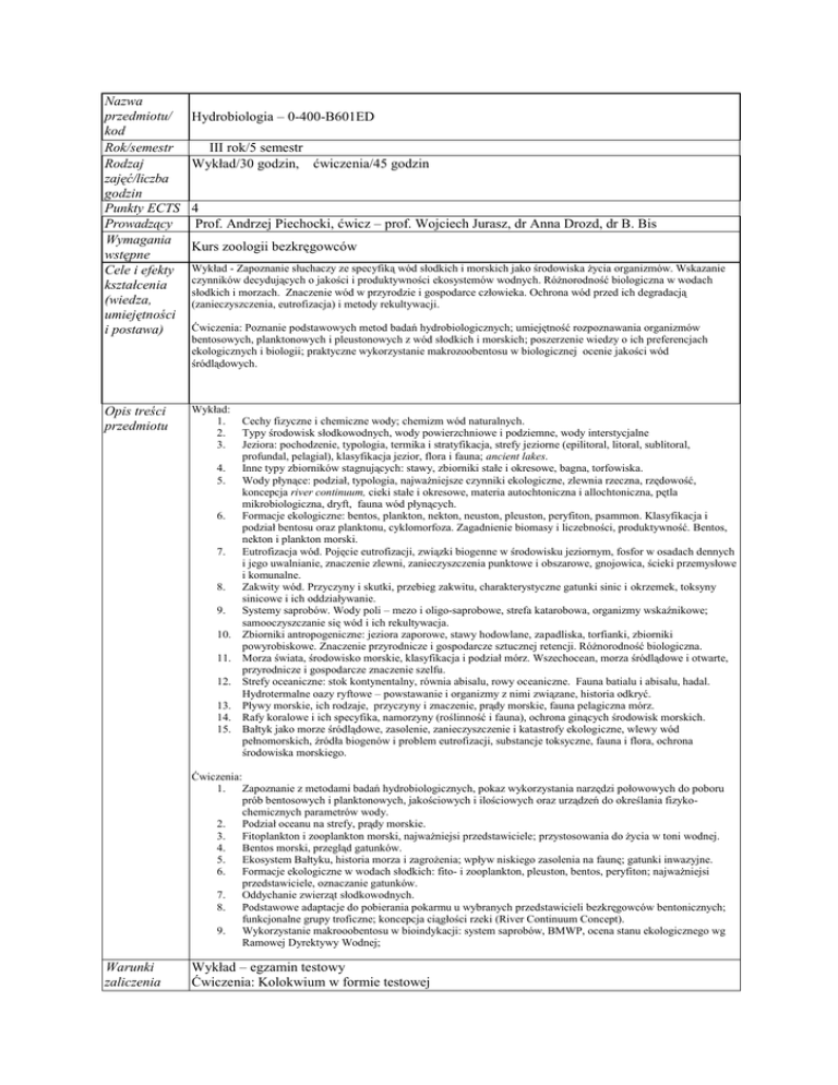 Nazwa przedmiotu/ kod Rok/semestr Rodzaj zajęć/liczba godzin Punkty ECTS Prowadzący Wymagania wstępne Cele i efekty kształcenia (wiedza, umiejętności i postawa) Opis treści przedmiotu Hydrobiologia – 0-400-B601ED III rok/5 semestr Wykład/30 godzin, ćwiczenia/45 godzin 4 Prof. Andrzej Piechocki, ćwicz – prof. Wojciech Jurasz, dr Anna Drozd, dr B. Bis Kurs zoologii bezkręgowców Wykład - Zapoznanie słuchaczy ze specyfiką wód słodkich i morskich jako środowiska życia organizmów. Wskazanie czynników decydujących o jakości i produktywności ekosystemów wodnych. Różnorodność biologiczna w wodach słodkich i morzach. Znaczenie wód w przyrodzie i gospodarce człowieka. Ochrona wód przed ich degradacją (zanieczyszczenia, eutrofizacja) i metody rekultywacji. Ćwiczenia: Poznanie podstawowych metod badań hydrobiologicznych; umiejętność rozpoznawania organizmów bentosowych, planktonowych i pleustonowych z wód słodkich i morskich; poszerzenie wiedzy o ich preferencjach ekologicznych i biologii; praktyczne wykorzystanie makrozoobentosu w biologicznej ocenie jakości wód śródlądowych. Wykład: 1. 2. 3. 4. 5. 6. 7. 8. 9. 10. 11. 12. 13. 14. 15. Cechy fizyczne i chemiczne wody; chemizm wód naturalnych. Typy środowisk słodkowodnych, wody powierzchniowe i podziemne, wody interstycjalne Jeziora: pochodzenie, typologia, termika i stratyfikacja, strefy jeziorne (epilitoral, litoral, sublitoral, profundal, pelagial), klasyfikacja jezior, flora i fauna; ancient lakes. Inne typy zbiorników stagnujących: stawy, zbiorniki stałe i okresowe, bagna, torfowiska. Wody płynące: podział, typologia, najważniejsze czynniki ekologiczne, zlewnia rzeczna, rzędowość, koncepcja river continuum, cieki stałe i okresowe, materia autochtoniczna i allochtoniczna, pętla mikrobiologiczna, dryft, fauna wód płynących. Formacje ekologiczne: bentos, plankton, nekton, neuston, pleuston, peryfiton, psammon. Klasyfikacja i podział bentosu oraz planktonu, cyklomorfoza. Zagadnienie biomasy i liczebności, produktywność. Bentos, nekton i plankton morski. Eutrofizacja wód. Pojęcie eutrofizacji, związki biogenne w środowisku jeziornym, fosfor w osadach dennych i jego uwalnianie, znaczenie zlewni, zanieczyszczenia punktowe i obszarowe, gnojowica, ścieki przemysłowe i komunalne. Zakwity wód. Przyczyny i skutki, przebieg zakwitu, charakterystyczne gatunki sinic i okrzemek, toksyny sinicowe i ich oddziaływanie. Systemy saprobów. Wody poli – mezo i oligo-saprobowe, strefa katarobowa, organizmy wskaźnikowe; samooczyszczanie się wód i ich rekultywacja. Zbiorniki antropogeniczne: jeziora zaporowe, stawy hodowlane, zapadliska, torfianki, zbiorniki powyrobiskowe. Znaczenie przyrodnicze i gospodarcze sztucznej retencji. Różnorodność biologiczna. Morza świata, środowisko morskie, klasyfikacja i podział mórz. Wszechocean, morza śródlądowe i otwarte, przyrodnicze i gospodarcze znaczenie szelfu. Strefy oceaniczne: stok kontynentalny, równia abisalu, rowy oceaniczne. Fauna batialu i abisalu, hadal. Hydrotermalne oazy ryftowe – powstawanie i organizmy z nimi związane, historia odkryć. Pływy morskie, ich rodzaje, przyczyny i znaczenie, prądy morskie, fauna pelagiczna mórz. Rafy koralowe i ich specyfika, namorzyny (roślinność i fauna), ochrona ginących środowisk morskich. Bałtyk jako morze śródlądowe, zasolenie, zanieczyszczenie i katastrofy ekologiczne, wlewy wód pełnomorskich, źródła biogenów i problem eutrofizacji, substancje toksyczne, fauna i flora, ochrona środowiska morskiego. Ćwiczenia: 1. Zapoznanie z metodami badań hydrobiologicznych, pokaz wykorzystania narzędzi połowowych do poboru prób bentosowych i planktonowych, jakościowych i ilościowych oraz urządzeń do określania fizykochemicznych parametrów wody. 2. Podział oceanu na strefy, prądy morskie. 3. Fitoplankton i zooplankton morski, najważniejsi przedstawiciele; przystosowania do życia w toni wodnej. 4. Bentos morski, przegląd gatunków. 5. Ekosystem Bałtyku, historia morza i zagrożenia; wpływ niskiego zasolenia na faunę; gatunki inwazyjne. 6. Formacje ekologiczne w wodach słodkich: fito- i zooplankton, pleuston, bentos, peryfiton; najważniejsi przedstawiciele, oznaczanie gatunków. 7. Oddychanie zwierząt słodkowodnych. 8. Podstawowe adaptacje do pobierania pokarmu u wybranych przedstawicieli bezkręgowców bentonicznych; funkcjonalne grupy troficzne; koncepcja ciągłości rzeki (River Continuum Concept). 9. Wykorzystanie makrooobentosu w bioindykacji: system saprobów, BMWP, ocena stanu ekologicznego wg Ramowej Dyrektywy Wodnej; Warunki zaliczenia Wykład – egzamin testowy Ćwiczenia: Kolokwium w formie testowej Zalecana lista Wykład i ćwiczenia: lektur Duxbury A. C., Duxbury A. B., Sverdrup K. A. 2002. Oceany Świata. PWN Warszawa Żmudziński L. 2002. Słownik hydrobiologiczny. Terminy, pojecia , interpretacje. PWN Warszawa Lampert W., Sommer U. 2001. Ekologia wód śródlądowych PWN Warszawa. Kajak Z. 2001. Hydrobiologia-Limnologia. Ekosystemy wód śródlądowych. PWN Warszawa Wetzel R.G. 2001. Limnology. Lake and River Ecosystems. Academic Press. San diego. Brönmark Ch., Jansson L.-A. 2001. The Biology of Lakes and Ponds. Oxford University Press. Oxford Allan J.D. 1998. Ekologia wód płynących. PWN Warszawa Giller P.S., Malmqvist B. 1998. The Biology of Streams and Rivers. Oxford University Press. Ozford New York Toronto. Szymelfenig M., Urbański J. 1998. Morze Bałtyckie – o tym warto wiedzieć. Polski Klub Ekologiczny, Gdańsk Wetzel R.G., Likens G.E. 1991. Limnological Analyses. Springer New York. Umiński T. 1986. Zwierzęta i oceany. Popularna zoogeografia wód morskich. Wyd. Szkolne i Pedagogiczne. Warszawa Mikulski J. St. 1982. Biologia wód śródlądowych. PWN Warszawa Stańczykowska A.. 1979. Zwierzęta bezkręgowe naszych wód. Wyd. Szkolne i Pedagogiczne. Warszawa Starmach K., Wróbel S., Pasternak K. 1978. Hydrobiologia. Limnologia. P