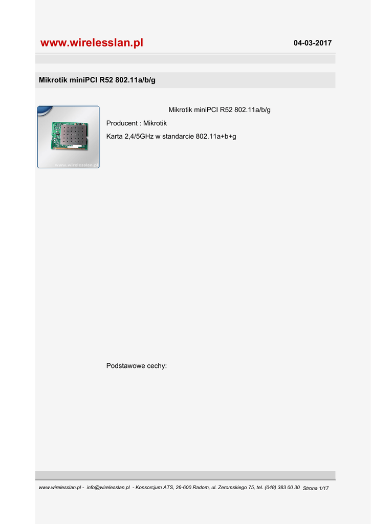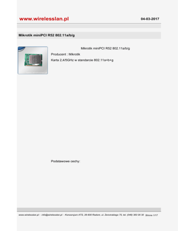 www.wirelesslan.pl 04-03-2017 Mikrotik miniPCI R52 802.11a/b/g Mikrotik miniPCI R52 802.11a/b/g Producent : Mikrotik Karta 2,4/5GHz w standarcie 802.11a+b+g Podstawowe cechy: www.wirelesslan.pl - [email protected] - Konsorcjum ATS, 26-600 Radom, ul. Zeromskiego 75, tel. (048) 383 00 30 Strona 1/17 www.wirelesslan.pl 04-03-2017 Turbo, 802.11a, 802.11b/g w jednej karcie www.wirelesslan.pl - [email protected] - Konsorcjum ATS, 26-600 Radom, ul. Zeromskiego 75, tel. (048) 383 00 30 Strona 2/17 www.wirelesslan.pl 04-03-2017 Pracuje w obu 2.4 and 5Ghz pasmach www.wirelesslan.pl - [email protected] - Konsorcjum ATS, 26-600 Radom, ul. Zeromskiego 75, tel. (048) 383 00 30 Strona 3/17 www.wirelesslan.pl 04-03-2017 Obsluguje tryb Mikrotik Nstreme Zgodna z CE i FCC www.wirelesslan.pl - [email protected] - Konsorcjum ATS, 26-600 Radom, ul. Zeromskiego 75, tel. (048) 383 00 30 Strona 4/17 www.wirelesslan.pl 04-03-2017 Karta przeznaczona przede wszytkim do pracy na plytach Routerboarda (wyprodukowanych po 2004r) z szybkimi aplikacjami . Pracuje w zakresie 2.192-2.539 oraz 4.920-6.100GHz i obsluguje tryb Turbo. www.wirelesslan.pl - [email protected] - Konsorcjum ATS, 26-600 Radom, ul. Zeromskiego 75, tel. (048) 383 00 30 Strona 5/17 www.wirelesslan.pl 04-03-2017 Dane techniczne: www.wirelesslan.pl - [email protected] - Konsorcjum ATS, 26-600 Radom, ul. Zeromskiego 75, tel. (048) 383 00 30 Strona 6/17 www.wirelesslan.pl 04-03-2017 Chipset: Atheros AR5414 www.wirelesslan.pl - [email protected] - Konsorcjum ATS, 26-600 Radom, ul. Zeromskiego 75, tel. (048) 383 00 30 Strona 7/17 www.wirelesslan.pl 04-03-2017 Standards: IEEE802.11a/b/g Media Access: CSMA/CA with ACK architecture 32-bit MAC www.wirelesslan.pl - [email protected] - Konsorcjum ATS, 26-600 Radom, ul. Zeromskiego 75, tel. (048) 383 00 30 Strona 8/17 www.wirelesslan.pl 04-03-2017 Security: 64/128bit WEP, TKIP and AES-CCM encryption, WPA,WPA2, 802.1x Modulation: 802.11b+g DSSS, OFDM for data rate >30Mb and for 802.11a www.wirelesslan.pl - [email protected] - Konsorcjum ATS, 26-600 Radom, ul. Zeromskiego 75, tel. (048) 383 00 30 Strona 9/17 www.wirelesslan.pl 04-03-2017 Interface: Mini-PCI form ver1.0 type 3B www.wirelesslan.pl - [email protected] - Konsorcjum ATS, 26-600 Radom, ul. Zeromskiego 75, tel. (048) 383 00 30 Strona 10/17 www.wirelesslan.pl 04-03-2017 Connectors: 2x uFl Powering: 3.3V +/-10%, 400mA max, www.wirelesslan.pl - [email protected] - Konsorcjum ATS, 26-600 Radom, ul. Zeromskiego 75, tel. (048) 383 00 30 Strona 11/17 www.wirelesslan.pl 04-03-2017 Frequencies: 2.192-2.539 and 4.920-6.100GHz Output Power/Sensitivity: www.wirelesslan.pl - [email protected] - Konsorcjum ATS, 26-600 Radom, ul. Zeromskiego 75, tel. (048) 383 00 30 Strona 12/17 www.wirelesslan.pl 04-03-2017 802.11a - 17dBm/-88dBm@6Mbps, 13dBm/-71dBm@54Mbps 802.11b - 19dBm/-95dbm@1Mbps, 19dBm/-90dBm@11Mbps www.wirelesslan.pl - [email protected] - Konsorcjum ATS, 26-600 Radom, ul. Zeromskiego 75, tel. (048) 383 00 30 Strona 13/17 www.wirelesslan.pl 04-03-2017 802.11g - 18dBm/-90dBm@6Mbps, 15dBm/-703Bm@54Mbps www.wirelesslan.pl - [email protected] - Konsorcjum ATS, 26-600 Radom, ul. Zeromskiego 75, tel. (048) 383 00 30 Strona 14/17 www.wirelesslan.pl 04-03-2017 Suported OS: Mikrotik RouterOS, Windows XP, Linux Operating Temp: 0 to 70C www.wirelesslan.pl - [email protected] - Konsorcjum ATS, 26-600 Radom, ul. Zeromskiego 75, tel. (048) 383 00 30 Strona 15/17 www.wirelesslan.pl 04-03-2017 Storage Temp.: -40 to 100C Humidity range: 5% tp 95 % non condensing www.wirelesslan.pl - [email protected] - Konsorcjum ATS, 26-600 Radom, ul. Zeromskiego 75, tel. (048) 383 00 30 Strona 16/17 www.wirelesslan.pl 04-03-2017 Dimensions: 6cmx4,5cm Weight: 20g www.wirelesslan.pl - [email protected] - Konsorcjum ATS, 26-600 Radom, ul. Zeromskiego 75, tel. (048) 383 00 30 Strona 17/17