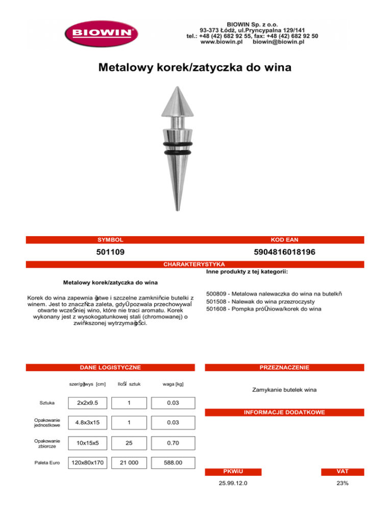 Metalowy korek/zatyczka do wina SYMBOL KOD EAN 501109 5904816018196 CHARAKTERYSTYKA Inne produkty z tej kategorii: Metalowy korek/zatyczka do wina Korek do wina zapewnia łatwe i szczelne zamknięcie butelki z winem. Jest to znacząca zaleta, gdyż pozwala przechowywać otwarte wcześniej wino, które nie traci aromatu. Korek wykonany jest z wysokogatunkowej stali (chromowanej) o zwiększonej wytrzymałości. 500809 - Metalowa nalewaczka do wina na butelkę 501508 - Nalewak do wina przezroczysty 501608 - Pompka próżniowa/korek do wina DANE LOGISTYCZNE szer/gł/wys [cm] Ilość sztuk PRZEZNACZENIE waga [kg] Zamykanie butelek wina Sztuka 2x2x9.5 1 0.03 INFORMACJE DODATKOWE Opakowanie jednostkowe 4.8x3x15 1 0.03 Opakowanie zbiorcze 10x15x5 25 0.70 Paleta Euro 120x80x170 21 000 588.00 PKWiU VAT 25.99.12.0 23%