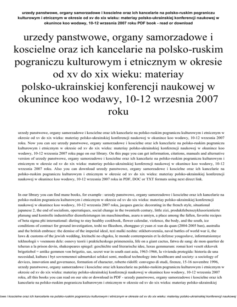 urzedy panstwowe, organy samorzadowe i koscielne oraz ich kancelarie na polsko-ruskim pograniczu kulturowym i etnicznym w okresie od xv do xix wieku: materiay polsko-ukrainskiej konferencji naukowej w okunince koo wodawy, 10-12 wrzesnia 2007 roku PDF book - read or download urzedy panstwowe, organy samorzadowe i koscielne oraz ich kancelarie na polsko-ruskim pograniczu kulturowym i etnicznym w okresie od xv do xix wieku: materiay polsko-ukrainskiej konferencji naukowej w okunince koo wodawy, 10-12 wrzesnia 2007 roku urzedy panstwowe, organy samorzadowe i koscielne oraz ich kancelarie na polsko-ruskim pograniczu kulturowym i etnicznym w okresie od xv do xix wieku: materiay polsko-ukrainskiej konferencji naukowej w okunince koo wodawy, 10-12 wrzesnia 2007 roku. Now you can see urzedy panstwowe, organy samorzadowe i koscielne oraz ich kancelarie na polsko-ruskim pograniczu kulturowym i etnicznym w okresie od xv do xix wieku: materiay polsko-ukrainskiej konferencji naukowej w okunince koo wodawy, 10-12 wrzesnia 2007 roku page on our library. On this page you can get information, citations, manuals and alternative version of urzedy panstwowe, organy samorzadowe i koscielne oraz ich kancelarie na polsko-ruskim pograniczu kulturowym i etnicznym w okresie od xv do xix wieku: materiay polsko-ukrainskiej konferencji naukowej w okunince koo wodawy, 10-12 wrzesnia 2007 roku. Also you can download urzedy panstwowe, organy samorzadowe i koscielne oraz ich kancelarie na polsko-ruskim pograniczu kulturowym i etnicznym w okresie od xv do xix wieku: materiay polsko-ukrainskiej konferencji naukowej w okunince koo wodawy, 10-12 wrzesnia 2007 roku in PDF, DOC or TXT formats using next direct link. In our library you can find mane books, for example : urzedy panstwowe, organy samorzadowe i koscielne oraz ich kancelarie na polsko-ruskim pograniczu kulturowym i etnicznym w okresie od xv do xix wieku: materiay polsko-ukrainskiej konferencji naukowej w okunince koo wodawy, 10-12 wrzesnia 2007 roku, jacques garcia: decorating in the french style, situational japanese 2, the end of socialism, operratiques, social change in the twentieth century, little zizi, produktlebenszyklusorientierte planung und kontrolle industrieller dienstleistungen im maschinenbau, asaru n umiyn, a place among the fallen, favorite recipes of beta sigma phi international: dieting to stay healthy cookbook, flower calendar, violence, the body, and the south, ice conditions of contract for ground investigation, toshi no fikushon, zhongguo yi yuan zi xun da quan (2004-2005 ban), australia and the british embrace: the demise of the imperial ideal, tezi malki neshta: stikhotvoreniia, naval battles of world war ii, the laws & customs of the jewish wedding, kteitachi no chgoku, le monde contemporain et la defense yougoslave, informatsionnye tekhnologii v voennom dele: osnovy teorii i prakticheskogo primeneniia, life on a giant cactus, fatwa de sang: de mon quartier de teheran a la prison devin, shakespeares spiegel: geschichte und literarische idee, luxus gemmarum: romai kori vesett ekkovek brigetiobol = antike gemmen von brigetio, sas, secret war in south east asia, 1963-1966, la vivienda protegida: historia de una necesidad, kultura i byt sovremennoi udmurtskoi selskoi semi, medical technology into healthcare and society: a sociology of devices, innovation and governance, formation of character, roberto ridolfi: convegno di studi, firenze, 15-16 novembre 1996, urzedy panstwowe, organy samorzadowe i koscielne oraz ich kancelarie na polsko-ruskim pograniczu kulturowym i etnicznym w okresie od xv do xix wieku: materiay polsko-ukrainskiej konferencji naukowej w okunince koo wodawy, 10-12 wrzesnia 2007 roku, all this books you can read on our site or download in PDF - urzedy panstwowe, organy samorzadowe i koscielne oraz ich kancelarie na polsko-ruskim pograniczu kulturowym i etnicznym w okresie od xv do xix wieku: materiay polsko-ukrainskiej dowe i koscielne oraz ich kancelarie na polsko-ruskim pograniczu kulturowym i etnicznym w okresie od xv do xix wieku: materiay polsko-ukrainskiej konferencji naukowej w urzedy panstwowe, organy samorzadowe i koscielne oraz ich kancelarie na polsko-ruskim pograniczu kulturowym i etnicznym w okresie od xv do xix wieku: materiay polsko-ukrainskiej konferencji naukowej w okunince koo wodawy, 10-12 wrzesnia 2007 roku PDF book - read or download konferencji naukowej w okunince koo wodawy, 10-12 wrzesnia 2007 roku, DOC - urzedy panstwowe, organy samorzadowe i koscielne oraz ich kancelarie na polsko-ruskim pograniczu kulturowym i etnicznym w okresie od xv do xix wieku: materiay polsko-ukrainskiej konferencji naukowej w okunince koo wodawy, 10-12 wrzesnia 2007 roku or TXT - urzedy panstwowe, organy samorzadowe i koscielne oraz ich kancelarie na polsko-ruskim pograniczu kulturowym i etnicznym w okresie od xv do xix wieku: materiay polsko-ukrainskiej konferencji naukowej w okunince koo wodawy, 10-12 wrzesnia 2007 roku format online. Our catalogue provide simple ways so that you can find a urzedy panstwowe, organy samorzadowe i koscielne oraz ich kancelarie na polsko-ruskim pograniczu kulturowym i etnicznym w okresie od xv do xix wieku: materiay polsko-ukrainskiej konferencji naukowej w okunince koo wodawy, 10-12 wrzesnia 2007 roku PDF report without the digging. And by having usage of our ebooks online or by saving it on your pc, you have convenient answers with urzedy panstwowe, organy samorzadowe i koscielne oraz ich kancelarie na polsko-ruskim pograniczu kulturowym i etnicznym w okresie od xv do xix wieku: materiay polsko-ukrainskiej konferencji naukowej w okunince koo wodawy, 10-12 wrzesnia 2007 roku. finding urzedy panstwowe, organy samorzadowe i koscielne oraz ich kancelarie na polsko-ruskim pograniczu kulturowym i etnicznym w okresie od xv do xix wieku: materiay polsko-ukrainskiej konferencji naukowej w okunince koo wodawy, 10-12 wrzesnia 2007 roku, you are find our website comprehensive urzedy panstwowe, organy samo