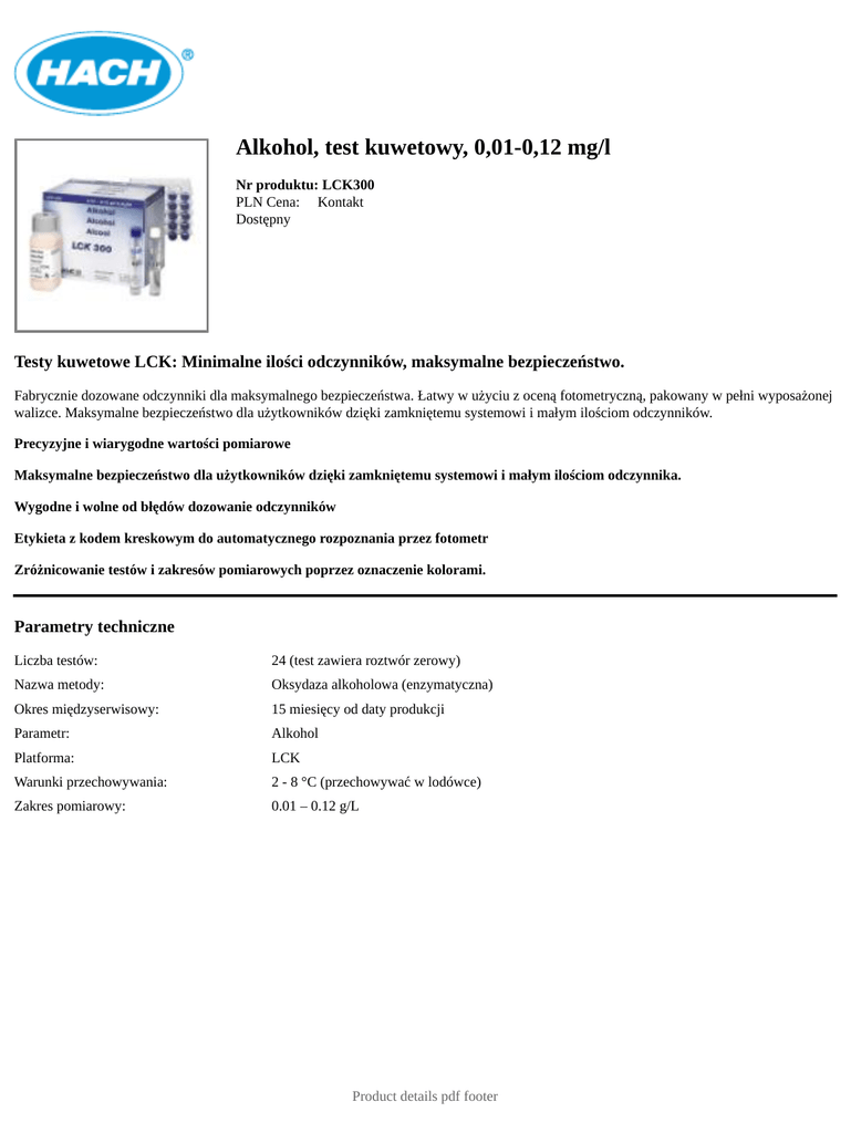 Alkohol, test kuwetowy, 0,01-0,12 mg/l Nr produktu: LCK300 PLN Cena: Kontakt Dostępny Testy kuwetowe LCK: Minimalne ilości odczynników, maksymalne bezpieczeństwo. Fabrycznie dozowane odczynniki dla maksymalnego bezpieczeństwa. Łatwy w użyciu z oceną fotometryczną, pakowany w pełni wyposażonej walizce. Maksymalne bezpieczeństwo dla użytkowników dzięki zamkniętemu systemowi i małym ilościom odczynników. Precyzyjne i wiarygodne wartości pomiarowe Maksymalne bezpieczeństwo dla użytkowników dzięki zamkniętemu systemowi i małym ilościom odczynnika. Wygodne i wolne od błędów dozowanie odczynników Etykieta z kodem kreskowym do automatycznego rozpoznania przez fotometr Zróżnicowanie testów i zakresów pomiarowych poprzez oznaczenie kolorami. Parametry techniczne Liczba testów: 24 (test zawiera roztwór zerowy) Nazwa metody: Oksydaza alkoholowa (enzymatyczna) Okres międzyserwisowy: 15 miesięcy od daty produkcji Parametr: Alkohol Platforma: LCK Warunki przechowywania: 2 - 8 °C (przechowywać w lodówce) Zakres pomiarowy: 0.01 – 0.12 g/L Product details pdf footer