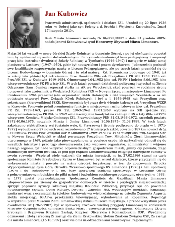 Jan Kubowicz Pracownik administracji, społecznik i działacz ZSL. Urodził się 20 lipca 1926 roku w Dobrej jako syn Heleny z d. Drożdż i Wojciecha Kubowiczów. Zmarł 17 listopada 2010r. Rada Miasta Limanowa uchwałą Nr XL/293/2009 z dnia 30 grudnia 2009r. nadała Janowi Kubowiczowi tytuł Honorowy Obywatel Miasta Limanowa. Mając 16 lat wstąpił w mury Górskiej Szkoły Rolniczej w Łososinie Górnej, a po jej ukończeniu pozostał tam, by opiekować się sadem doświadczalnym. Po wyzwoleniu ukończył kurs pedagogiczny i rozpoczął pracę jako instruktor dwuletniej Szkoły Rolniczej w Tymbarku (1946-1947) i następnie w takiej samej placówce w Laskowej (1947-1950), gdzie był nauczycielem i potem dyrektorem. Jednocześnie podnosił swe kwalifikacje rozpoczynając naukę w Liceum Pedagogicznym, ale po trzech latach przeniósł się do Liceum Hodowlanego w Łososinie Górnej i tu zdał maturę. Czł. Stronnictwa Ludowego od 1947, już w cztery lata później był sekretarzem Pow. Komitetu ZSL, czł. Prezydium i PK ZSL 1950–1954, czł. Prez.WK ZSL w Krakowie 1949-1954. Odnotowany 9.04.1952 jako czł. PK FN i kolejno 8.06.1953 jako wiceprzewodniczący PK FN z listy ZSL. W tych latach porzucił działalność polityczną i wyjechał na Ziemie Odzyskane (tam również rozpoczął studia na AR we Wrocławiu), skąd powrócił w rodzinne strony i pracował jako zootechnik w Wydziałach Rolnictwa PRN w Nowym Sączu, a następnie w Limanowej. Po Październiku 1956 pracował jako organizator Kółek Rolniczych i Kół Gospodyń Wiejskich, a na ich podstawie utworzył Pow. Związek Kółek Rolniczych i był w l. 1956-1968 czł. Prezydium oraz sekretarzem (kierownikiem) PZKR. Równocześnie był przez dwie 4-letnie kadencje czł. Prezydium WZKR w Krakowie. Ponownie pełnił prominentne funkcje w miejscowym ruchu ludowym jako czł. Prezydium PK ZSL 1959-1963, prezes PK ZSL 1963-1969, 19.01.1969 wybrany na XIII zjeździe ZSL wiceprzewodniczącym PK ZSL, w 1969 odnotowany jako kandydat na radnego PRN z listy ZSL; od 1975 wiceprezes Komitetu Miejsko-Gminnego ZSL. Przewodniczący PRN 31.03.1968-1972, naczelnik powiatu 1972-30.06.1975, naczelnik Miasta i Gminy Limanowej 30.06.1975- 31.03.1989. W tych latach zakończono elektryfikację wsi (ostatnie wsie, tj. Przyszową i Stronie podłączono do prądu w l. 19711972), wybudowano 27 nowych oraz rozbudowano 17 istniejących szkół; powstało 187 km nowych dróg i 56 mostów. Prezes Pow. Związku OSP w Limanowej 1969-1975 i w 1975 wiceprezes Woj. Związku OSP w Nowym Sączu. Wchodził w skład pierwszego Prezydium Tow. Miłośników Ziemi Limanowskiej, utworzonego w 1969, później jako pierwszoplanowa w powiecie osoba jak najżyczliwiej odnosił się do wszelkich inicjatyw i prac tego stowarzyszenia. Jako wzorowy organizator, administrator i wizjoner naszego regionu, był nade wszystko odpowiedzialnym gospodarzem miasta, gminy czy powiatu, czego znamiennym dowodem jest fakt, że pod jego rządami Limanowszczyzna osiągnęła największe sukcesy w swoim rozwoju . Wspierał wiele ważnych dla miasta inwestycji, m. in. 27.02.1969 stanął na czele społecznego Komitetu Przebudowy Rynku w Limanowej; był wśród działaczy, którzy przyczynili się do wykreowania miasta i powiatu na ważny ośrodek turystyczny, w tym do zbudowania Ośrodka Wypoczynkowego Łysa Góra, Ośrodka Wczasowo-Sportowego KS Limanovia (1970) i hali sportowej (1974) i do rozbudowy w l. 80. bazy sportowej: stadionu sportowego w Łososinie Górnej z pełnowymiarowym boiskiem do piłki nożnej i budynkiem socjalno-gospodarczym, otwartych w 1988; w 1973 został przewodniczącym Społecznego Komitetu ds. Gazyfikacji Miasta Limanowa (doprowadzono gaz ziemny do gospodarstw domowych w mieście i przyległych miejscowościach), sprzyjał poprawie sytuacji lokalowej Miejskiej Biblioteki Publicznej, przyłożył ręki do powstania nowoczesnego szpitala, Domu Kultury, Dworca i Zajezdni PKS, wodociągów miejskich, kanalizacji sanitarnej wraz z oczyszczalnią ścieków, budownictwa wielorodzinnego na osiedlu Zygmunta Augusta, żłobka miejskiego, KFAP-u, przekaźnika telewizyjnego, wybudowania ul. Kopernika. Dopomógł w uzyskaniu przez Muzeum Ziemi Limanowskiej statusu muzeum miejskiego, a przede wszystkim przez dwadzieścia lat (1967-1987) był w sprawczej czołówce wielkiej przygody Limanowej w konkursach Mistrzów Gospodarności, turniejach Banku Miast i estetyzacji naszego regionu. Odznaczony Złotym, Srebrnym i Brązowym Krzyżem Zasługi; Krzyżem Oficerskim i Komandorskim OOP. Wyróżniony odznakami : złotą i srebrną Za zasługi dla Ziemi Krakowskiej, Złotym Znakiem Związku OSP, Za zasługi dla miasta Limanowej (16.10.1997) oraz wieloma in. odznaczeniami branżowymi i regionalnymi.