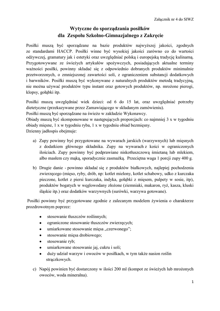 Załącznik nr 4 do SIWZ Wytyczne do sporządzania posiłków dla Zespołu Szkolno-Gimnazjalnego z Zakręcie Posiłki muszą być sporządzane na bazie produktów najwyższej jakości, zgodnych ze standardami HACCP. Posiłki winne być wysokiej jakości zarówno co do wartości odżywczej, gramatury jak i estetyki oraz uwzględniać polską i europejską tradycję kulinarną. Przygotowywane ze świeżych artykułów spożywczych, posiadających aktualne terminy ważności posiłki, powinny składać się z odpowiednio dobranych produktów minimalnie przetworzonych, o zmniejszonej zawartości soli, z ograniczeniem substancji dodatkowych i barwników. Posiłki muszą być wykonywane z naturalnych produktów metodą tradycyjną, nie można używać produktów typu instant oraz gotowych produktów, np. mrożone pierogi, klopsy, gołąbki itp. Posiłki muszą uwzględniać wiek dzieci: od 6 do 15 lat, oraz uwzględniać potrzeby dietetyczne (przekazywane przez Zamawiającego w składanym zamówieniu). Posiłki muszą być sporządzane na świeżo w zakładzie Wykonawcy. Obiady muszą być skomponowane w następujących proporcjach: co najmniej 3 x w tygodniu obiady mięsne, 1 x w tygodniu ryba, 1 x w tygodniu obiad bezmięsny. Dzienny jadłospis obejmuje: a) Zupy powinny być przygotowane na wywarach jarskich (warzywnych) lub mięsnych z dodatkiem głównego składnika. Zupy na wywarach z kości w ograniczonych ilościach. Zupy powinny być podprawiane niskotłuszczową śmietaną lub mlekiem, albo masłem czy mąką, sporadycznie zasmażką. Przeciętna waga 1 porcji zupy 400 g. b) Drugie danie - powinno składać się z produktów białkowych, najlepiej pochodzenia zwierzęcego (mięso, ryby, drób, np: kotlet mielony, kotlet schabowy, udko z kurczaka pieczone, kotlet z piersi kurczaka, indyka, gołąbki z mięsem, pulpety w sosie, itp), produktów bogatych w węglowodany złożone (ziemniaki, makaron, ryż, kasza, kluski śląskie itp.) oraz dodatków warzywnych (surówki, warzywa gotowane). Posiłki powinny być przygotowane zgodnie z zalecanym modelem żywienia o charakterze prozdrowotnym poprzez: stosowanie tłuszczów roślinnych; ograniczone stosowanie tłuszczów zwierzęcych; umiarkowane stosowanie mięsa „czerwonego”; stosowanie mięsa drobiowego; stosowanie ryb; umiarkowane stosowanie jaj, cukru i soli; duży udział warzyw i owoców w posiłkach, w tym także nasion roślin strączkowych. c) Napój powinien być dostarczony w ilości 200 ml (kompot ze świeżych lub mrożonych owoców, woda mineralna). 1 Pozostałe wytyczne składnikowe: Prawidłowo zbilansowany i zaplanowany obiad, powinien dostarczać 30% całodziennego zapotrzebowania energetycznego i odpowiadać następującym założeniom: a) Obiad powinien składać się z: zupy, dania głównego oraz napoju. b) Udział energii z poszczególnych substancji odżywczych powinien wynosić: z białka co najmniej 10-14%, przy czym udział białka zwierzęcego powinien wynosić co najmniej połowę całkowitej puli białka posiłku, z węglowodanów 50-65%, w tym z cukrów prostych nie więcej niż 10-12%, z tłuszczu nie większy niż 30-35%, w tym: z tłuszczów nasyconych nie więcej niż 10%, z tłuszczów wielo nienasyconych 6-10%. c) Zawartość cholesterolu w posiłku obiadowym nie powinien przekraczać 30 mg. d) Zawartość błonnika pokarmowego powinna być niższa niż 6 g. e) Zawartość soli kuchennej nie powinna przekraczać 1,5-2 g. f) Witaminy i składniki mineralne – co najmniej 30% zaleceń na przestrzeni dekady. Zasady stosowania produktów skrobiowych: Potrawy będące źródłem skrobi stanowią ważny składnik całodziennej diety. Zgodnie z zaleceniami żywienia zawartość węglowodanów w diecie powinna zapewniać 50-65% zapotrzebowania energetycznego. Produkty skrobiowe powinny stanowić około 1/3 posiłku. Potrawy te można sporządzać z następujących surowców: ziemniaki, najlepiej gotowane, także w „mundurkach” lub pieczone, kasze: gryczana, jęczmienna, jaglana, kukurydziana, ryż, makarony, Zasady stosowania produktów białkowych: Potrawy wysokobiałkowe powinny stanowić niewielką część posiłków. Należy pamiętać, że białko z diety powinno dostarczać ok. 10-14% energii. Co najmniej połowa do ¾ białka diety powinno stanowić białko pochodzenia zwierzęcego. Potrawy będące źródłem białka można sporządzić z: a) Mięsa, najlepiej drobiu, cielęciny, chudej wołowiny i wieprzowiny. W celu obniżenia w potrawach z mięsa zawartości tłuszczu należy: usuwać widoczny tłuszcz, wybierać metody obróbki cieplnej bez dodatku tłuszczu lub z możliwie jego najmniejszą ilością: gotowanie, duszenie bez tłuszczu lub z niewielką ilością tłuszczu, pieczenie, grillowanie, zapiekanie, z drobiu usuwać skórę, odsączać tłuszcz, zwłaszcza z mielonych i siekanych kotletów, po obróbce termicznej (np. na papierowych ręcznikach), część mięsa zastępować nasionami roślin strączkowych. Potrawy z mięsa należy podawać z warzywami i produktami skrobiowymi. 2 b) Ryb - przygotowując potrawy z ryb zaleca się stosowanie metod obróbki termicznej niewymagających dodatku tłuszczu, a tam gdzie potrzebne jest jego użycie, ilość ta powinna być jak najmniejsza. Potrawy z ryb można sporządzać w oparciu o różne metody obróbki termicznej, jak gotowanie, pieczenie, grillowanie, duszenie, smażenie bez tłuszczu. Ryby mogą stanowić doskonałą podstawę dań głównych, jak i składnik sałatek, sosów, past do kanapek, zapiekanek. Ryby powinny się znaleźć w diecie, co najmniej raz w tygodniu. Najlepiej, aby były to tłuste ryby morskie, jak np.: łosoś, makrela, śledzie, sardele, sardynki. Wykorzystywać można ryby świeże, mrożone, ale również wędzone i konserwowane (rzadziej). d) Nasion roślin strączkowych do których zalicza się fasolę, groch, soję, soczewicę, ciecierzycę. Są to doskonałe produkty wysokobiałkowe, jakkolwiek nie zawie