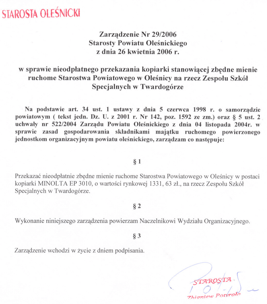 STAROSTA OLESNICKI Zarzadzenie Nr 29/2006 Starosty Powiatu Olesnickiego z dnia 26 kwietnia 2006 r. w sprawie nieodplatnego przekazania kopiarki stanowiacej zbedne mienie ruchome Starostwa Powiatowego w Olesnicy na rzecz Zespolu Szkól Specjalnych w Twardogórze Na podstawie art. 34 ust. 1 ustawy z dnia 5 czerwca 1998 r. o samorzadzie powiatowym ( tekst jedno Dz. U. z 2001 r. Nr 142, poz. 1592 ze zm.) oraz § 5 ust. 2uchwaly nr 522/2004 Zarzadu Powiatu Olesnickiego z dnia 04 listopada 2004r. w sprawie zasad gospodarowania skladnikami majatku ruchomego powierzonego jednostkom organizacyjnym powiatu olesnickiego, zarzadzam co nastepuje: §1 Przekazac nieodplatnie zbedne mienie ruchome Starostwa Powiatowego w Olesnicy w postaci kopiarki MINOLTA EP 3010, o wartosci rynkowej 1331,63 zl., na rzecz Zespolu Szkól Specjalnych w Twardogórze. §2 Wykonanie niniejszego zarzadzenia powierzam Naczelnikowi Wydzialu Organizacyjnego. §3 Zarzadzenie wchodzi w zycie z dniem podpisania. ( , ~~) ~1W~~ / O 7- 7hi(Tniew po/ra ) fI ~