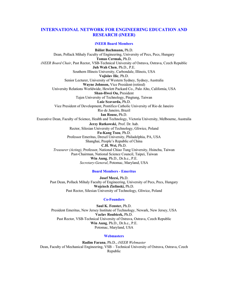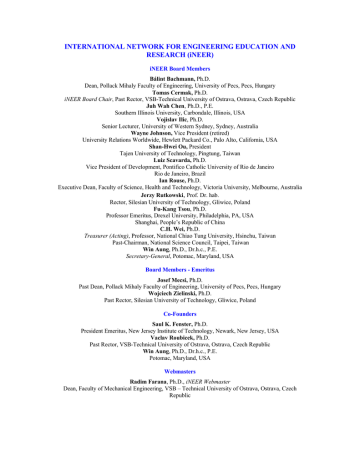 INTERNATIONAL NETWORK FOR ENGINEERING EDUCATION AND RESEARCH (iNEER) iNEER Board Members Bálint Bachmann, Ph.D. Dean, Pollack Mihaly Faculty of Engineering, University of Pecs, Pecs, Hungary Tomas Cermak, Ph.D. iNEER Board Chair, Past Rector, VSB-Technical University of Ostrava, Ostrava, Czech Republic Juh Wah Chen, Ph.D., P.E. Southern Illinois University, Carbondale, Illinois, USA Vojislav Ilic, Ph.D. Senior Lecturer, University of Western Sydney, Sydney, Australia Wayne Johnson, Vice President (retired) University Relations Worldwide, Hewlett Packard Co., Palo Alto, California, USA Shan-Hwei Ou, President Tajen University of Technology, Pingtung, Taiwan Luiz Scavarda, Ph.D. Vice President of Development, Pontifico Catholic University of Rio de Janeiro Rio de Janeiro, Brazil Ian Rouse, Ph.D. Executive Dean, Faculty of Science, Health and Technology, Victoria University, Melbourne, Australia Jerzy Rutkowski, Prof. Dr. hab. Rector, Silesian University of Technology, Gliwice, Poland Fu-Kang Tsou, Ph.D. Professor Emeritus, Drexel University, Philadelphia, PA, USA Shanghai, People’s Republic of China C.H. Wei, Ph.D. Treasurer (Acting), Professor, National Chiao Tung University, Hsinchu, Taiwan Past-Chairman, National Science Council, Taipei, Taiwan Win Aung, Ph.D., Dr.h.c., P.E. Secretary-General, Potomac, Maryland, USA Board Members - Emeritus Josef Mecsi, Ph.D. Past Dean, Pollack Mihaly Faculty of Engineering, University of Pecs, Pecs, Hungary Wojciech Zielinski, Ph.D. Past Rector, Silesian University of Technology, Gliwice, Poland Co-Founders Saul K. Fenster, Ph.D. President Emeritus, New Jersey Institute of Technology, Newark, New Jersey, USA Vaclav Roubicek, Ph.D. Past Rector, VSB-Technical University of Ostrava, Ostrava, Czech Republic Win Aung, Ph.D., Dr.h.c., P.E. Potomac, Maryland, USA Webmasters Radim Farana, Ph.D., iNEER Webmaster Dean, Faculty of Mechanical Engineering, VSB – Technical University of Ostrava, Ostrava, Czech Republic Technology Advisor Robert Aung, M.Sc. BPMSC Software Inc., New Jersey Institute of Technology, Newark, NJ, U.S.A. Finance Committee Tomas Cermak, Ph.D. Rector, Technical University of Ostrava, Ostrava, Czech Republic Vojislav Ilic, Ph.D. Senior Lecturer, University of Western Sydney, Sydney, Australia C.H. Wei, Ph.D. Treasurer (Acting), Professor, National Chiao Tung University, Hsinchu, Taiwan Past-Chairman, National Science Council, Taipei, Taiwan Awards Committee John Carpinelli, Ph.D. Associate Professor of Electrical Engineering, New Jersey Institute of Technology, Newark, New Jersey, USA Patricia Fox, MBA Indiana University-Purdue University Indianapolis, Indianapolis, Indianapolis, USA Laszlo T. Koczy, Ph.D. Dean, Szechenyi Istvan University, Gyor, and Professor, Budapest University of Technology and Economics, Budapest, Hungary Board of Editors Win Aung, Ph.D., Dr.h.c., P.E. iNEER Secretary-General, Potomac, Maryland, USA Jerzy Moscinski, Ph.D. Professor, Silesian University of Technology, Gliwice, Poland James Uhomoibhi, Ph.D. University of Ulster, Newtownabbey, UK Wei-Chung Wang, Ph.D. National Hsing-Hua University, Hsinchu, Taiwan Leadership Council Co-Chairs: David Chang, Ph.D. Chancellor, Polytechnic University of New York, New York, USA Wojciech Zielinski, Ph.D. Past Rector, Silesian University of Technology, Gliwice, Poland ICEE International Steering Committee For list of members, please visit: http://www.ineer.org/Committees/ICEE-ISCMember09-082008_doublecolumn.htm iCEER International Steering Committee For list of members, please visit: http://www.ineer.org/Committees/iCEER-ISCMember09-082008_doublecolumn.htm
