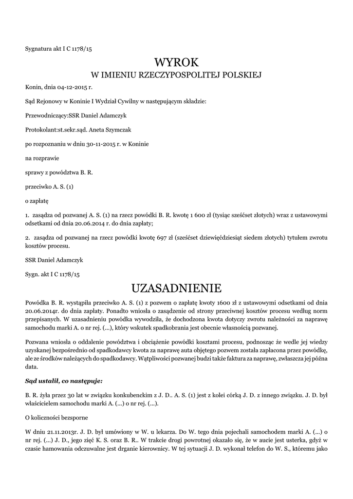 Sygnatura akt I C 1178/15 WYROK W IMIENIU RZECZYPOSPOLITEJ POLSKIEJ Konin, dnia 04-12-2015 r. Sąd Rejonowy w Koninie I Wydział Cywilny w następującym składzie: Przewodniczący:SSR Daniel Adamczyk Protokolant:st.sekr.sąd. Aneta Szymczak po rozpoznaniu w dniu 30-11-2015 r. w Koninie na rozprawie sprawy z powództwa B. R. przeciwko A. S. (1) o zapłatę 1. zasądza od pozwanej A. S. (1) na rzecz powódki B. R. kwotę 1 600 zł (tysiąc sześćset złotych) wraz z ustawowymi odsetkami od dnia 20.06.2014 r. do dnia zapłaty; 2. zasądza od pozwanej na rzecz powódki kwotę 697 zł (sześćset dziewięćdziesiąt siedem złotych) tytułem zwrotu kosztów procesu. SSR Daniel Adamczyk Sygn. akt I C 1178/15 UZASADNIENIE Powódka B. R. wystąpiła przeciwko A. S. (1) z pozwem o zapłatę kwoty 1600 zł z ustawowymi odsetkami od dnia 20.06.2014r. do dnia zapłaty. Ponadto wniosła o zasądzenie od strony przeciwnej kosztów procesu według norm przepisanych. W uzasadnieniu powódka wywodziła, że dochodzona kwota dotyczy zwrotu należności za naprawę samochodu marki A. o nr rej. (...), który wskutek spadkobrania jest obecnie własnością pozwanej. Pozwana wniosła o oddalenie powództwa i obciążenie powódki kosztami procesu, podnosząc że wedle jej wiedzy uzyskanej bezpośrednio od spadkodawcy kwota za naprawę auta objętego pozwem została zapłacona przez powódkę, ale ze środków należących do spadkodawcy. Wątpliwości pozwanej budzi także faktura za naprawę, zwłaszcza jej późna data. Sąd ustalił, co następuje: B. R. żyła przez 30 lat w związku konkubenckim z J. D.. A. S. (1) jest z kolei córką J. D. z innego związku. J. D. był właścicielem samochodu marki A. (...) o nr rej. (...). O koliczności bezsporne W dniu 21.11.2013r. J. D. był umówiony w W. u lekarza. Do W. tego dnia pojechali samochodem marki A. (...) o nr rej. (...) J. D., jego zięć K. S. oraz B. R.. W trakcie drogi powrotnej okazało się, że w aucie jest usterka, gdyż w czasie hamowania odczuwalne jest drganie kierownicy. W tej sytuacji J. D. wykonał telefon do W. S., któremu jako osobie zaufanej zwykle zlecał naprawy swoich aut. W. S. miał warsztat mechaniczny, a nawet gdy sam nie dokonywał naprawy to zlecał ją innym osobom. Gdy wskazane wyżej osoby wróciły do K. W. S. już czekał pod domem i zabrał auto do naprawy. Jego naprawę zlecił A. P., której ją wykonał. W dniu 19.12.2013r. J. D. przebywał w szpitalu w K.. Zadzwonił wówczas rano do B. R., że kontaktował się z W. S., który tego dnia przywiezie naprawione auto. Powódka miała je odebrać spod domu J. D. w K. na ul. (...). W tym celu udała się w umówione miejsce, gdyż nocowała wówczas u siostry. Tego dnia pod domem J. D. na ul. (...)W. S. przekazał B. R. naprawione auto. Wówczas to B. R. z własnych środków zapłaciła mu za naprawę żądane przez niego 1600 zł. O kwocie do zapłaty dowiedziała się od w momencie przekazania auta od W. S.. Miała przy sobie 2500 zł, wiedząc że części do auta są drogie. W tym samym dniu w/w naprawionym autem powódka pojechała do szpitala do J. D.. Tego dnia po południu miał zaplanowane przyjęcie chemii. W szpitalu powódka poinformowała konkubenta o tym, że auto jest naprawione. W godzinach popołudniowych do J. D. przyjechała w odwiedziny córka A. S. (1) wraz z mężem K. S. oraz synem C. S.. Gdy powódka wyszła na chwilę z pokoju K. S. przy żonie i synu zapytał wskazane auto, które widział na parkingu przed szpitalem. J. D. potwierdził, że auto jest naprawione i rozliczone. Mówił, że nie chce ich w to angażować, tym bardziej że pracują, i to powódka ma się rozliczyć. Obecni nie pytali o szczegóły rozliczenia. Nie podła także kwota. Tego samego dnia około godziny 16.00 J. D. przyjął chemię, po czym został zawieziony do domu. Powódka ze szpitala wyszła wcześniej, gdyż miała umówioną własną wizytę lekarską. W tym samym dniu J. D. poczuł się gorzej i ponownie trafił do szpitala, gdzie zmarł w dniu 23.12.2013r. Zwyczajowo J. D. trzymał gotówkę w domu. A. P. rozliczał się z W. S. za naprawę auta objętego pozwem nie w dniu jego naprawy, ale kilka miesięcy później. Takowa była ich praktyka w zakresie periodycznego rozliczania się za naprawy. Wtedy też wystawiano dokumenty potwierdzające naprawę i zapłatę. Wobec tego w zakresie auta objętego pozwem skoro zapłatę za naprawę A. S. (2) uzyskał od W. S. 22.03.2014r., w tym też dniu wystawił rachunek, jako nabywcę wpisując J. D., będącego właścicielem pojazdu oraz B. R. jako osobę uprawioną do odbioru dokumentu, gdyż od niej pochodziły środki. Powódka po śmierci J. D. próbowała polubownie rozliczyć się z pozwaną w zakresie konkubinatu, żądając jednocześnie zwrotu wyłożonych przez nią środków za naprawę auta objętego pozwem. Okazało się to bezskuteczne i stało się przyczyną konfliktu między stronami. Około maja 2014r. najpierw do W. S., a później do A. P. przyjechał K. S., pytając co było naprawiane w aucie oraz o przyczynę późniejszej daty wystawienia rachunku oraz wpisania w nim powódki. A. P. wyjaśnił mu powyższe okoliczności. Dowód: zeznania A. P. – k. 39-40, zeznania W. S. – k. 40v-41, zeznania C. S. – k. 60-61, częściowo zeznania K. S.k. 61v-62, częściowo zeznania powódki – k. 62v-64, części owo zezna nia pozwanej – k. 64, rachunek nr (...)– k. 7, oświadczenie W. S. – k. 8, dowód wpłaty – k. 9, pismo pełnomocnika powódka z dn. 28.05.2014r. – k. 12 oraz z dnia 01.09.2014r. – k. 13-14, pismo pełnomocnika pozwanej z dn. 18.06.2014r. – k. 33-34 oraz z dn. 09.1.2014r. – k. 30-31, Spadek po J. D. nabyła w całości wprost na podstawie ustawy córka A. S. (1). Dowód: postanowienie o stwierdzeniu nabycia spadku w aktach tutejszego sądu o sygn. I Ns 33/14 B. R. w listopadzie i grudniu 2013r. miała własne środki pozwalające na zapłatę auta objętego pozwem. 