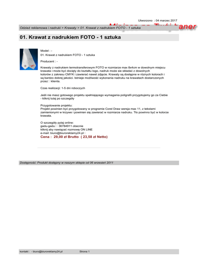 Utworzono : 04 marzec 2017 Odzież reklamowa i nadruki > Krawaty > 01. Krawat z nadrukiem FOTO - 1 sztuka 01. Krawat z nadrukiem FOTO - 1 sztuka Model : 01. Krawat z nadrukiem FOTO - 1 sztuka Producent : Krawaty z nadrukiem termotransferowym FOTO w rozmiarze max 8x4cm w dowolnym miejscu krawata i może być docięty do kształtu logo, nadruk może sie składać z dowolnych kolorów z zakresu CMYK i zawierać nawet zdjęcie. Krawaty są dostępne w róznych kolorach i są bardzo dobrej jakości. Istnieje możliwość wykonania nadruku na krawatach dostarczonych przez�klienta. Czas realizacji: 1-5 dni roboczych Jeśli nie masz gotowego projektu spełniającego wymagania poligrafii przygotujemy go za Ciebie - kliknij tutaj po szczegóły Przygotowanie projektu: Projekt powinien być przygotowany w programie Corel Draw wersja max 11, z tekstami zamienionymi w krzywe i powinien się zawierać w rozmiarze nadruku. Tło powinno być w kolorze krawata. O szczegóły pytaj online: gadu-gadu:�36784911 obecnie kliknij aby nawiązać rozmowę ON LINE e-mail: [email protected]� Cena : 29,00 zł Brutto ( 23,58 zł Netto) Dostępność: Produkt dostępny w naszym sklepie od 06 wrzesień 2011 kontakt : - [email protected] Strona 1