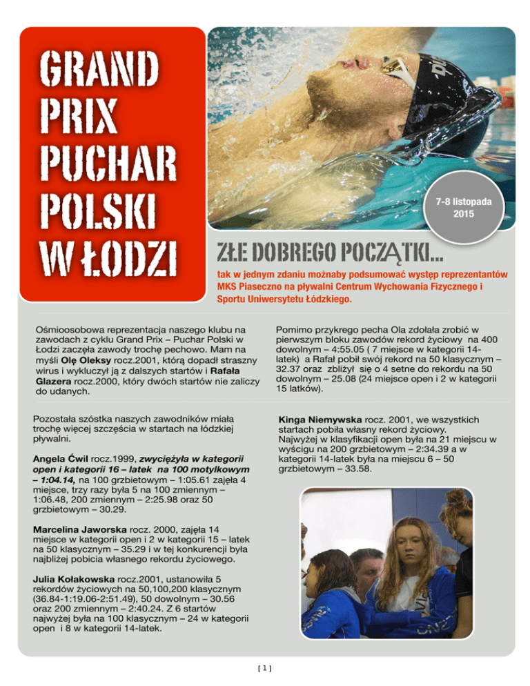 GRAND PRIX PUCHAR POLSKI W ŁODZI 7-8 listopada 2015 ZŁE DOBREGO POCZĄTKI... tak w jednym zdaniu możnaby podsumować występ reprezentantów MKS Piaseczno na pływalni Centrum Wychowania Fizycznego i Sportu Uniwersytetu Łódzkiego. Ośmioosobowa reprezentacja naszego klubu na zawodach z cyklu Grand Prix – Puchar Polski w Łodzi zaczęła zawody trochę pechowo. Mam na myśli Olę Oleksy rocz.2001, którą dopadł straszny wirus i wykluczył ją z dalszych startów i Rafała Glazera rocz.2000, który dwóch startów nie zaliczy do udanych. Pomimo przykrego pecha Ola zdołała zrobić w pierwszym bloku zawodów rekord życiowy na 400 dowolnym – 4:55.05 ( 7 miejsce w kategorii 14latek) a Rafał pobił swój rekord na 50 klasycznym – 32.37 oraz zbliżył się o 4 setne do rekordu na 50 dowolnym – 25.08 (24 miejsce open i 2 w kategorii 15 latków). Pozostała szóstka naszych zawodników miała trochę więcej szczęścia w startach na łódzkiej pływalni. Kinga Niemywska rocz. 2001, we wszystkich startach pobiła własny rekord życiowy. Najwyżej w klasyfikacji open była na 21 miejscu w wyścigu na 200 grzbietowym – 2:34.39 a w kategorii 14-latek była na miejscu 6 – 50 grzbietowym – 33.58. Angela Ćwil rocz.1999, zwyciężyła w kategorii open i kategorii 16 – latek na 100 motylkowym – 1:04.14, na 100 grzbietowym – 1:05.61 zajęła 4 miejsce, trzy razy była 5 na 100 zmiennym – 1:06.48, 200 zmiennym – 2:25.98 oraz 50 grzbietowym – 30.29. Marcelina Jaworska rocz. 2000, zajęła 14 miejsce w kategorii open i 2 w kategorii 15 – latek na 50 klasycznym – 35.29 i w tej konkurencji była najbliżej pobicia własnego rekordu życiowego. Julia Kołakowska rocz.2001, ustanowiła 5 rekordów życiowych na 50,100,200 klasycznym (36.84-1:19.06-2:51.49), 50 dowolnym – 30.56 oraz 200 zmiennym – 2:40.24. Z 6 startów najwyżej była na 100 klasycznym – 24 w kategorii open i 8 w kategorii 14-latek. [1] Szymon Dereziński rocz.2001 ustanowił 2 rekordy życiowe w wyścigu na 200 dowolnym – 2:08.56 (5 miejsce w kategorii 14latków) i 100 zmiennym – 1:06.33 ( 3 miejsce w kat.14-latków). Szymon na 50 dowolnym – 25.76 był 39 w kategorii open i 1–szy w swoim roczniku. Paweł Mitrus rocz. 2000 na 7 startów ustanowił 6 rekordów życiowych na 50-100 grzbietowym( 27.97-1:01.65), 50-100 motylkowym (26.72-1:00.60) i 200 zmiennym – 2:17.78. Najwyżej w klasyfikacji open był na 10 pozycji, w swoim roczniku 3 (15lat). Drugi w swoim roczniku był w wyścigu na 100 motylkowym. W imieniu trenerów MKS Piaseczno serdecznie gratuluję występu naszej ekipie w Łodzi. Pocieszyć należy zawodników, którzy nie osiągnęli rekordów życiowych i mięli nieudane starty. gdzie bez pechowych wpadek i dzięki dobrze zrealizowanemu planowi powinno być już lepiej w statystyce nowych rekordów życiowych. Gabriel Turczyński zdjęcia: MEGATIMING [2] oprac. graf. Magda Derezińska Najbliższe cele to Grand-Prix Puchar Polski w Poznaniu (21-22.11) oraz Zimowe Mistrzostwa Seniorów i Młodzieżowców w Lublinie (17-21.12),