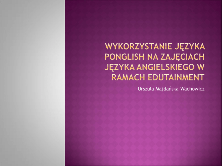 Urszula Majdańska-Wachowicz Wykład na temat języka PONGLISH pt. Ponglish w aspekcie słowotwórczym. Zarys problematyki, Edutainment w zarysie, Ćwiczenia. Wykład został przygotowany na podstawie dwóch artykułów naukowych wygłoszonych podczas międzynarodowych konferencji lingwistycznych: 1) „Ponglish w aspekcie strukturalnym – zarys problematyki” Zielonogórskie Seminaria Językoznawcze 2012 (artykuł ukaże się w monografii pokonferencyjnej), 2) „Expressive means in Ponglish” Young Linguists’ Meeting Poznań 2012 (artykuł ukaże się w Journal of Modern Education, NY, USA) 3) W materiale badawczym nie naniesiono żadnych zmian ortograficznych, stylistycznych itp. (dotyczy cytatów, zdań przykładowych, definicji itd.), 4) Metodologia badań: językoznawstwo strukturalne, pragmatyka, językoznawstwo kognitywne. „Język Polonii” (Walczak, 2001a: 569) „Dialekt polonijny” (Sękowska, 1994:7-8) „Mówiona odmiana języka używana przez Polaków mieszkających w Wielkiej Brytanii i w Irlandii” (Błasiak, 2008: 156-162) „Językowy koktajl” (http://www.telegraph.co.uk/news/worldnews/europe/poland/2235917/PolishPonglish-dialect-arrives-in-England.html 20 maja 2012) „nowy język, który jest połączeniem języka angielskiego i polskiego” (http://news.bbc.co.uk/2/hi/uk_news/england/7500077.stm 20 maja 2012) Ponglish = Polish + English Chinglish, Czenglish, Spanglish, Denglish, etc. „Ponglish.org to słownik slangu polsko-angielskiego, którym posługują się Polacy mieszkający i pracujący na Wyspach Brytyjskich (Wielka Brytania i Irlandia) bądź w innych krajach anglojęzycznych. Ponglish (Ponglisz) oparty jest na języku polskim, ale zawiera wiele wyrazów, zwrotów, wyrażeń oraz konstrukcji składniowych pochodzących z języka angielskiego.Słownik Ponglish.org tworzony jest przez użytkowników strony. Każdy może dodać swoją propozycję bezpośrednio na stronie Ponglish.org bądź za pomoca Facebooka, czy Twittera. Pomysł na stronę narodził się w 2009 roku, a gotowy serwis został uruchomiony na początku lutego 2010 roku. Po miesiącu do słownika zostało dodanych ponad 500 słów. Obecnie dochodzi około 10 nowych słów dziennie.Obecnie pracujemy nad dodaniem możliwości dodawania słów w odpowiednich kategoriach ze względu na pochodzenie. Możliwość dodawania kategorii istnieje już przy dodawaniu każdego słowa” (Ponglish.org.) „Ponglish: (od ang. Polish i English) slangu polskoangielskiego, którym posługują się Polacy mieszkający i pracujący na Wyspach Brytyjskich (Wielka Brytania i Irlandia) bądź w innych krajach anglojęzycznych. Ponglish (Ponglisz) oparty jest na języku polskim, ale zawiera wiele wyrazów, zwrotów, wyrażeń oraz konstrukcji składniowych pochodzących z języka angielskiego. - Zadzwonię jutro! - OK. Będziemy w intaczu! Tagi: ponglish Polish English Powiązane słowa: ponglisz Kategorie: Ponglish amerykański Ponglish brytyjski Ponglish polski Ponglish budowlany Ponglish internetowy Ponglish technologiczny Ponglish potoczny Ponglish biznesowy Data dodania: 2010-0309 Autor: marek” W badanym słowniku brak wyznaczników stylu naukowego. Warstwę językową cechują liczne błędy językowe, najczęściej ortograficzne (tzw. „literówki”), co wydaje się typowe dla komunikacji internetowej. W słowniku przeważa styl swobodny, potoczny, niekiedy ekspresywno-oceniający. Dotyczy to definicji, zdań lub dialogów przykładowych. Osobliwy kształt językowy słownika wynika z tego, że jest to twór dynamiczny, spontanicznie wzbogacany przez najróżniejszych użytkowników (tj. w słowniku nie znajdują się informacje na temat wykształcenia użytkowników, ich statusu społecznego czy poziomu znajomości języka ojczystego i języka angielskiego). Z tego względu w badanym materiale językowym (hasła, definicje, przykłady itp.) nie wprowadzono żadnych zmian ortograficznostylistycznych. Hasła zgromadzone w słowniku są opatrzone rozmaitymi kwalifikatorami, np. PONGLISH BRYTYJSKI, PONGLISH AMERYKAŃSKI, PONGLISH POLSKI, PONGLISH MIEJSKI, PONGLISH POTOCZNY, PONGLISH BUDOWLANY, PONGLISH TECHNOLOGICZNY, PONGLISH INTERNETOWY itd. Oznacza to, że język ten ma bardzo szeroki zakres zastosowania oraz zasięg występowania. Na podstawie kwalifikatorów można wywnioskować, że posługują się nim nie tylko Polacy przebywający w krajach anglojęzycznych, ale także Polacy mieszkający w Polsce. Podstawą wyodrębnienia wspólnoty komunikatywnej posługującej się tym językiem jest z jednej strony kryterium geograficzne (emigranci mieszkający i pracujący w krajach anglojęzycznych), z drugiej kryterium zawodowe (specjaliści posługujący się internacjonalizmami itp.), z trzeciej zaś kryterium, które można by zdefiniować jako kryterium nowoczesności. Odnosi się ono do określonego sposobu i warunków życia, w których dostęp do zdobyczy cywilizacyjnych, korzystanie z nowych technologii, zmiany w sposobie komunikowania, a przede wszystkim w mniejszym lub większym stopniu znajomość języka globalnego – jakim jest język angielski - stanowią ważne wyznaczniki (dwa ostatnie kryteria odnoszą się także do Polaków, którzy mieszkają w Polsce). Potwierdza to Marcin Zabawa, który ujmuje kontakt językowy polsko-angielski bardzo wszechstronnie, nie ograniczając go jedynie do kryterium geograficznego. Zdaniem badacza do kontaktu językowego dochodzi w procesie komunikacji internetowej, nauki języka angielskiego w szkole, podczas oglądania filmów anglojęzycznych itp. (Zabawa, 2008: 155). Z tego względu, stosując termin Ponglish, uwzględniam wielowymiarowość kontaktu języka polskiego z angielskim. Ponglish to kod multifunkcyjny, wewnętrznie zróżnicowany, w którym w zależności od kwalifikatorów dominują określone funkcje językowe. Do prymarnych, współistniejących i przenikających się między sobą funkcji należy zaliczyć: 1) usprawnienie komunika