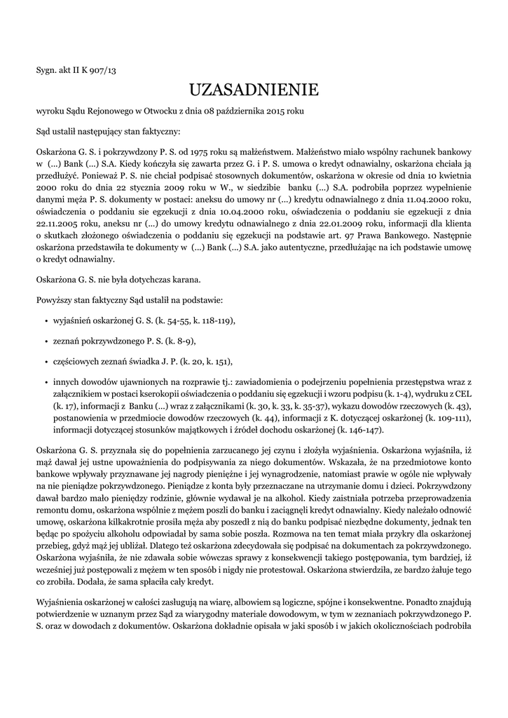 Sygn. akt II K 907/13 UZASADNIENIE wyroku Sądu Rejonowego w Otwocku z dnia 08 października 2015 roku Sąd ustalił następujący stan faktyczny: Oskarżona G. S. i pokrzywdzony P. S. od 1975 roku są małżeństwem. Małżeństwo miało wspólny rachunek bankowy w (...) Bank (...) S.A. Kiedy kończyła się zawarta przez G. i P. S. umowa o kredyt odnawialny, oskarżona chciała ją przedłużyć. Ponieważ P. S. nie chciał podpisać stosownych dokumentów, oskarżona w okresie od dnia 10 kwietnia 2000 roku do dnia 22 stycznia 2009 roku w W., w siedzibie banku (...) S.A. podrobiła poprzez wypełnienie danymi męża P. S. dokumenty w postaci: aneksu do umowy nr (...) kredytu odnawialnego z dnia 11.04.2000 roku, oświadczenia o poddaniu sie egzekucji z dnia 10.04.2000 roku, oświadczenia o poddaniu sie egzekucji z dnia 22.11.2005 roku, aneksu nr (...) do umowy kredytu odnawialnego z dnia 22.01.2009 roku, informacji dla klienta o skutkach złożonego oświadczenia o poddaniu się egzekucji na podstawie art. 97 Prawa Bankowego. Następnie oskarżona przedstawiła te dokumenty w (...) Bank (...) S.A. jako autentyczne, przedłużając na ich podstawie umowę o kredyt odnawialny. Oskarżona G. S. nie była dotychczas karana. Powyższy stan faktyczny Sąd ustalił na podstawie: • wyjaśnień oskarżonej G. S. (k. 54-55, k. 118-119), • zeznań pokrzywdzonego P. S. (k. 8-9), • częściowych zeznań świadka J. P. (k. 20, k. 151), • innych dowodów ujawnionych na rozprawie tj.: zawiadomienia o podejrzeniu popełnienia przestępstwa wraz z załącznikiem w postaci kserokopii oświadczenia o poddaniu się egzekucji i wzoru podpisu (k. 1-4), wydruku z CEL (k. 17), informacji z Banku (...) wraz z załącznikami (k. 30, k. 33, k. 35-37), wykazu dowodów rzeczowych (k. 43), postanowienia w przedmiocie dowodów rzeczowych (k. 44), informacji z K. dotyczącej oskarżonej (k. 109-111), informacji dotyczącej stosunków majątkowych i źródeł dochodu oskarżonej (k. 146-147). Oskarżona G. S. przyznała się do popełnienia zarzucanego jej czynu i złożyła wyjaśnienia. Oskarżona wyjaśniła, iż mąż dawał jej ustne upoważnienia do podpisywania za niego dokumentów. Wskazała, że na przedmiotowe konto bankowe wpływały przyznawane jej nagrody pieniężne i jej wynagrodzenie, natomiast prawie w ogóle nie wpływały na nie pieniądze pokrzywdzonego. Pieniądze z konta były przeznaczane na utrzymanie domu i dzieci. Pokrzywdzony dawał bardzo mało pieniędzy rodzinie, głównie wydawał je na alkohol. Kiedy zaistniała potrzeba przeprowadzenia remontu domu, oskarżona wspólnie z mężem poszli do banku i zaciągnęli kredyt odnawialny. Kiedy należało odnowić umowę, oskarżona kilkakrotnie prosiła męża aby poszedł z nią do banku podpisać niezbędne dokumenty, jednak ten będąc po spożyciu alkoholu odpowiadał by sama sobie poszła. Rozmowa na ten temat miała przykry dla oskarżonej przebieg, gdyż mąż jej ubliżał. Dlatego też oskarżona zdecydowała się podpisać na dokumentach za pokrzywdzonego. Oskarżona wyjaśniła, że nie zdawała sobie wówczas sprawy z konsekwencji takiego postępowania, tym bardziej, iż wcześniej już postępowali z mężem w ten sposób i nigdy nie protestował. Oskarżona stwierdziła, ze bardzo żałuje tego co zrobiła. Dodała, że sama spłaciła cały kredyt. Wyjaśnienia oskarżonej w całości zasługują na wiarę, albowiem są logiczne, spójne i konsekwentne. Ponadto znajdują potwierdzenie w uznanym przez Sąd za wiarygodny materiale dowodowym, w tym w zeznaniach pokrzywdzonego P. S. oraz w dowodach z dokumentów. Oskarżona dokładnie opisała w jaki sposób i w jakich okolicznościach podrobiła dokumenty wypełniając je danymi męża oraz podpisując się na nich za niego. W powyższej sytuacji Sąd nie dopatrzył się żadnych powodów, aby kwestionować wiarygodność wyjaśnień oskarżonej. Sąd w całości dał wiarę zeznaniom pokrzywdzonego P. S.. Są one bowiem spójne i logiczne. Pokrzywdzony zeznał wszystko co mu wiadomo w sprawie podkreślając, że nie podpisywał się na przedmiotowych dokumentach. Zeznania pokrzywdzonego znajdują potwierdzenie w wiarygodnych wyjaśnieniach oskarżonej oraz w uznanych przez Sąd za wiarygodne dowodach z dokumentów bankowych. Zeznania świadka J. P. częściowo zasługują na wiarę. Sąd odmówił wiarygodności zeznaniom J. P. w części, w której podała, że przy podpisaniu umowy obecni byli zarówno oskarżona jak i jej mąż oraz że dokonali tego w jej obecności. W tym zakresie zeznania świadka są sprzeczne z wiarygodnymi wyjaśnieniami oskarżonej oraz z zeznaniami pokrzywdzonego P. S., którzy zgodnie stwierdzili, że pokrzywdzony nie był obecny przy podpisywaniu umowy w banku i nie podpisywał związanych z jej zawarciem dokumentów. Natomiast w pozostałej części zeznania świadka J. P. znajdują potwierdzenie w pozostałym wiarygodnym materiale dowodowym i dlatego Sąd uznał je za wiarygodne. Sąd uznał za wiarygodne również wszystkie dowody z dokumentów ujawnione na rozprawie. Żadna ze stron nie kwestionowała bowiem ich wiarygodności ani autentyczności, a w połączeniu z pozostałym wiarygodnym materiałem dowodowym, dokumenty te pozwalają na odtworzenie pełnego i rzeczywistego obrazu czynu popełnionego przez oskarżoną. Czyn oskarżonej G. S. wyczerpuje znamiona przestępstwa z art. 270 § 1 k.k. w zw. z art. 12 k.k. Przestępstwo z art. 270 § 1 k.k. popełnia ten, kto w celu użycia za autentyczny, podrabia lub przerabia dokument lub takiego dokumentu jako autentycznego używa. Przedmiotem ochrony każdej z postaci występku z art. 270 jest ogólnie ujęta wiarygodność dokumentów, ucieleśniona w ich autentyczności (oryginalności), a w konsekwencji ściśle związana z ich znaczeniem dowodowym. Przedmiotem czynności wykonawczej jest dokument. Podrabianiem jest nadanie jakiemuś przedmiotowi (np. pismu) pozorów dokumentu w celu wywoł