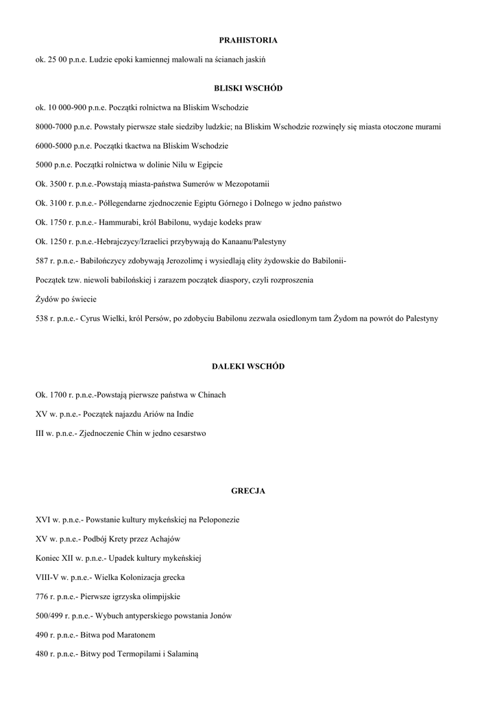 PRAHISTORIA ok. 25 00 p.n.e. Ludzie epoki kamiennej malowali na ścianach jaskiń BLISKI WSCHÓD ok. 10 000-900 p.n.e. Początki rolnictwa na Bliskim Wschodzie 8000-7000 p.n.e. Powstały pierwsze stałe siedziby ludzkie; na Bliskim Wschodzie rozwinęły się miasta otoczone murami 6000-5000 p.n.e. Początki tkactwa na Bliskim Wschodzie 5000 p.n.e. Początki rolnictwa w dolinie Nilu w Egipcie Ok. 3500 r. p.n.e.-Powstają miasta-państwa Sumerów w Mezopotamii Ok. 3100 r. p.n.e.- Półlegendarne zjednoczenie Egiptu Górnego i Dolnego w jedno państwo Ok. 1750 r. p.n.e.- Hammurabi, król Babilonu, wydaje kodeks praw Ok. 1250 r. p.n.e.-Hebrajczycy/Izraelici przybywają do Kanaanu/Palestyny 587 r. p.n.e.- Babilończycy zdobywają Jerozolimę i wysiedlają elity żydowskie do BabiloniiPoczątek tzw. niewoli babilońskiej i zarazem początek diaspory, czyli rozproszenia Żydów po świecie 538 r. p.n.e.- Cyrus Wielki, król Persów, po zdobyciu Babilonu zezwala osiedlonym tam Żydom na powrót do Palestyny DALEKI WSCHÓD Ok. 1700 r. p.n.e.-Powstają pierwsze państwa w Chinach XV w. p.n.e.- Początek najazdu Ariów na Indie III w. p.n.e.- Zjednoczenie Chin w jedno cesarstwo GRECJA XVI w. p.n.e.- Powstanie kultury mykeńskiej na Peloponezie XV w. p.n.e.- Podbój Krety przez Achajów Koniec XII w. p.n.e.- Upadek kultury mykeńskiej VIII-V w. p.n.e.- Wielka Kolonizacja grecka 776 r. p.n.e.- Pierwsze igrzyska olimpijskie 500/499 r. p.n.e.- Wybuch antyperskiego powstania Jonów 490 r. p.n.e.- Bitwa pod Maratonem 480 r. p.n.e.- Bitwy pod Termopilami i Salaminą 479 r. p.n.e.- Bitwa pod Platerami 338 r. p.n.e.- Bitwa pod Cheroneą, Filip II Macedoński podporządkowuje sobie Grecję 334 r. p.n.e.- Początek wyprawy perskiej Aleksandra Wielkiego i bitwa nad Granikiem 334-323 r. p.n.e.- Aleksander Wielki, król Macedonii, na czele Macedończyków i Greków zdobywa imperium perskie czyli cały Bliski Wschód 333 r. p.n.e.- Bitwa pod Issos 331 r. p.n.e.- Bitwa pod Gaugamelą 323 r. p.n.e.- Śmierć Aleksandra Wielkiego i początek epoki hellenistycznej RZYM 753 r. p.n.e.- Legendarne założenie miasta Rzym 450/449 r. p.n.e.- Spisanie Prawa XII Tablic w Rzymie 264 r. p.n.e.- Koniec podboju Italii przez Rzym 264-241, 218-201, 149-146 r. p.n.e.- Pierwsza, druga i trzecia Wojny Punickie 73-71 r. p.n.e.- Powstanie niewolników w Italii pod wodzą Spartakusa 44 r. p.n.e.- Śmierć Juliusza Cezara 30 r. p.n.e.- Zdobycie przez Rzymian ostatniego państwa hellenistycznego-Egiptu i koniec epoki hellenistycznej 27 r. p.n.e.-Ostateczny koniec republiki rzymskiej, początek ustroju cesarskiego w Rzymie 64 r.- Pierwsze prześladowanie chrześcijan w Cesarstwie Rzymskim 212 r.- Nadanie obywatelstwa całej wolnej ludności imperium rzymskiego 313 r.- Edykt tolerancyjny dla chrześcijan wydany przez Konstantyna Wielkiego w Mediolanie 325 r.- Pierwszy chrześcijański sobór powszechny w Nicei 375 r.- Przybycie Hunów do Europy 378 r.- Wizygoci rozbijają armię rzymską pod Adrianopolem 380 r.- Cesarz Teodozjusz Wielki ogłasza chrześcijaństwo religią panującą w imperium rzymskim 395 r.- Podział cesarstwa rzymskiego na zachodnie i wschodnie 406 r.- Wojska rzymskie opuszczają Brytanię 410 r.- Wizygoci łupią Rzym 451 r.- Rzymianie i Wizygoci pokonują Hunów na Polach Katalaunijskich w Galii 455 r.- Wandalowie łupią Rzym 476 r.- Germański wódz w służbie rzymskiej, Odoaker, obala ostatniego cesarza zachodnio-rzymskiego