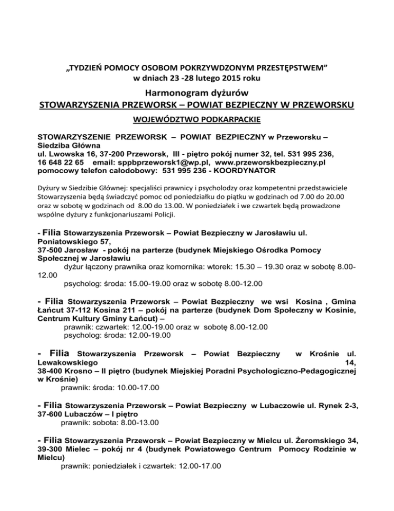 „TYDZIEŃ POMOCY OSOBOM POKRZYWDZONYM PRZESTĘPSTWEM” w dniach 23 -28 lutego 2015 roku Harmonogram dyżurów STOWARZYSZENIA PRZEWORSK – POWIAT BEZPIECZNY W PRZEWORSKU WOJEWÓDZTWO PODKARPACKIE STOWARZYSZENIE PRZEWORSK – POWIAT BEZPIECZNY w Przeworsku – Siedziba Główna ul. Lwowska 16, 37-200 Przeworsk, III - piętro pokój numer 32, tel. 531 995 236, 16 648 22 65 email: [email protected], www.przeworskbezpieczny.pl pomocowy telefon całodobowy: 531 995 236 - KOORDYNATOR Dyżury w Siedzibie Głównej: specjaliści prawnicy i psycholodzy oraz kompetentni przedstawiciele Stowarzyszenia będą świadczyć pomoc od poniedziałku do piątku w godzinach od 7.00 do 20.00 oraz w sobotę w godzinach od 8.00 do 13.00. W poniedziałek i we czwartek będą prowadzone wspólne dyżury z funkcjonariuszami Policji. - Filia Stowarzyszenia Przeworsk – Powiat Bezpieczny w Jarosławiu ul. Poniatowskiego 57, 37-500 Jarosław - pokój na parterze (budynek Miejskiego Ośrodka Pomocy Społecznej w Jarosławiu dyżur łączony prawnika oraz komornika: wtorek: 15.30 – 19.30 oraz w sobotę 8.0012.00 psycholog: środa: 15.00-19.00 oraz w sobotę 8.00-12.00 - Filia Stowarzyszenia Przeworsk – Powiat Bezpieczny we wsi Kosina , Gmina Łańcut 37-112 Kosina 211 – pokój na parterze (budynek Dom Społeczny w Kosinie, Centrum Kultury Gminy Łańcut) – prawnik: czwartek: 12.00-19.00 oraz w sobotę 8.00-12.00 psycholog: środa: 12.00-19.00 Stowarzyszenia Przeworsk – Powiat Bezpieczny w Krośnie ul. Lewakowskiego 14, 38-400 Krosno – II piętro (budynek Miejskiej Poradni Psychologiczno-Pedagogicznej w Krośnie) prawnik: środa: 10.00-17.00 - Filia - Filia Stowarzyszenia Przeworsk – Powiat Bezpieczny w Lubaczowie ul. Rynek 2-3, 37-600 Lubaczów – I piętro prawnik: sobota: 8.00-13.00 - Filia Stowarzyszenia Przeworsk – Powiat Bezpieczny w Mielcu ul. Żeromskiego 34, 39-300 Mielec – pokój nr 4 (budynek Powiatowego Centrum Pomocy Rodzinie w Mielcu) prawnik: poniedziałek i czwartek: 12.00-17.00 psycholog: piątek: 13.00-17.00 - Filia Stowarzyszenia Przeworsk – Powiat Bezpieczny w Przemyślu Pl. Dominikański 3, 37-700 Przemyśl I - piętro pokój numer 61 (budynek Starostwa Powiatowego w Przemyślu) prawnik: czwartek i piątek: 9.00-16.00 psycholog: wtorek: 10.00-16.00 - Filia Stowarzyszenia Przeworsk – Powiat Bezpieczny w Ropczycach 39-100 Ropczyce, ul. Rynek 1, lokal 325 III – piętro (budynek Towarzystwa Budownictwa Społecznego Sp. z o.o. w Ropczycach) prawnik: środa: 9.00-18.00 oraz w sobotę: 9.00-13.00 psycholog: wtorek: 9.00-19.00 - Filia Stowarzyszenia Przeworsk – Powiat Bezpieczny w Stalowej Woli ul. 1sierpnia 26, 37- 450 Stalowa Wola, - I piętro (budynek ZSP Nr 2 im. Tadeusza Kościuszki „Budowlanka”, wejście od strony torów kolejowych) prawnik: poniedziałek i wtorek: 10.00-14.00 psycholog: piątek: 15.00-19.00 - Filia Stowarzyszenie Przeworsk – Powiat Bezpieczny w Tarnobrzegu ul. 1 Maja 4, 39-400 Tarnobrzeg – pokój nr 18 (budynek Starostwa Powiatowego w Tarnobrzegu) łączony dyżur prawnika i komornika: środa: 12.00-17.00 psycholog: czwartek: 15.00-19.00 STOWARZYSZENIE PRZEWORSK - POWIAT BEZPIECZNY ul. Lwowska 16, 37-200 Przeworsk tel: 531 995 236, 16 648 22 65 pomocowy telefon całodobowy: 531 995 236 e-mail: [email protected] www.przeworskbezpieczny.pl Ośrodek Pomocy dla Osób Pokrzywdzonych Przestępstwem Nowy Horyzont w Rzeszowie będzie pełnił dyżury w związku z Tygodniem Pomocy Osobom Pokrzywdzonym Przestępstwem w okresie 23.02 – 28.02.2015 r. w godzinach od 10 – 18 (poniedziałek – piątek) oraz od 9-13 (sobota) w siedzibie Ośrodka przy ul. Leszczyńskiego 3 w Rzeszowie, tel. (0 – 17) 858 10 33 , kom. 605 289 682, e-mail: [email protected], www.nowyhoryzont.eu, www.pokrzywdzeni.gov.pl Grafik dyżurów Data Godzina Specjalista 23.02.2015 Poniedziałek 10 – 15 Policjant KWP 10 – 12 Psycholog 15 – 17 Prawnik 10 – 15 Policjant KWP 15 – 17 Psycholog 15 – 17 Prawnik 16 – 18 Prawnik 10 – 15 Policjant KMP 10 – 15 Straż Graniczna 12 – 14 Komornik Sądowy 12 – 14 Prawnik 14 – 17 Prawnik 15 – 18 Psycholog 10 – 15 Policjant KWP 10 – 12 Komornik Sądowy 14 – 17 Prawnik 24.02.2015 Wtorek 25.02.2015 Środa 26.02.2015 Czwartek 27.02.2015 Piątek 28.02.2015 Sobota 10 – 15 Policjant KMP 11 – 13 Prawnik 13 – 15 Prawnik 9 – 12 Prawnik 11 – 13 Psycholog Filia Ośrodka w Krośnie, ul. Grodzka 10, 38-400 Krosno, tel. 515 256 298 Dyżur specjalistów: Poniedziałek: 13 – 17 – Prawnik, Policjant z MKP w Krośnie Środa: 12 – 15 – Komornik, Policjant z MKP w Krośnie Piątek: 12 – 18 – Psycholog, Policjant z MKP w Krośnie Filia Ośrodka w Sanoku ,ul. Jana III Sobieskiego 1, 38-500 Sanok, tel. 570 596 462 Dyżur specjalistów – Wtorek 10-16, Czwartek 10-15, Piątek 13-16 Punkt Ośrodka w Dębicy, ul. Sienkiewicza 1, 39-200 Dębica Dyżur specjalistów – Wtorek 11-14, Środa 15-18 Punkt Ośrodka w Czudcu, ul. Słoneczna 2, 38-120 Czudec Dyżur specjalistów – Poniedziałek 11-14, Piątek 11-14 Punkt Ośrodka w Strzyżowie, ul. Słowackiego 8, 38-100 Strzyżów Dyżur specjalistów – Poniedziałek 15-18, Piątek 15-18 Harmonogram dyżurów specjalistów w Podkarpackim Ośrodku Rozwoju Społeczeństwa Obywatelskiego w Rzeszowie ul. Fredry 4/58, 35-959 Rzeszów, w ramach Tygodnia Pomocy Osobom Pokrzywdzonym Przestępstwem (23-28 lutego 2015 r.) Specjalista: 23.02 (PON) 24.02 (WT) 25.02 (ŚR) 26.02 (CZW) 27.02 (PT) 28.02 (SOB) Prawnik 15.00 – 18.00 16.00 – 18.00 8.00 – 13.00 9.00 – 13.00 16.00 – 18.00 15.30 – 18.00 10.00 – 13.00 Psycholog 10.00 – 13.00 16.00 – 19.00 Policja 12.00 – 15.00 12.00 – 15.00 Kuratorzy I Zespołu Kuratorskiej Służby Sądowej Sądu Rejonowego w Rzeszowie 14.00 – 16.00 13.00 – 16.00 13.00 – 16.00 10.00 – 16.00 10.00 – 13.00 Kuratorzy II Zespołu Kuratorskiej Służby Sądowej Sądu Rejonowego w Rzeszowie 10.00 – 14.00 10.00 – 14.00 10.00 – 13.00
