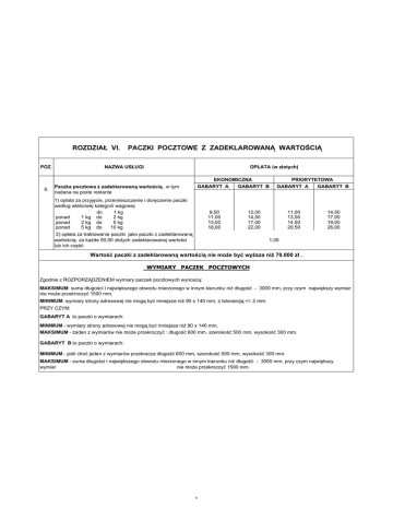 ROZDZIAà VI. POZ. 8. PACZKI POCZTOWE Z ZADEKLAROWANĄ WARTOĝCIĄ NAZWA USàUGI OPàATA (w záotych) EKONOMICZNA GABARYT A GABARYT B Paczka pocztowa z zadeklarowaną wartoĞcią , w tym nadana na poste restante 1) opáata za przyjĊcie, przemieszczenie i dorĊczenie paczki wedáug wáaĞciwej kategorii wagowej do 1 kg ponad 1 kg do 2 kg ponad 2 kg do 5 kg ponad 5 kg do 10 kg 2) opáata za traktowanie paczki jako paczki z zadeklarowaną wartoĞcią: za kaĪde 50,00 záotych zadeklarowanej wartoĞci lub ich czĊĞü 9,50 11,00 13,00 18,00 PRIORYTETOWA GABARYT A GABARYT B 12,00 14,50 17,00 22,00 11,00 13,00 14,50 20,50 14,50 17,00 19,00 26,00 1,00 WartoĞü paczki z zadeklarowaną wartoĞcią nie moĪe byü wyĪsza niĪ 70.000 zá . WYMIARY PACZEK POCZTOWYCH Zgodnie z ROZPORZĄDZENIEM wymiary paczek pocztowych wynoszą: MAKSIMUM: suma dáugoĞci i najwiĊkszego obwodu mierzonego w innym kierunku niĪ dáugoĞü - 3000 mm, przy czym najwiĊkszy wymiar nie moĪe przekroczyü 1500 mm. MINIMUM: wymiary strony adresowej nie mogą byü mniejsze niĪ 90 x 140 mm, z tolerancją +/- 2 mm. PRZY CZYM: GABARYT A to paczki o wymiarach: MINIMUM - wymiary strony adresowej nie mogą byü mniejsze niĪ 90 x 140 mm, MAKSIMUM - Īaden z wymiarów nie moĪe przekroczyü : dáugoĞü 600 mm, szerokoĞü 500 mm, wysokoĞü 300 mm. GABARYT B to paczki o wymiarach: MINIMUM - jeĞli choü jeden z wymiarów przekracza dáugoĞü 600 mm, szerokoĞü 500 mm, wysokoĞü 300 mm. MAKSIMUM - suma dáugoĞci i najwiĊkszego obwodu mierzonego w innym kierunku niĪ dáugoĞü - 3000 mm, przy czym najwiĊkszy wymiar nie moĪe przekroczyü 1500 mm. 6