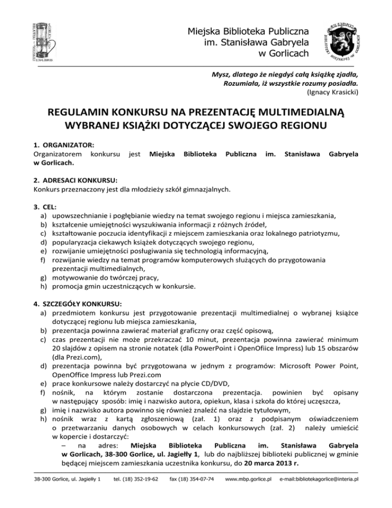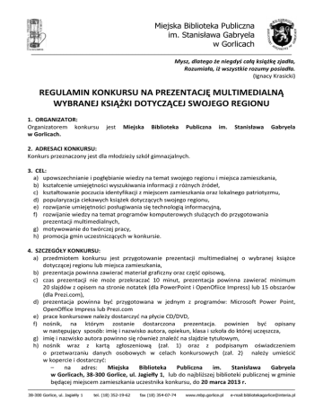 Miejska Biblioteka Publiczna im. Stanisława Gabryela w Gorlicach –––––––––––––––––––––––––––––––––––––––––––––––––––––––––––––––––––––––––––––––– Mysz, dlatego że niegdyś całą książkę zjadła, Rozumiała, iż wszystkie rozumy posiadła. (Ignacy Krasicki) REGULAMIN KONKURSU NA PREZENTACJĘ MULTIMEDIALNĄ WYBRANEJ KSIĄŻKI DOTYCZĄCEJ SWOJEGO REGIONU 1. ORGANIZATOR: Organizatorem konkursu w Gorlicach. jest Miejska Biblioteka Publiczna im. Stanisława Gabryela 2. ADRESACI KONKURSU: Konkurs przeznaczony jest dla młodzieży szkół gimnazjalnych. 3. CEL: a) upowszechnianie i pogłębianie wiedzy na temat swojego regionu i miejsca zamieszkania, b) kształcenie umiejętności wyszukiwania informacji z różnych źródeł, c) kształtowanie poczucia identyfikacji z miejscem zamieszkania oraz lokalnego patriotyzmu, d) popularyzacja ciekawych książek dotyczących swojego regionu, e) rozwijanie umiejętności posługiwania się technologią informacyjną, f) rozwijanie wiedzy na temat programów komputerowych służących do przygotowania prezentacji multimedialnych, g) motywowanie do twórczej pracy, h) promocja gmin uczestniczących w konkursie. 4. SZCZEGÓŁY KONKURSU: a) przedmiotem konkursu jest przygotowanie prezentacji multimedialnej o wybranej książce dotyczącej regionu lub miejsca zamieszkania, b) prezentacja powinna zawierać materiał graficzny oraz część opisową, c) czas prezentacji nie może przekraczać 10 minut, prezentacja powinna zawierać minimum 20 slajdów z opisem na stronie notatek (dla PowerPoint i OpenOfiice Impress) lub 15 obszarów (dla Prezi.com), d) prezentacja powinna być przygotowana w jednym z programów: Microsoft Power Point, OpenOffice Impress lub Prezi.com e) prace konkursowe należy dostarczyć na płycie CD/DVD, f) nośnik, na którym zostanie dostarczona prezentacja. powinien być opisany w następujący sposób: imię i nazwisko autora, opiekun, klasa i szkoła do której uczęszcza, g) imię i nazwisko autora powinno się również znaleźć na slajdzie tytułowym, h) nośnik wraz z kartą zgłoszeniową (zał. 1) oraz z podpisanym oświadczeniem o przetwarzaniu danych osobowych w celach konkursowych (zał. 2) należy umieścić w kopercie i dostarczyć: – na adres: Miejska Biblioteka Publiczna im. Stanisława Gabryela w Gorlicach, 38-300 Gorlice, ul. Jagiełły 1, lub do najbliższej biblioteki publicznej w gminie będącej miejscem zamieszkania uczestnika konkursu, do 20 marca 2013 r. –––––––––––––––––––––––––––––––––––––––––––––––––––––––––––––––––––––––––––––––––– 38-300 Gorlice, ul. Jagiełły 1 tel. (18) 352-19-62 fax (18) 354-07-74 www.mbp.gorlice.pl e-mail:[email protected] Miejska Biblioteka Publiczna im. Stanisława Gabryela w Gorlicach –––––––––––––––––––––––––––––––––––––––––––––––––––––––––––––––––––––––––––––––– i) prace konkursowe przechodzą na własność Organizatora wraz z prawem do ich publikacji oraz wykorzystywania ich elementów, j) Organizator nie odpowiada za brak możliwości odtworzenia materiału wynikający z uszkodzenia nośnika lub błędnego zapisu, k) każdy materiał źródłowy wykorzystany w prezentacji powinien być podpisany imieniem i nazwiskiem autora oraz źródłem pochodzenia. 5. KRYTERIA OCENY Przy dokonywaniu oceny prezentacji multimedialnych brane pod uwagę będą prace, w których autorzy zaprezentują swoją: a) inwencję twórczą, b) poprawność merytoryczną i językową zamieszczonych informacji w prezentacji, c) przejrzysty i uporządkowany układ prezentacji, d) samodzielność w tworzeniu oraz podanie materiałów źródłowych, e) ogólne wrażenie estetyczne. 6. NAGRODY Najciekawsze prace zostaną nagrodzone nagrodami rzeczowymi i dyplomami, a także zamieszczone na stronie internetowej Miejskiej Biblioteki Publicznej im. Stanisława Gabryela w Gorlicach oraz na stronach swoich gmin. 7. POSTANOWIENIA KOŃCOWE a) Oceny prac dokona komisja konkursowa powołana przez Organizatora, b) Wyniki konkursu zostaną ogłoszone na stronie Organizatora www.mbp.gorlice.pl do 11 kwietnia 2013 r. Ponadto autorzy nagrodzonych prac zostaną poinformowani drogą pisemną o terminie podsumowania konkursu, c) Nadesłanie pracy na konkurs jest jednoznaczne z akceptacją jego regulaminu. –––––––––––––––––––––––––––––––––––––––––––––––––––––––––––––––––––––––––––––––––– 38-300 Gorlice, ul. Jagiełły 1 tel. (18) 352-19-62 fax (18) 354-07-74 www.mbp.gorlice.pl e-mail:[email protected]