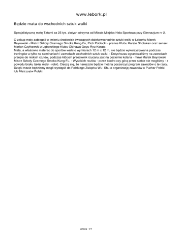 www.lebork.pl Będzie mata do wschodnich sztuk walki Specjalistyczną matę Tatami za 25 tys. złotych otrzyma od Miasta Miejska Hala Sportowa przy Gimnazjum nr 2. O zakup maty zabiegali w imieniu środowisk ćwiczących dalekowschodnie sztuki walki w Lęborku Marek Beyrowski - Mistrz Szkoły Czarnego Smoka Kung-Fu, Piotr Pobłocki - prezes Klubu Karate Shotokan oraz sensei Marian Czylkowski z Lęborskiego Klubu Okinawa Goyu-Ryu Karate. Mata, a właściwie materac do sportów walki o wymiarach 12 m x 12 m, nie będzie wykorzystywana podczas treningów a tylko na seminariach i zawodach wschodnich sztuk walki. - Dotychczas ograniczaliśmy na zawodach przepis do niskich rzutów, podczas których przeciwnik rzucany jest na poziomie kolana - mówi Marek Beyrowski Mistrz Szkoły Czarnego Smoka Kung-Fu. - Wysokich rzutów - przez biodro czy górą przez siebie nie mogliśmy - z powodu braku takiej maty - robić. Cieszę się, że nareszcie będzie można poszerzyć program zawodów o te rzuty. Dzięki macie będziemy mogli wystąpić do Polskiego Związku Wu- Shu o organizację zawodów o Puchar Polski lub Mistrzostw Polski. strona 1/1 Powered by TCPDF (www.tcpdf.org)