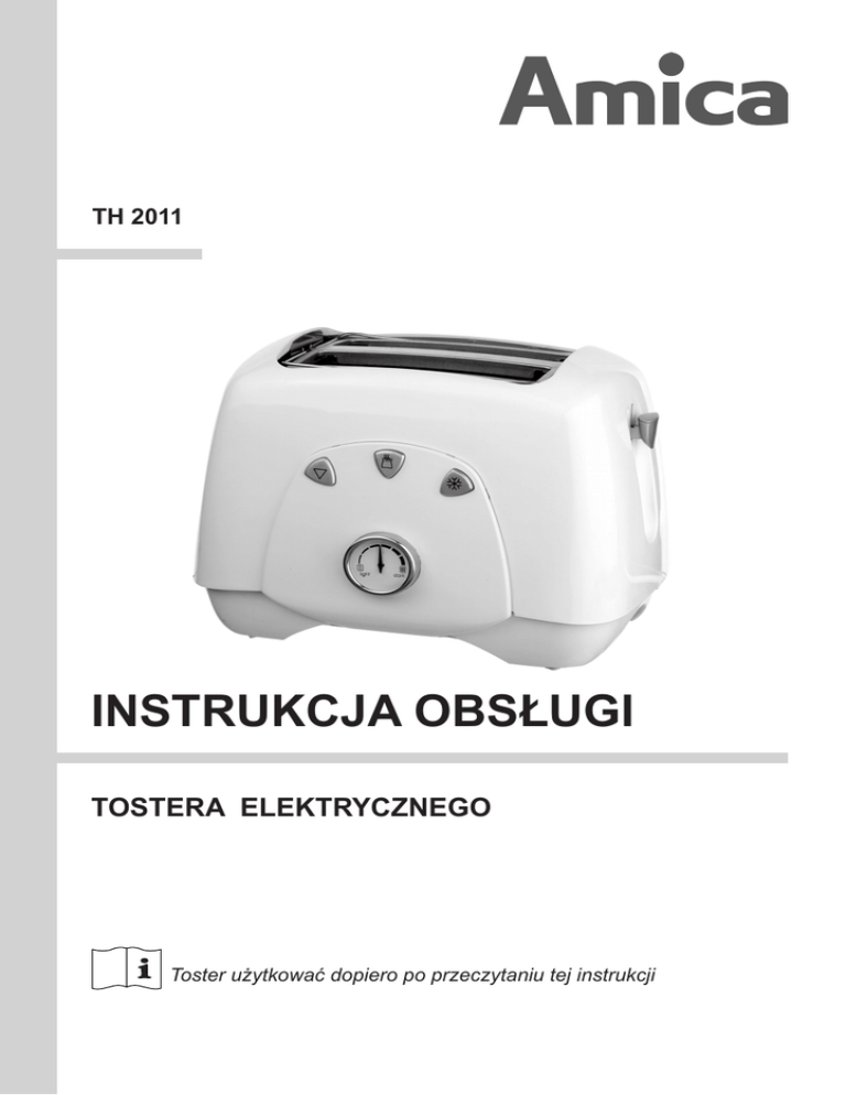 TH 2011 INSTRUKCJA OBSŁUGI TOSTERA ELEKTRYCZNEGO Toster użytkować dopiero po przeczytaniu tej instrukcji SZANOWNY KLIENCIE, Toster elektryczny Amica to połączenie wyjątkowej łatwości obsługi i doskonałej efektywności. Po przeczytaniu niniejszej instrukcji, obsługa tostera nie będzie problemem. Prosimy Państwa o uważną lekturę instrukcji obsługi przed uruchomieniem urządzenia. Przestrzeganie zawartych w niej wskazówek uchroni Państwa przed niewłaściwym użytko waniem. Instrukcję należy zachować i przechowywać tak, aby mieć ją zawsze pod ręką. Należy dokładnie przestrzegać instrukcji obsługi w celu uniknięcia nieszczęśliwych wypadków. Uwaga! Toster przeznaczony jest wyłącznie do użytku domowego. Producent zastrzega sobie możliwość dokonywania zmian niewpływających na dzia łanie urządzenia. Masz wątpliwości? Nie wszystko, co przeczytałeś w instrukcji jest zrozumiałe? - zadzwoń do Centrum Serwisowego, gdzie uzyskasz wszechstronną pomoc. tel.801 801 800 2 spis treści Podstawowe informacje.......................................................................................2 Wskazówki dotyczące bezpieczeństwa użytkowania........................................4 Obsługa................................................................................................................7 Czyszczenie i konserwacja...................................................................................9 Dane techniczne..................................................................................................10 Gwarancja, obsługa posprzedażna...................................................................11 3 WSKAZÓWKI DOTYCZĄCE BEZPIECZEŃSTWA UŻYTKOWANIA l Przed rozpoczęciem użytkowania należy zapoznać się z instrukcją obsługi i zachować ją na przyszłość. l Aby zabezpieczyć się przed zagrożeniem elektrycznym, nie należy zanurzać urządzenia ani przewodu w wodzie ani w żadnej innej cieczy. l Podczas pracy należy sprawować permanentny nadzór nad urządzeniem, jeśli działa w pobliżu dzieci, należy zachować nad urządzeniem szczególną kontrolę, l Po użyciu zawsze wyciągaj wtyczkę z gniazdka; a także w przypadku jakiegokolwiek niewłaściwego działania, oraz przed czyszczeniem. l Przy wyciąganiu wtyczki z gniazdka ściennego nigdy nie ciągnij za przewód, tylko za wtyczkę. l Należy zawsze korzystać z urządzenia stojącego na suchej i płaskiej powierzchni. l Urządzenie nie nadaje się do użytku na wolnym powietrzu. l Toster jest urządzeniem wykonany w I klasie ochrony przeciwporażeniowej i dlatego gniazdo zasilające, do którego zostanie podłączony, musi być bezwzględnie wyposażone w bolec ochronny. l Nie wolno obsługiwać urządzenia, jeśli jest uszkodzone, miała miejsce jego awaria lub zostało naruszone w jakikolwiek sposób – w sprawie naprawy należy zwrócić się do Centrum Serwisowego Amica l W celu zachowania bezpieczeństwa należy regularnie dokładnie sprawdzać przewód zasilania. W razie jakichkolwiek, nawet najlżejszych oznak uszkodzenia przewodu należy oddać całe urządzenie do Serwisu Sprzedawcy. l Aby uniknąć uszkodzenia przewodu zasilającego, nie umieszczaj go ponad ostrymi krawędziami, ani w pobliżu gorących powierzchni. Przed owinięciem przewodu wokół korpusu; w celu odstawienia urządzenia do przechowania należy poczekać, aż urządzenie ostygnie. l Należy bardzo uważać, aby nie dotykać żadnych gorących powierzchni tostera. Nie wolno odstawiać ani nakrywać urządzenia, dopóki całkowicie nie wystygnie. l Nie umieszczać urządzenia na gorącym palniku gazowym lub elektrycznym bądź w jego pobliżu ani w miejscach, gdzie mogłoby zetknąć się z innymi źródłami ciepła. 4 WSKAZÓWKI DOTYCZĄCE BEZPIECZEŃSTWA UŻYTKOWANIA l Uwaga: pieczywo może się spalić. Korzystając z tostera należy zapewnić odpowiednią przestrzeń nad urządzeniem i ze wszystkich stron, dla odpowiedniego obiegu powietrza. Urządzenie podczas pracy nie może dotykać zasłon, dekoracji ściennych, odzieży, ręczników papierowych ani innych materiałów palnych. Należy postępować OSTROŻNIE na powierzchniach, które mogą być wrażliwe na wysokie temperatury – zaleca się korzystanie z izolowanej podkładki termicznej. l URZĄDZENIE PRZEZNACZONE JEST WYŁĄCZNIE DO UŻYTKU DOMOWEGO. URZĄDZENIE WOLNO WYKORZYSTYWAĆ WYŁĄCZNIE ZGODNIE Z PRZEZNACZENIEM. l Nie używać tostera bez zamontowanej wysuwanej tacki na okruchy. Tackę na okruchy należy regularnie czyścić. Nie dopuścić do nadmiernego gromadzenia się okruchów na tacce. l Nie używać urządzenia do opiekania produktów żywnościowych zawierających cukier ani produktów z zawartością dżemu lub konserwantów. l Chleb może się spalić, w związku z czym nie wolno używać tostera w pobliżu lub pod materiałami palnymi, np. zasłonami. l Jeżeli przewód sieciowy ulegnie uszkodzeniu, to powinien on być wymieniony przez specjalistyczny zakład naprawczy w celu uniknięcia zagrożenia. l Niniejszy sprzęt nie jest przeznaczony do użytkowania przez osoby (w tym dzieci) o ograniczonej zdolności fizycznej, czuciowej lub psychicznej, lub osoby o braku doświadczenia lub znajomości sprzętu, chyba że odbywa się to pod nadzorem lub zgodnie z instrukcją użytkowania sprzętu, przekazanej przez osoby odpowiadające za ich bezpieczeństwo. Należy zwracać uwagę na dzieci, aby nie bawiły się tosterem. Ostrzeżenie! Nie wolno wyciągać zaciętego tostu, muffina, bajgla ani niczego innego nożem lub innym przedmiotem, ponieważ zetknięcie z elementami pod napięciem może spowodować śmiertelne porażenie prądem elektrycznym. Uwaga! Jeżeli przewód zasilający nieodłączalny ulegnie uszkodzeniu, to powinien on być wymieniony w specjalistycznym zakładzie naprawczym. Uwaga! Sprzęt nie jest przeznaczony do pracy z użyciem zewnętrznych wyłączników czasowych lub oddzielnego ukł
