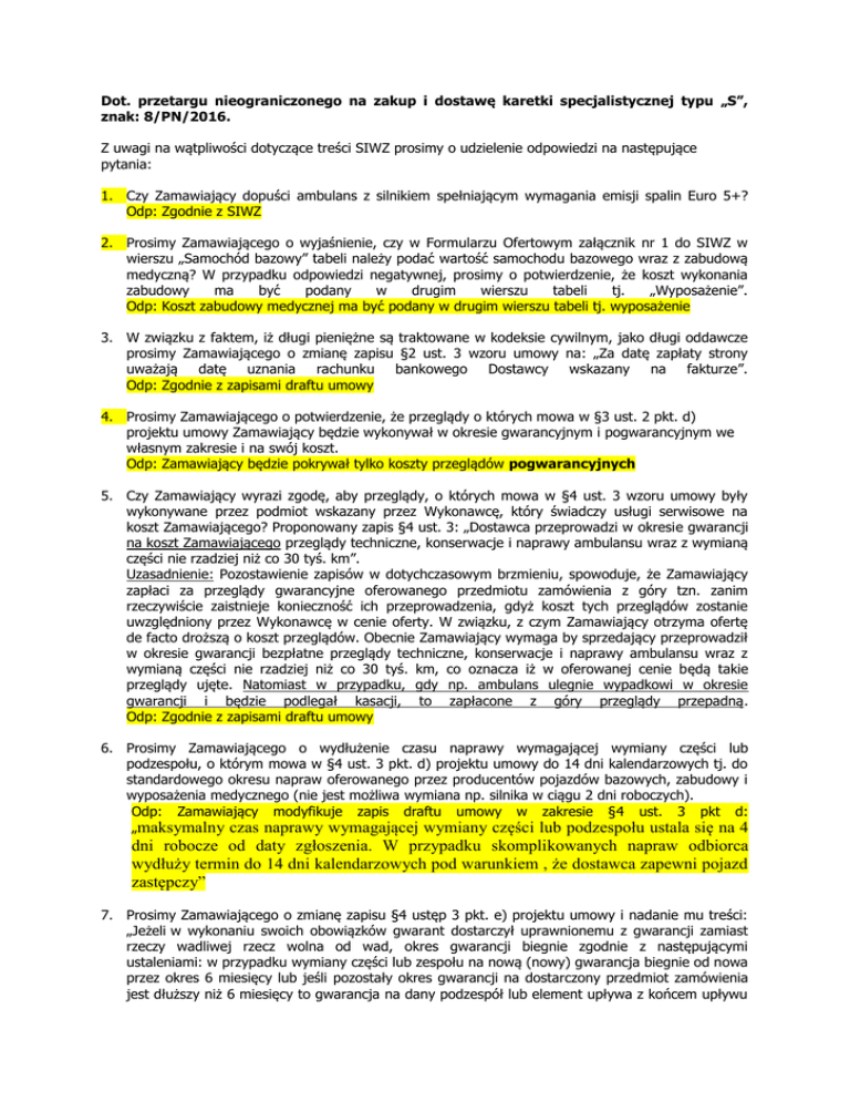 Dot. przetargu nieograniczonego na zakup i dostawę karetki specjalistycznej typu „S”, znak: 8/PN/2016. Z uwagi na wątpliwości dotyczące treści SIWZ prosimy o udzielenie odpowiedzi na następujące pytania: 1. Czy Zamawiający dopuści ambulans z silnikiem spełniającym wymagania emisji spalin Euro 5+? Odp: Zgodnie z SIWZ 2. Prosimy Zamawiającego o wyjaśnienie, czy w Formularzu Ofertowym załącznik nr 1 do SIWZ w wierszu „Samochód bazowy” tabeli należy podać wartość samochodu bazowego wraz z zabudową medyczną? W przypadku odpowiedzi negatywnej, prosimy o potwierdzenie, że koszt wykonania zabudowy ma być podany w drugim wierszu tabeli tj. „Wyposażenie”. Odp: Koszt zabudowy medycznej ma być podany w drugim wierszu tabeli tj. wyposażenie 3. W związku z faktem, iż długi pieniężne są traktowane w kodeksie cywilnym, jako długi oddawcze prosimy Zamawiającego o zmianę zapisu §2 ust. 3 wzoru umowy na: „Za datę zapłaty strony uważają datę uznania rachunku bankowego Dostawcy wskazany na fakturze”. Odp: Zgodnie z zapisami draftu umowy 4. Prosimy Zamawiającego o potwierdzenie, że przeglądy o których mowa w §3 ust. 2 pkt. d) projektu umowy Zamawiający będzie wykonywał w okresie gwarancyjnym i pogwarancyjnym we własnym zakresie i na swój koszt. Odp: Zamawiający będzie pokrywał tylko koszty przeglądów pogwarancyjnych 5. Czy Zamawiający wyrazi zgodę, aby przeglądy, o których mowa w §4 ust. 3 wzoru umowy były wykonywane przez podmiot wskazany przez Wykonawcę, który świadczy usługi serwisowe na koszt Zamawiającego? Proponowany zapis §4 ust. 3: „Dostawca przeprowadzi w okresie gwarancji na koszt Zamawiającego przeglądy techniczne, konserwacje i naprawy ambulansu wraz z wymianą części nie rzadziej niż co 30 tyś. km”. Uzasadnienie: Pozostawienie zapisów w dotychczasowym brzmieniu, spowoduje, że Zamawiający zapłaci za przeglądy gwarancyjne oferowanego przedmiotu zamówienia z góry tzn. zanim rzeczywiście zaistnieje konieczność ich przeprowadzenia, gdyż koszt tych przeglądów zostanie uwzględniony przez Wykonawcę w cenie oferty. W związku, z czym Zamawiający otrzyma ofertę de facto droższą o koszt przeglądów. Obecnie Zamawiający wymaga by sprzedający przeprowadził w okresie gwarancji bezpłatne przeglądy techniczne, konserwacje i naprawy ambulansu wraz z wymianą części nie rzadziej niż co 30 tyś. km, co oznacza iż w oferowanej cenie będą takie przeglądy ujęte. Natomiast w przypadku, gdy np. ambulans ulegnie wypadkowi w okresie gwarancji i będzie podlegał kasacji, to zapłacone z góry przeglądy przepadną. Odp: Zgodnie z zapisami draftu umowy 6. Prosimy Zamawiającego o wydłużenie czasu naprawy wymagającej wymiany części lub podzespołu, o którym mowa w §4 ust. 3 pkt. d) projektu umowy do 14 dni kalendarzowych tj. do standardowego okresu napraw oferowanego przez producentów pojazdów bazowych, zabudowy i wyposażenia medycznego (nie jest możliwa wymiana np. silnika w ciągu 2 dni roboczych). Odp: Zamawiający modyfikuje zapis draftu umowy w zakresie §4 ust. 3 pkt d: „maksymalny czas naprawy wymagającej wymiany części lub podzespołu ustala się na 4 dni robocze od daty zgłoszenia. W przypadku skomplikowanych napraw odbiorca wydłuży termin do 14 dni kalendarzowych pod warunkiem , że dostawca zapewni pojazd zastępczy” 7. Prosimy Zamawiającego o zmianę zapisu §4 ustęp 3 pkt. e) projektu umowy i nadanie mu treści: „Jeżeli w wykonaniu swoich obowiązków gwarant dostarczył uprawnionemu z gwarancji zamiast rzeczy wadliwej rzecz wolna od wad, okres gwarancji biegnie zgodnie z następującymi ustaleniami: w przypadku wymiany części lub zespołu na nową (nowy) gwarancja biegnie od nowa przez okres 6 miesięcy lub jeśli pozostały okres gwarancji na dostarczony przedmiot zamówienia jest dłuższy niż 6 miesięcy to gwarancja na dany podzespół lub element upływa z końcem upływu gwarancji na przedmiot zamówienia”. Usługi gwarancyjne de facto nie są bezpłatne a ich koszt przez każdego z Wykonawców jest uwzględniany w cenie oferty. Obecna treść wymogu w praktyce oznacza gwarancję dożywotnią oraz scedowanie całości obciążenia na Wykonawcę. Taka praktyka stanowi naruszenie natury stosunku zobowiązaniowego i znacząco narusza równowagę stron. Odp: Zgodnie z zapisami umowy Art.581 kc. stanowi, co następuje: § 1. Jeżeli w wykonaniu swoich obowiązków gwarant dostarczył uprawnionemu z gwarancji zamiast rzeczy wadliwej rzecz wolną od wad albo dokonał istotnych napraw rzeczy objętej gwarancją, termin gwarancji biegnie na nowo od chwili dostarczenia rzeczy wolnej od wad lub zwrócenia rzeczy naprawionej. Jeżeli gwarant wymienił część rzeczy, przepis powyższy stosuje się odpowiednio do części wymienionej. 8. Prosimy Zamawiającego o dopuszczenie gwarancji mechanicznej pojazdu na okres 36 miesięcy z limitem 250 000 km. Odp: Zamawiający dopuszcza 9. Prosimy Zamawiającego o potwierdzenie, że przeglądy w okresie pogwarancyjnym Zamawiający będzie wykonywał we własnym zakresie i na swój koszt. Odp: W okresie pogwarancyjnym Zamawiający będzie wykonywał przeglądy we własnym zakresie i na swój koszt. 10. Prosimy Zamawiającego o wprowadzenie poprawnej numeracji ustępów od 1 do 3 w §5 projektu umowy. Odp: Tak 11. Prosimy o zmianę zapisu projektu umowy w zakresie §5 ust. 3: „ Strony zastrzegają sobie prawo do dochodzenia odszkodowania uzupełniającego na zasadach ogólnych, przenoszącego wysokość zastrzeżonych kar umownych do wysokości rzeczywiście poniesionej szkody.” Odp: Przewidziane kary umowne dotyczą jedynie kar płaconych przez dostawcę, a zatem odpowiedzialność odbiorcy za szkody wyrządzone dostawcy uregulowana jest na zasadach ogólnych, wynikających z kodeksu cywilnego. 12. Mając na względzie równość stron umowy prosimy Zamawiającego o wprowadzenie do §5 ust. 2 podpunktu e) o treści: 
