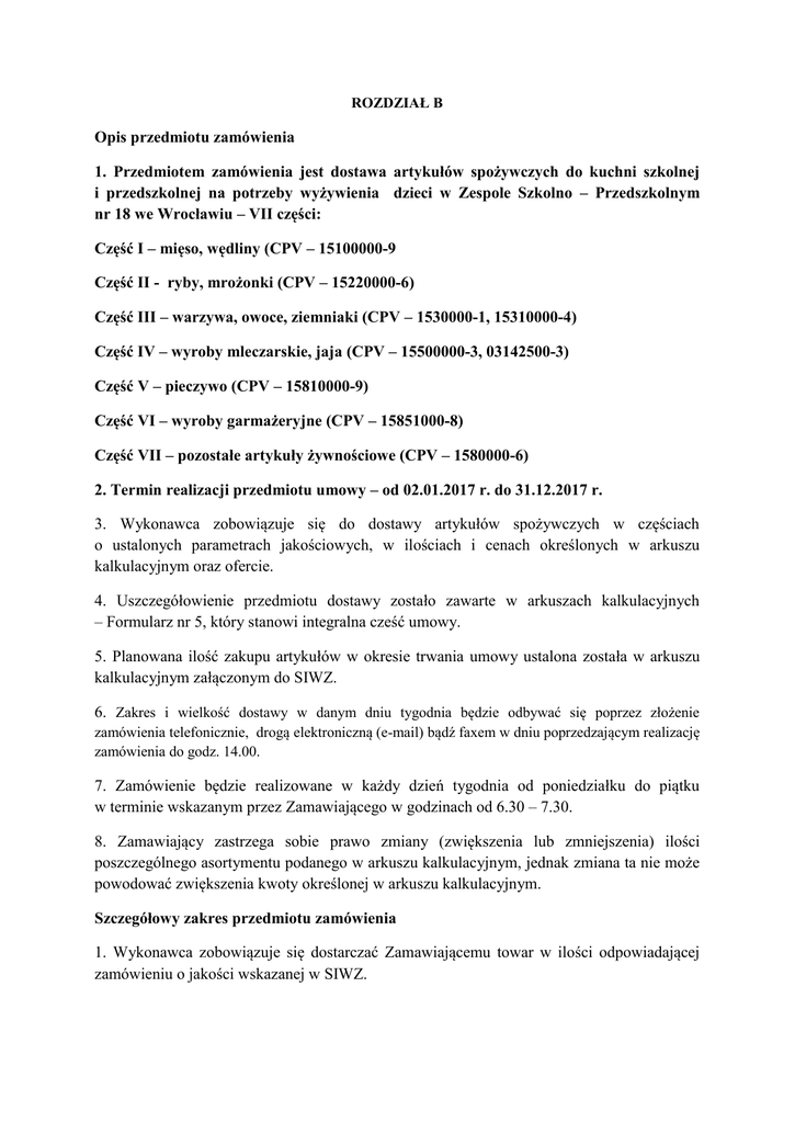 ROZDZIAŁ B Opis przedmiotu zamówienia 1. Przedmiotem zamówienia jest dostawa artykułów spożywczych do kuchni szkolnej i przedszkolnej na potrzeby wyżywienia dzieci w Zespole Szkolno – Przedszkolnym nr 18 we Wrocławiu – VII części: Część I – mięso, wędliny (CPV – 15100000-9 Część II - ryby, mrożonki (CPV – 15220000-6) Część III – warzywa, owoce, ziemniaki (CPV – 1530000-1, 15310000-4) Część IV – wyroby mleczarskie, jaja (CPV – 15500000-3, 03142500-3) Część V – pieczywo (CPV – 15810000-9) Część VI – wyroby garmażeryjne (CPV – 15851000-8) Część VII – pozostałe artykuły żywnościowe (CPV – 1580000-6) 2. Termin realizacji przedmiotu umowy – od 02.01.2017 r. do 31.12.2017 r. 3. Wykonawca zobowiązuje się do dostawy artykułów spożywczych w częściach o ustalonych parametrach jakościowych, w ilościach i cenach określonych w arkuszu kalkulacyjnym oraz ofercie. 4. Uszczegółowienie przedmiotu dostawy zostało zawarte w arkuszach kalkulacyjnych – Formularz nr 5, który stanowi integralna cześć umowy. 5. Planowana ilość zakupu artykułów w okresie trwania umowy ustalona została w arkuszu kalkulacyjnym załączonym do SIWZ. 6. Zakres i wielkość dostawy w danym dniu tygodnia będzie odbywać się poprzez złożenie zamówienia telefonicznie, drogą elektroniczną (e-mail) bądź faxem w dniu poprzedzającym realizację zamówienia do godz. 14.00. 7. Zamówienie będzie realizowane w każdy dzień tygodnia od poniedziałku do piątku w terminie wskazanym przez Zamawiającego w godzinach od 6.30 – 7.30. 8. Zamawiający zastrzega sobie prawo zmiany (zwiększenia lub zmniejszenia) ilości poszczególnego asortymentu podanego w arkuszu kalkulacyjnym, jednak zmiana ta nie może powodować zwiększenia kwoty określonej w arkuszu kalkulacyjnym. Szczegółowy zakres przedmiotu zamówienia 1. Wykonawca zobowiązuje się dostarczać Zamawiającemu towar w ilości odpowiadającej zamówieniu o jakości wskazanej w SIWZ. 2. Wykonawca zabezpieczy należycie towar na czas przewozu (opakowania, pojemniki przystosowane do przewozu danego asortymentu) i ponosi całkowitą odpowiedzialność za dostawę i jakość towaru. 3. Wykonawca będzie dostarczać towar Zamawiającemu własnym transportem i ponosi odpowiedzialność za braki i wady powstałe w czasie transportu. 4. Towar dostarczony przez Wykonawcę zawsze będzie pierwszego gatunku oraz dostarczony asortyment winien być dobrej jakości oraz spełniać w zależności od zaoferowanej przez Wykonawcę części zamówienia wymagania wynikające z obowiązujących przepisów prawa w szczególności w: - Ustawie z dnia 25.08.2006 r. o bezpieczeństwie żywności i żywienia (Dz. U. z 2015 r., poz. 594) w tym HACCP; - Ustawie z dnia 21.12.2000 r. o jakości handlowej artykułów rolno – spożywczych (Dz. U. z 2014 r., poz. 669); - Ustawie z dnia 16.12.2005 r. o produktach pochodzenia zwierzęcego (Dz. U. z 2014 r., poz. 1577); - Rozporządzeniu (WE) 852/2004 Parlamenty Europejskiego i Rady z dnia 29.04.2004 r. w sprawie higieny środków spożywczych (Dz. Urz. UE L 139, 30/04/2004); - Rozporządzeniu Ministra Rolnictwa i Rozwoju Wsi z dnia 10.07.2007 r. w sprawie znakowania środków spożywczych (Dz.U. z 2007 r. Nr 137, poz. 966 z późn. zm.). Wszyscy pracownicy Wykonawcy mający bezpośredni kontakt z dostarczaną na rzecz Zamawiającego żywnością muszą posiadać aktualne określone przepisami o chorobach zakaźnych i zakażeniach orzeczenia lekarskie do celów sanitarno – epidemiologicznych o braku przeciwskazań do wykonywania pracy przy wykonywaniu których istnieje możliwość przeniesienia zakażenia na inne osoby. Wykonawca zobowiązuje się do okazania w razie potrzeby wszystkich niezbędnych badań Zamawiającemu. 5. Zamawiający zobowiązuje się niezwłocznie przy odbiorze zamówionej partii towaru sprawdzić jego ilość i stan. 6. W przypadku dostawy wadliwych artykułów Zamawiający zastrzega sobie prawo zwrotu tych artykułów, a Wykonawca zobowiązuje się dostarczyć w tym samym dniu w ciągu 2 godzin artykułów wolnych od wad na własny koszt. 7. Jeżeli w wyniku sprawdzenia ilości i stanu Zamawiający wnosi zastrzeżenia w zakresie określonym w pkt. 1 i 2 niezwłocznie zawiadamia o tym Wykonawcę, a jeżeli wada została ujawniona w obecności przedstawiciela Wykonawcy umieszcza odpowiednią adnotację na dowodzie dostawy. 8. Jeżeli Wykonawca zamierza dokonać oględzin reklamowanej partii towaru jest zobowiązany uczynić to niezwłocznie, jednak nie później niż w ciągu 2 godzin od otrzymania zawiadomienia o wykryciu wad. 9. Jeżeli Wykonawca nie dokona oględzin w terminie podanym w pkt. 8 uważa się, ze uznał reklamację Zamawiającego. 10. W przypadku uznania reklamacji Wykonawca zobowiązuje się do natychmiastowej wymiany zakwestionowanej ilości dostarczonej partii towaru na wolną od wad, w terminie nie dłuższym niż 1 godzina. W przypadkach uzasadnionych Zamawiający może zwiększyć czas na dostarczenie towaru wolnego od wad do 24 godzin. 11. Jeżeli Wykonawca nie uznał reklamacji albo w razie niezgodności stanowisk co do oceny jakości towaru, strony niezwłocznie sporządzają protokół i pobierają próbki towaru. Pobraną próbkę wadliwego towaru Zamawiający dostarczy w ciągu 2 godzin do Stacji Sanitarno – Epidemiologicznej we Wrocławiu w celu wydania orzeczenia co do jakości dostarczonego towaru. 12. Koszt badania próbek ponosi Wykonawca gdy ocena wskazała wadliwą jakość dostarczonego towaru. 13. Wyniki ekspertyz oraz badań laboratoryjnych wiążą strony. 14. Zgodnie z Rozporządzeniem Rady (WE) nr 834/200 z dnia 28 czerwca 2007 r. w sprawie produkcji ekologicznej i znakowania produktów ekologicznych (Dz. Urz. L 189, 20.7.2007 r.) poprzez produkcję ekologiczną rozumie się ogólny system zarządzania gospodarstwem i produkcji żywności, łączącym najkorzystniejsze dla środowiska praktyki, wysoki 