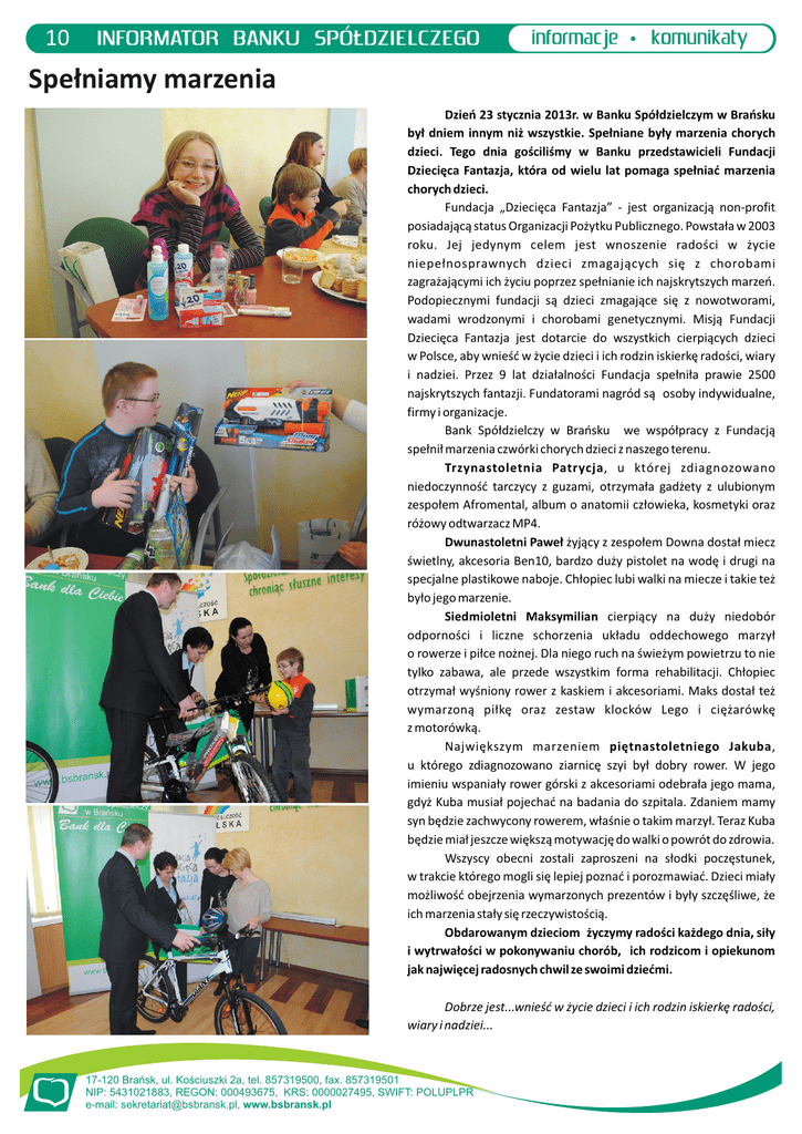 10 Spełniamy marzenia Dzień 23 stycznia 2013r. w Banku Spółdzielczym w Brańsku był dniem innym niż wszystkie. Spełniane były marzenia chorych dzieci. Tego dnia gościliśmy w Banku przedstawicieli Fundacji Dziecięca Fantazja, która od wielu lat pomaga spełniać marzenia chorych dzieci. Fundacja „Dziecięca Fantazja” - jest organizacją non-profit posiadającą status Organizacji Pożytku Publicznego. Powstała w 2003 roku. Jej jedynym celem jest wnoszenie radości w życie niepełnosprawnych dzieci zmagających się z chorobami zagrażającymi ich życiu poprzez spełnianie ich najskrytszych marzeń. Podopiecznymi fundacji są dzieci zmagające się z nowotworami, wadami wrodzonymi i chorobami genetycznymi. Misją Fundacji Dziecięca Fantazja jest dotarcie do wszystkich cierpiących dzieci w Polsce, aby wnieść w życie dzieci i ich rodzin iskierkę radości, wiary i nadziei. Przez 9 lat działalności Fundacja spełniła prawie 2500 najskrytszych fantazji. Fundatorami nagród są osoby indywidualne, firmy i organizacje. Bank Spółdzielczy w Brańsku we współpracy z Fundacją spełnił marzenia czwórki chorych dzieci z naszego terenu. Trzynastoletnia Patrycja, u której zdiagnozowano niedoczynność tarczycy z guzami, otrzymała gadżety z ulubionym zespołem Afromental, album o anatomii człowieka, kosmetyki oraz różowy odtwarzacz MP4. Dwunastoletni Paweł żyjący z zespołem Downa dostał miecz świetlny, akcesoria Ben10, bardzo duży pistolet na wodę i drugi na specjalne plastikowe naboje. Chłopiec lubi walki na miecze i takie też było jego marzenie. Siedmioletni Maksymilian cierpiący na duży niedobór odporności i liczne schorzenia układu oddechowego marzył o rowerze i piłce nożnej. Dla niego ruch na świeżym powietrzu to nie tylko zabawa, ale przede wszystkim forma rehabilitacji. Chłopiec otrzymał wyśniony rower z kaskiem i akcesoriami. Maks dostał też wymarzoną piłkę oraz zestaw klocków Lego i ciężarówkę z motorówką. Największym marzeniem piętnastoletniego Jakuba, u którego zdiagnozowano ziarnicę szyi był dobry rower. W jego imieniu wspaniały rower górski z akcesoriami odebrała jego mama, gdyż Kuba musiał pojechać na badania do szpitala. Zdaniem mamy syn będzie zachwycony rowerem, właśnie o takim marzył. Teraz Kuba będzie miał jeszcze większą motywację do walki o powrót do zdrowia. Wszyscy obecni zostali zaproszeni na słodki poczęstunek, w trakcie którego mogli się lepiej poznać i porozmawiać. Dzieci miały możliwość obejrzenia wymarzonych prezentów i były szczęśliwe, że ich marzenia stały się rzeczywistością. Obdarowanym dzieciom życzymy radości każdego dnia, siły i wytrwałości w pokonywaniu chorób, ich rodzicom i opiekunom jak najwięcej radosnych chwil ze swoimi dziećmi. Dobrze jest...wnieść w życie dzieci i ich rodzin iskierkę radości, wiary i nadziei... 17-120 Brańsk, ul. Kościuszki 2a, tel. 857319500, fax. 857319501 NIP: 5431021883, REGON: 000493675, KRS: 0000027495, SWIFT: POLUPLPR e-mail: [email protected], www.bsbransk.pl