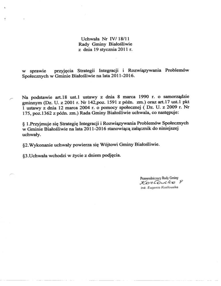Załącznik do Uchwały Nr IV/18/11 Rady Gminy Białośliwie z dn. 19 stycznia 2011 r. STRATEGIA INTEGRACJI I ROZWIĄZYWANIA PROBLEMÓW SPOŁECZNYCH W GMINIE BIAŁOŚLIWIE NA LATA 2011-2016 Spis treści: str. Wprowadzenie…………………………………………………………………………………….. . 3 I. Charakterystyka Gminy Białośliwie ………………………………………………………… 4 – 8 struktura demograficzna gminy podział administracyjny gminy struktura mieszkańców gminy wg wieku migracja mieszkańców gminy przyrost naturalny w gminie podmioty gospodarcze funkcjonujące na terenie gminy ochrona zdrowia w gminie bezpieczeństwo publiczne i interwencje Policji w latach 2008-2010 oświata i nauka w gminie II. Analiza problemów i potrzeb społecznych klientów korzystających ze wsparcia GOPS w Białośliwiu. Zarys działalności Ośrodka…………………………………………9 – 19 główne problemy społeczne ubóstwo uzależnienia wydłużanie się przeciętnego czasu trwania życia bezrobocie, jego poziom i skala zjawiska w gminie w latach 2008-2010, ranking zawodów deficytowych zasoby umożliwiające rozwiązywanie problemów społecznych III. Analiza SWOT…………………………………………………………………………… 20 – 23 mocne strony słabe strony szanse zagrożenia misja wizja cel strategiczny kierunki działania cele szczegółowe Podsumowanie…………………………………………………………………………………….. 24 2 Wprowadzenie. Strategia integracji i rozwiązywania problemów społecznych jest dokumentem opracowywanym w celu podejmowania działań prowadzących do polepszenia warunków społecznych gminy Białośliwie, zgodnie z art.17 ust.1 ustawy z dnia 12 marca 2004 r. o pomocy społecznej (Dz. U. z 2009 r. Nr 175, poz.1362 z późn. zm.) oraz art.41 ust.2 ustawy z dnia 26 października 1982 r. o wychowaniu w trzeźwości i przeciwdziałaniu alkoholizmowi (Dz. U. z 2007 r. Nr 70, poz.473 z późn. zm.) umożliwiającym m.in. ubieganie się o środki zewnętrzne zwłaszcza z Europejskiego Funduszu Społecznego. Ocena Strategii Rozwiązywania Problemów Społecznych na lata 20042010 w gminie Białośliwie pozwoliła określić stan realizacji zamierzeń przyjętych w uprzednim okresie a wnioski z niej płynące wykorzystać w obecnym dokumencie. Strategia powinna stanowić podłoże do podejmowania różnorodnych inicjatyw umożliwiających przede wszystkim współdziałanie na szczeblu gminnym, powiatowym, wojewódzkim i krajowym, szeregu instytucji udzielających wsparcia osobom i rodzinom wymagającym pomocy zarówno materialnej jak i nie materialnej oraz pozwolić na zsynchronizowanie działań pomocowych. Dokument ten winien również spełniać następujące warunki : - odpowiadać na podstawowe potrzeby gminy wynikające z przeprowadzonej przez Ośrodek Pomocy Społecznej obiektywnej diagnozy społecznej, - korespondować z innymi dokumentami strategicznymi na poziomie wszystkich szczebli administracyjnych, być z nimi spójny i komplementarny, - winien być zgodny z aktualnie realizowanym modelem polityki społecznej i obowiązującymi przepisami prawa krajowego i unijnego. Niniejsza strategia jest niejako kontynuacją tej pierwszej i dlatego nie będzie się w niej powtarzać tematów nie zmieniających się od lat t.j. zadań wynikających bezpośrednio z respektowania ustawy o pomocy społecznej a jedynie te informacje, które uległy zmianie lub nie były w niej zawarte a które rzutują na obraz i sytuację społeczną gminy Białośliwie. Temu celowi posłużyły ankiety skierowane do przedstawicieli funkcjonujących na terenie gminy zakładów pracy, placówek oświatowych oraz reprezentantów środowiska lokalnego. Dokumentowi dodano słowo „ integracja” z uwagi na to, że realizacja strategii stanowić będzie wspólny wysiłek wielu instytucji i organizacji na rzecz integracji mieszkańców gminy zagrożonych przede wszystkim wykluczeniem społecznym i narażonych na marginalizację t.j. ubogich, starszych, niepełnosprawnych, uzależnionych. 3 I. Charakterystyka Gminy Białośliwie. Gmina Białośliwie jest gminą wiejską położoną w powiecie pilskim , w woj. wielkopolskim. Siedzibą gminy jest miejscowość Białośliwie. Według danych na dzień 30.X.2010 r. Gmina Białośliwie zajmuje obszar liczący 7557 hektarów - 75,57 km , który zamieszkuje 5081 osób, łącznie z zameldowanymi na pobyt czasowy. Tab.1. Struktura demograficzna gminy przedstawia się następująco: Opis Ogółem Kobiety Mężczyźni jednostka osób % osób % populacja 5078 100 2551 50,24 2527 49,76 gęstość zaludnienia 67,20 (mieszk./km²) 33,76 osób % 33,44 Według danych z 31 grudnia roku 2009 średni dochód budżetowy na mieszkańca gminy Białośliwie wynosił 2.342 zł. W skład gminy wchodzą następujące sołectwa: Białośliwie, Dworzakowo, Dębówko Nowe, Dębówko Stare, Krostkowo, Nieżychowo, Pobórka Mała, Pobórka Wielka, Tomaszewo. Gmina stanowi 5,97% powierzchni powiatu. Podział administracyjny gminy ilustruje poniższa tabela: Tab.2. Podział administracyjny gminy L.p. Sołectwo / wieś 1. 2. 3. 4. 5. 6. 7. 8. Białośliwie Dworzakowo Dębówko Nowe Dębówko Stare Krostkowo Nieżyciowo i Nieżychówko Pobórka Mała Pobórka Wielka Liczba mieszkańców 2965 245 217 61 348 692 43 389 Powierzchnia w ha 2772 249 868 167 1085 1051 148 759 4 Tomaszewo 9. 121 458 Pod względem zaludnienia gmina należy do jednostek o średniej liczbie mieszkańców, zbliżonej do średniej wojewódzkiej mieszkańców gmin wiejskich. Tab.3. Struktura mieszkańców gminy Białośliwie wg wieku – stan na 16.01.2009r. L.p. Gmina 1. Białośliwie Liczba mieszkańc ów Wiek przedprodukcyjny K M 5040 615 583 Wiek produkcyjny K M 1524 Wiek poprodukcyjny K M 1691 429 198 Tab.4. Migracja mieszkańców gminy. Rok 2005 2006 2007 2008 2009 Zameldowania na pobyt stał