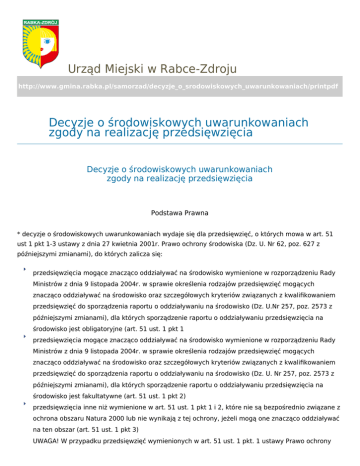 Urząd Miejski w Rabce-Zdroju http://www.gmina.rabka.pl/samorzad/decyzje_o_srodowiskowych_uwarunkowaniach/printpdf Decyzje o środowiskowych uwarunkowaniach zgody na realizację przedsięwzięcia Decyzje o środowiskowych uwarunkowaniach zgody na realizację przedsięwzięcia Podstawa Prawna * decyzje o środowiskowych uwarunkowaniach wydaje się dla przedsięwzięć, o których mowa w art. 51 ust 1 pkt 1-3 ustawy z dnia 27 kwietnia 2001r. Prawo ochrony środowiska (Dz. U. Nr 62, poz. 627 z późniejszymi zmianami), do których zalicza się: przedsięwzięcia mogące znacząco oddziaływać na środowisko wymienione w rozporządzeniu Rady Ministrów z dnia 9 listopada 2004r. w sprawie określenia rodzajów przedsięwzięć mogących znacząco oddziaływać na środowisko oraz szczegółowych kryteriów związanych z kwalifikowaniem przedsięwzięć do sporządzenia raportu o oddziaływaniu na środowisko (Dz. U.Nr 257, poz. 2573 z późniejszymi zmianami), dla których sporządzenie raportu o oddziaływaniu przedsięwzięcia na środowisko jest obligatoryjne (art. 51 ust. 1 pkt 1 przedsięwzięcia mogące znacząco oddziaływać na środowisko wymienione w rozporządzeniu Rady Ministrów z dnia 9 listopada 2004r. w sprawie określenia rodzajów przedsięwzięć mogących znacząco oddziaływać na środowisko oraz szczegółowych kryteriów związanych z kwalifikowaniem przedsięwzięć do sporządzenia raportu o oddziaływaniu na środowisko (Dz. U. Nr 257, poz. 2573 z późniejszymi zmianami), dla których sporządzenie raportu o oddziaływaniu przedsięwzięcia na środowisko jest fakultatywne (art. 51 ust. 1 pkt 2) przedsięwzięcia inne niż wymienione w art. 51 ust. 1 pkt 1 i 2, które nie są bezpośrednio związane z ochrona obszaru Natura 2000 lub nie wynikają z tej ochrony, jeżeli mogą one znacząco oddziaływać na ten obszar (art. 51 ust. 1 pkt 3) UWAGA! W przypadku przedsięwzięć wymienionych w art. 51 ust. 1 pkt. 1 ustawy Prawo ochrony środowiska, dla których raport o oddziaływaniu na środowisko sporządza się obligatoryjnie, do wniosku o wydanie decyzji o środowiskowych uwarunkowaniach należy dołączyć również raport, sporządzony zgodnie z art. 52 ustawy POS. Dla pozostałych przedsięwzięć, złożenie niniejszego wniosku (poprawnie wypełnionego) stanowi podstawę stwierdzenia przez organ o obowiązku lub o odstąpieniu od obowiązku sporządzenia raportu. 1. Opłaty: Opłaty skarbowe - na podstawie ustawy z dnia 9 września 2000r. o opłacie skarbowej (Dz. U. z 2004 Nr 253, poz. 2532 z późn. zm.) - w znaczkach skarbowych: o od wniosku – 5 zł oraz o 0,50 zł za każdy załącznik. Zwolnione od opłaty skarbowej są jednostki budżetowe, jednostki samorządu terytorialnego, organizacje pożytku publicznego oraz podania i załączniki do podań wymienione w części I załącznika do ustawy o opłacie skarbowej. Opłata administracyjna od decyzji Brak 2. Informacje dodatkowe: Decyzja o środowiskowych uwarunkowaniach zgody na realizację przedsięwzięcia nie rodzi praw do terenu inwestycji oraz nie narusza praw własności i uprawnień osób trzecich, a wnioskodawcy, który nie uzyskał praw do terenu, nie przysługuje roszczenie o zwrot nakładów poniesionych w związku z otrzymaną decyzją, Postępowania wymagające uzyskania zewnętrznych opinii uzgodnień w ramach postępowania o wydanie decyzji o środowiskowych uwarunkowaniach mogą wymagać wydłużenia czasu postępowania administracyjnego, Miejsce składania dokumentów: Urząd Miasta Rabka-Zdrój ul. Parkowa 2, 34-700 Rabka-Zdrój – sekretariat pok. nr 1. Informacja Wydział Strategii i Rozwoju Społeczno – Gospodarczego - Urząd Miasta Rabka-Zdrój ul. Parkowa 2, 34-700 Rabka-Zdrój pok. nr 14, tel. (18) 26 80 474. aby pobrać wniosek kliknij tutaj Postanowienia w sprawie raportu o oddziaływanie przedmiotowych inwestycji na środowisko: chodnik Krakowska kanalizacja Ponic i Rdzawki - etap I kanalizacja Ponic i Rdzawki - etap II kanalizacja Ponic i Rdzawki - etap III kanalizacja Ponic i Rdzawki - etap IV kanalizacja Ponic i Rdzawki - etap V przebudowa drogi Sądecka Informacje o wnioskach w sprawie wydania dezycji o środowiskowych uwarunkowaniach zgody na realizację przedsięwzięcia: 1. Zmiana sposobu użytkowania istniejących lagun osadowych (dwie laguny) z funkcji składowiska osadu na cele kompostowania i magazynowania surowców i gotowych produktów z wykorzystaniem dla potrzeb istniejących oczyszczalni ścieków 2. Rozbudowa stacji bazowej telefonii komórkowej operatora sieci Era nr BTS 57184 zlokalizowanej na budynku szkoły przy ul. Kościuszki 9 w Rabce-Zdroju na działce 3517/1 3. Wymiana anten na inny typ na stacji telefonii komórkowej, wieży zlokalizowanej w Rdzawce – stacja bazowa 5464 Rdzawka Decyzje o środowiskowych uwarunkowaniach zgody na realizację przedsięwzięcia: 1. Budowa budynku produkcyjno – usługowego /produkcja folii polietylenowej z granulatu PE/ wraz z drogą wewnętrzną, budowa przyłączy sieci infrastruktury technicznej /przyłącz sieci energetycznej z istniejącej sieci na działce, wodociągu z projektowanej studni oraz sieci kanalizacji sanitarnej do projektowanego zbiornika na działce/ oraz budowa parkingu dla samochodów dostawczych i osobowych 2. Kanalizacja sanitarna dla Ponic i Rdzawki – etap II – miejscowość Ponice od Traczykówki do szkoły 3. Kanalizacja sanitarna dla Ponic i Rdzawki – etap III – odcinek od szkoły podstawowej do przysiółka Polana, Pankówka, Gładyszówka w Ponicach 4. Kanalizacja sanitarna dla Ponic i Rdzawki – etap IV – odcinek od granicy z Ponicami do szkoły podstawowej w Rdzawce 5. Kanalizacja sanitarna dla Ponic i Rdzawki – etap V – odcinek od szkoły podstawowej w Rdzawce do osiedla przy drodze Krajowej Kraków –Zakopane 6. Przebudowa Drogi powiatowej K1668 (dawny nr 95A ul. Sądecka w Rabce), odc. Od 2+ 100.00 do 3+320.00, wraz z przebudową mostu na potoku Słonka publicznego