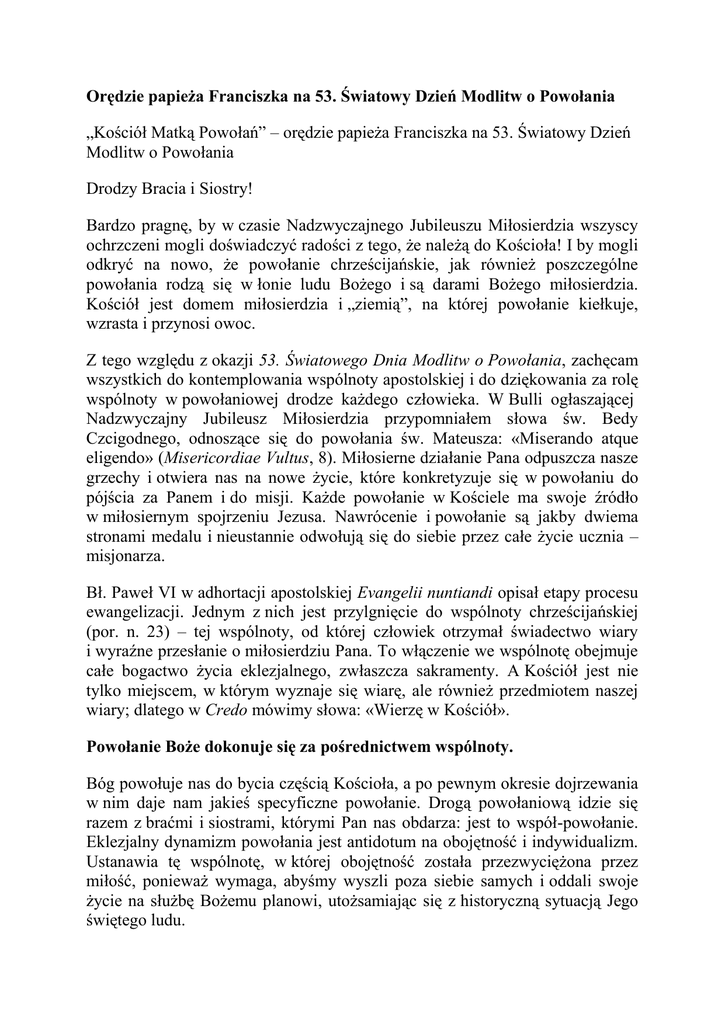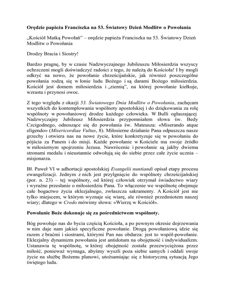 Orędzie papieża Franciszka na 53. Światowy Dzień Modlitw o Powołania „Kościół Matką Powołań” – orędzie papieża Franciszka na 53. Światowy Dzień Modlitw o Powołania Drodzy Bracia i Siostry! Bardzo pragnę, by w czasie Nadzwyczajnego Jubileuszu Miłosierdzia wszyscy ochrzczeni mogli doświadczyć radości z tego, że należą do Kościoła! I by mogli odkryć na nowo, że powołanie chrześcijańskie, jak również poszczególne powołania rodzą się w łonie ludu Bożego i są darami Bożego miłosierdzia. Kościół jest domem miłosierdzia i „ziemią”, na której powołanie kiełkuje, wzrasta i przynosi owoc. Z tego względu z okazji 53. Światowego Dnia Modlitw o Powołania, zachęcam wszystkich do kontemplowania wspólnoty apostolskiej i do dziękowania za rolę wspólnoty w powołaniowej drodze każdego człowieka. W Bulli ogłaszającej Nadzwyczajny Jubileusz Miłosierdzia przypomniałem słowa św. Bedy Czcigodnego, odnoszące się do powołania św. Mateusza: «Miserando atque eligendo» (Misericordiae Vultus, 8). Miłosierne działanie Pana odpuszcza nasze grzechy i otwiera nas na nowe życie, które konkretyzuje się w powołaniu do pójścia za Panem i do misji. Każde powołanie w Kościele ma swoje źródło w miłosiernym spojrzeniu Jezusa. Nawrócenie i powołanie są jakby dwiema stronami medalu i nieustannie odwołują się do siebie przez całe życie ucznia – misjonarza. Bł. Paweł VI w adhortacji apostolskiej Evangelii nuntiandi opisał etapy procesu ewangelizacji. Jednym z nich jest przylgnięcie do wspólnoty chrześcijańskiej (por. n. 23) – tej wspólnoty, od której człowiek otrzymał świadectwo wiary i wyraźne przesłanie o miłosierdziu Pana. To włączenie we wspólnotę obejmuje całe bogactwo życia eklezjalnego, zwłaszcza sakramenty. A Kościół jest nie tylko miejscem, w którym wyznaje się wiarę, ale również przedmiotem naszej wiary; dlatego w Credo mówimy słowa: «Wierzę w Kościół». Powołanie Boże dokonuje się za pośrednictwem wspólnoty. Bóg powołuje nas do bycia częścią Kościoła, a po pewnym okresie dojrzewania w nim daje nam jakieś specyficzne powołanie. Drogą powołaniową idzie się razem z braćmi i siostrami, którymi Pan nas obdarza: jest to współ-powołanie. Eklezjalny dynamizm powołania jest antidotum na obojętność i indywidualizm. Ustanawia tę wspólnotę, w której obojętność została przezwyciężona przez miłość, ponieważ wymaga, abyśmy wyszli poza siebie samych i oddali swoje życie na służbę Bożemu planowi, utożsamiając się z historyczną sytuacją Jego świętego ludu. W tym Dniu, poświęconym modlitwie o powołania, pragnę zachęcić wszystkich wiernych do wzięcia na siebie odpowiedzialności za pielęgnowanie i rozeznawanie powołań. Kiedy apostołowie szukali kogoś, kto by zastąpił Judasza Iskariotę, św. Piotr zgromadził stu dwudziestu braci (por. Dz 1, 15); a gdy trzeba było wybrać siedmiu diakonów, zwołano grupę uczniów (por. Dz 6, 2). Św. Paweł wskazuje Tytusowi precyzyjne kryteria wyboru prezbiterów (por. Tt 1, 5-9). Również dzisiaj wspólnota chrześcijańska jest zawsze obecna, gdy rodzą się powołania, w czasie ich kształtowania się i ich trwania (por. adhort. apost. Evangelii gaudium, 107). Powołanie rodzi się w Kościele. Od chwili pojawienia się powołania potrzebny jest odpowiedni „zmysł” Kościoła. Nikt nie jest powołany wyłącznie dla jakiegoś określonego regionu ani dla jakiejś grupy czy ruchu kościelnego, ale dla Kościoła i dla świata. «Jasnym znakiem autentyczności jakiegoś charyzmatu jest jego eklezjalność, jego zdolność do harmonijnego włączenia się w życie świętego Ludu Bożego dla dobra wszystkich» (tamże, 130). Odpowiadając na Boże powołanie, młody człowiek widzi, jak poszerza się jego postrzeganie Kościoła, może lepiej rozważyć rozliczne charyzmaty i tym samym dokonać bardziej obiektywnego rozeznania. W ten sposób wspólnota staje się domem i rodziną, gdzie rodzi się powołanie. Kandydat z wdzięcznością przyjmuje tę mediację wspólnoty, traktując ją jako element nieodzowny dla jego przyszłości; uczy się poznawać i kochać braci i siostry, którzy idą innymi niż jego drogami, a powstałe więzi umacniają we wszystkich ducha wspólnoty. Powołanie wzrasta w Kościele. W czasie procesu formacji kandydaci mający różne powołania winni coraz lepiej poznawać wspólnotę eklezjalną, przezwyciężając ograniczoną wizję, jaką wszyscy mamy na początku. W tym celu przydatne jest jakieś doświadczenie pracy apostolskiej razem z innymi członkami wspólnoty, na przykład: głoszenie przesłania chrześcijańskiego u boku dobrego katechisty; ewangelizowanie peryferii razem z jakąś wspólnotą religijną; odkrywanie skarbu kontemplacji w doświadczeniu życia klauzurowego; lepsze poznanie misji ad gentes w kontakcie z misjonarzami; głębsze poznanie duszpasterstwa w parafii i diecezji wraz z księżmi diecezjalnymi. Dla tych, którzy już odbywają formację, wspólnota eklezjalna zawsze pozostaje podstawowym środowiskiem formacyjnym, wobec którego odczuwają wdzięczność. Powołanie jest wspierane przez Kościół. Po dokonaniu zasadniczego wyboru droga powołaniowa w Kościele nie kończy się, lecz realizuje się w dyspozycyjności do służby, w wytrwałości i w formacji permanentnej. Ten kto poświęcił własne życie Panu, jest gotowy służyć Kościołowi tam, gdzie on tego potrzebuje. Misja Pawła i Barnaby jest przykładem tej eklezjalnej dyspozycyjności. Posłani na misje przez Ducha Świętego i przez wspólnotę Antiochii (por. Dz 13, 1-4), powrócili do tej samej wspólnoty i opowiedzieli o tym, co Pan przez nich zdziałał (por. Dz 14, 27). Misjonarzom towarzyszy i wspiera ich wspólnota chrześcijańska, która jest życiowym punktem odniesienia, niczym widzialna ojczyzna, która zapewnia bezpieczeństwo tym, którzy pielgr