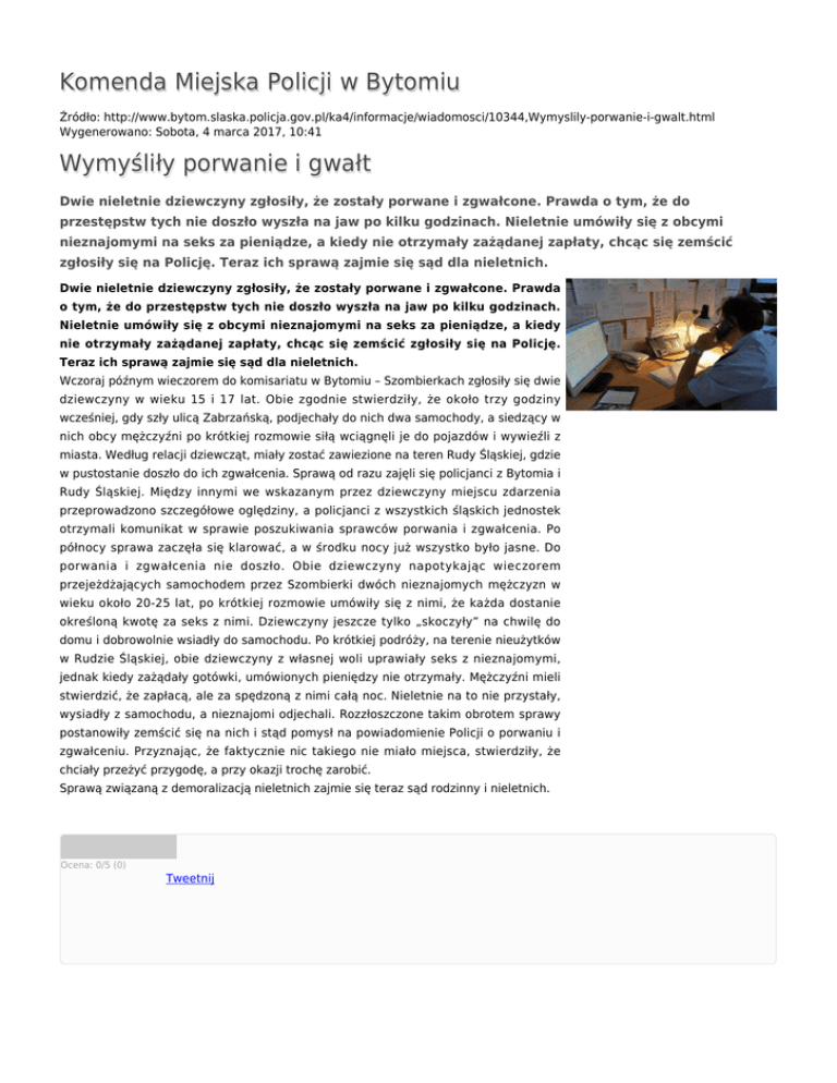 Komenda Miejska Policji w Bytomiu Źródło: http://www.bytom.slaska.policja.gov.pl/ka4/informacje/wiadomosci/10344,Wymyslily-porwanie-i-gwalt.html Wygenerowano: Sobota, 4 marca 2017, 10:41 Wymyśliły porwanie i gwałt Dwie nieletnie dziewczyny zgłosiły, że zostały porwane i zgwałcone. Prawda o tym, że do przestępstw tych nie doszło wyszła na jaw po kilku godzinach. Nieletnie umówiły się z obcymi nieznajomymi na seks za pieniądze, a kiedy nie otrzymały zażądanej zapłaty, chcąc się zemścić zgłosiły się na Policję. Teraz ich sprawą zajmie się sąd dla nieletnich. Dwie nieletnie dziewczyny zgłosiły, że zostały porwane i zgwałcone. Prawda o tym, że do przestępstw tych nie doszło wyszła na jaw po kilku godzinach. Nieletnie umówiły się z obcymi nieznajomymi na seks za pieniądze, a kiedy nie otrzymały zażądanej zapłaty, chcąc się zemścić zgłosiły się na Policję. Teraz ich sprawą zajmie się sąd dla nieletnich. Wczoraj późnym wieczorem do komisariatu w Bytomiu – Szombierkach zgłosiły się dwie dziewczyny w wieku 15 i 17 lat. Obie zgodnie stwierdziły, że około trzy godziny wcześniej, gdy szły ulicą Zabrzańską, podjechały do nich dwa samochody, a siedzący w nich obcy mężczyźni po krótkiej rozmowie siłą wciągnęli je do pojazdów i wywieźli z miasta. Według relacji dziewcząt, miały zostać zawiezione na teren Rudy Śląskiej, gdzie w pustostanie doszło do ich zgwałcenia. Sprawą od razu zajęli się policjanci z Bytomia i Rudy Śląskiej. Między innymi we wskazanym przez dziewczyny miejscu zdarzenia przeprowadzono szczegółowe oględziny, a policjanci z wszystkich śląskich jednostek otrzymali komunikat w sprawie poszukiwania sprawców porwania i zgwałcenia. Po północy sprawa zaczęła się klarować, a w środku nocy już wszystko było jasne. Do porwania i zgwałcenia nie doszło. Obie dziewczyny napotykając wieczorem przejeżdżających samochodem przez Szombierki dwóch nieznajomych mężczyzn w wieku około 20-25 lat, po krótkiej rozmowie umówiły się z nimi, że każda dostanie określoną kwotę za seks z nimi. Dziewczyny jeszcze tylko „skoczyły” na chwilę do domu i dobrowolnie wsiadły do samochodu. Po krótkiej podróży, na terenie nieużytków w Rudzie Śląskiej, obie dziewczyny z własnej woli uprawiały seks z nieznajomymi, jednak kiedy zażądały gotówki, umówionych pieniędzy nie otrzymały. Mężczyźni mieli stwierdzić, że zapłacą, ale za spędzoną z nimi całą noc. Nieletnie na to nie przystały, wysiadły z samochodu, a nieznajomi odjechali. Rozzłoszczone takim obrotem sprawy postanowiły zemścić się na nich i stąd pomysł na powiadomienie Policji o porwaniu i zgwałceniu. Przyznając, że faktycznie nic takiego nie miało miejsca, stwierdziły, że chciały przeżyć przygodę, a przy okazji trochę zarobić. Sprawą związaną z demoralizacją nieletnich zajmie się teraz sąd rodzinny i nieletnich. Ocena: 0/5 (0) Tweetnij