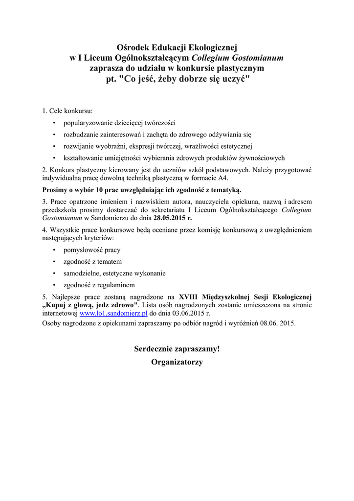 Ośrodek Edukacji Ekologicznej w I Liceum Ogólnokształcącym Collegium Gostomianum zaprasza do udziału w konkursie plastycznym pt. "Co jeść, żeby dobrze się uczyć" 1. Cele konkursu: • popularyzowanie dziecięcej twórczości • rozbudzanie zainteresowań i zachęta do zdrowego odżywiania się • rozwijanie wyobraźni, ekspresji twórczej, wrażliwości estetycznej • kształtowanie umiejętności wybierania zdrowych produktów żywnościowych 2. Konkurs plastyczny kierowany jest do uczniów szkół podstawowych. Należy przygotować indywidualną pracę dowolną techniką plastyczną w formacie A4. Prosimy o wybór 10 prac uwzględniając ich zgodność z tematyką. 3. Prace opatrzone imieniem i nazwiskiem autora, nauczyciela opiekuna, nazwą i adresem przedszkola prosimy dostarczać do sekretariatu I Liceum Ogólnokształcącego Collegium Gostomianum w Sandomierzu do dnia 28.05.2015 r. 4. Wszystkie prace konkursowe będą oceniane przez komisję konkursową z uwzględnieniem następujących kryteriów: • pomysłowość pracy • zgodność z tematem • samodzielne, estetyczne wykonanie • zgodność z regulaminem 5. Najlepsze prace zostaną nagrodzone na XVIII Międzyszkolnej Sesji Ekologicznej „Kupuj z głową, jedz zdrowo". Lista osób nagrodzonych zostanie umieszczona na stronie internetowej www.lo1.sandomierz.pl do dnia 03.06.2015 r. Osoby nagrodzone z opiekunami zapraszamy po odbiór nagród i wyróżnień 08.06. 2015. Serdecznie zapraszamy! Organizatorzy