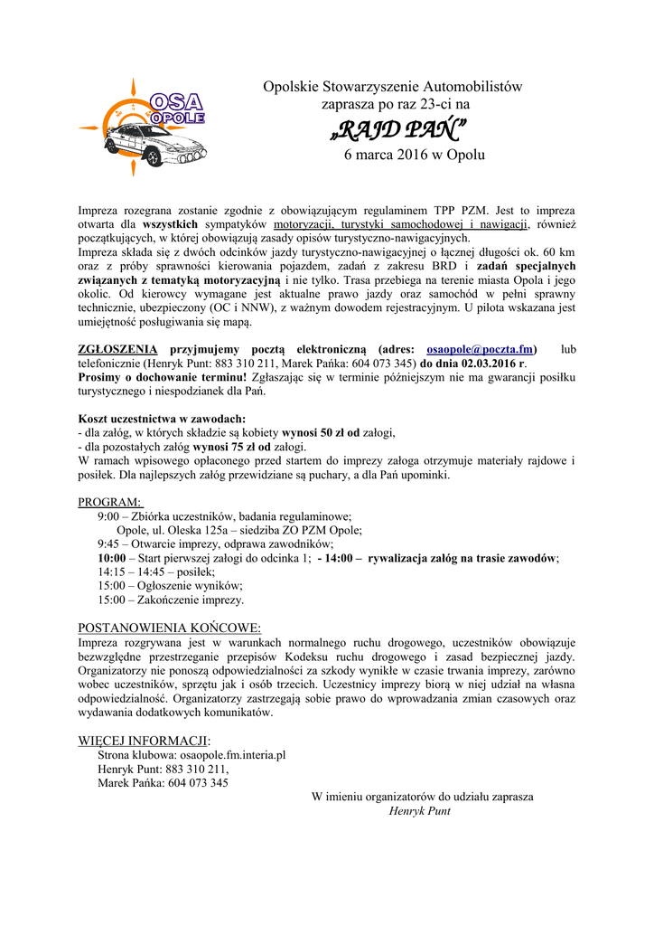 Opolskie Stowarzyszenie Automobilistów zaprasza po raz 23-ci na „RAJD PAŃ” 6 marca 2016 w Opolu Impreza rozegrana zostanie zgodnie z obowiązującym regulaminem TPP PZM. Jest to impreza otwarta dla wszystkich sympatyków motoryzacji, turystyki samochodowej i nawigacji, również początkujących, w której obowiązują zasady opisów turystyczno-nawigacyjnych. Impreza składa się z dwóch odcinków jazdy turystyczno-nawigacyjnej o łącznej długości ok. 60 km oraz z próby sprawności kierowania pojazdem, zadań z zakresu BRD i zadań specjalnych związanych z tematyką motoryzacyjną i nie tylko. Trasa przebiega na terenie miasta Opola i jego okolic. Od kierowcy wymagane jest aktualne prawo jazdy oraz samochód w pełni sprawny technicznie, ubezpieczony (OC i NNW), z ważnym dowodem rejestracyjnym. U pilota wskazana jest umiejętność posługiwania się mapą. ZGŁOSZENIA przyjmujemy pocztą elektroniczną (adres: [email protected]) lub telefonicznie (Henryk Punt: 883 310 211, Marek Pańka: 604 073 345) do dnia 02.03.2016 r. Prosimy o dochowanie terminu! Zgłaszając się w terminie późniejszym nie ma gwarancji posiłku turystycznego i niespodzianek dla Pań. Koszt uczestnictwa w zawodach: - dla załóg, w których składzie są kobiety wynosi 50 zł od załogi, - dla pozostałych załóg wynosi 75 zł od załogi. W ramach wpisowego opłaconego przed startem do imprezy załoga otrzymuje materiały rajdowe i posiłek. Dla najlepszych załóg przewidziane są puchary, a dla Pań upominki. PROGRAM: 9:00 – Zbiórka uczestników, badania regulaminowe; Opole, ul. Oleska 125a – siedziba ZO PZM Opole; 9:45 – Otwarcie imprezy, odprawa zawodników; 10:00 – Start pierwszej załogi do odcinka 1; - 14:00 – rywalizacja załóg na trasie zawodów; 14:15 – 14:45 – posiłek; 15:00 – Ogłoszenie wyników; 15:00 – Zakończenie imprezy. POSTANOWIENIA KOŃCOWE: Impreza rozgrywana jest w warunkach normalnego ruchu drogowego, uczestników obowiązuje bezwzględne przestrzeganie przepisów Kodeksu ruchu drogowego i zasad bezpiecznej jazdy. Organizatorzy nie ponoszą odpowiedzialności za szkody wynikłe w czasie trwania imprezy, zarówno wobec uczestników, sprzętu jak i osób trzecich. Uczestnicy imprezy biorą w niej udział na własna odpowiedzialność. Organizatorzy zastrzegają sobie prawo do wprowadzania zmian czasowych oraz wydawania dodatkowych komunikatów. WIĘCEJ INFORMACJI: Strona klubowa: osaopole.fm.interia.pl Henryk Punt: 883 310 211, Marek Pańka: 604 073 345 W imieniu organizatorów do udziału zaprasza Henryk Punt