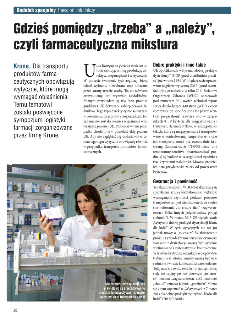 Dodatek specjalny Transport chłodniczy Gdzieś pomiędzy „trzeba” a „należy”, czyli farmaceutyczna mikstura Krone. Dla transportu produktów farmaceutycznych obowiązują wytyczne, które mogą wymagać objaśnienia. Temu tematowi zostało poświęcone sympozjum logistyki farmacji zorganizowane przez firmę Krone. U nia Europejska posiada wiele instytucji zajmujących się produkcją dyrektyw, rozporządzeń i wytycznych. W procesie tworzenia tych regulacji biorą udział wybrane, niewybrane oraz opłacane przez strony trzecie osoby. To, co wówczas otrzymujemy, jest wyraźnie niedokładne. Znanym przykładem są tzw. best practice guidelines UE dotyczące zabezpieczania ładunków. Tego typu dyrektywy nie są wiążące w rozumieniu przepisów i rozporządzeń. Ich zadanie nie zostało również wyjaśnione w literaturze prawnej UE. Ponieważ w tym przypadku chodzi o tzw. pozostałe akty prawne UE. Aby nie zagłębiać się dodatkowo w temat: tego typu wytyczne obowiązują również w przypadku transportu produktów farmaceutycznych. Dobre praktyki i inne takie UE opublikowała wytyczną „dobrej praktyki dystrybucji” (GDP, good distribution practice) już w roku 1994. W międzyczasie opracowano najpierw wytyczną GMP (good manufacturing practice), a w roku 2011 Światowa Organizacja Zdrowia (WHO) opracowała pod numerem 961 swoich technical report series dzieło liczące 440 stron „WHO expert committee on specifications for pharmaceutical preparations”. Zawiera ono w załącznikach 8 i 9 kryteria dla magazynowania i transportu farmaceutyków, w szczególności takich, które są magazynowane i transportowane w kontrolowanej temperaturze, a czas ich transportu może być ewentualnie krytyczny. Oznacza to, że TTSPPS (time- and temperature-sensitive pharmaceutical products) są badane w szczególności zgodnie z tzw. kryteriami stabilności. Mówiąc prościej: ich data przydatności zależy od powyższych kryteriów. Gwarancja i powinność Nie rozpatrujemy sytuacji, czy prawidłowo są przechowywane produkty farmaceutyczne. Uregulowany jest za to transport do apteki 28 Te załączniki raportu WHO charakteryzują się specyficzną sztuką formułowania: większość wymaganych czynności podczas procesów transportowych jest nieodzownych na skutek sformułowania „to ensure that” (zagwarantować). Kilka innych jedynie należy podjąć („should”). W marcu 2013 UE wydała swoje „Wytyczne dobrej praktyki dystrybucji leków dla ludzi”. W tych wytycznych nie ma już jednak mowy o „to ensure”. W tłumaczeniu punkt 1.1 (zasada) brzmi: wszystkie czynności związane z dystrybucją muszą być wyraźnie zdefiniowane i systematycznie kontrolowane. Wszystkie krytyczne odcinki przebiegów dystrybucji oraz istotne zmiany muszą być uzasadnione i w razie konieczności zatwierdzone. Tutaj nasz sprawozdawca firmy transportowej staje się czujny po raz pierwszy: „to ensure” oznacza „zagwarantować coś”, natomiast „should” oznacza jedynie „powinien”. Można się z tym zapoznać w „Wytycznych z 7 marca 2013 dla dobrej praktyki dystrybucji leków dla ludzi” (2013/C 68/01). W praktyce farmaceutów mniej interesują tego typu politycznie wynegocjowane wytyczne. Przez dziesięciolecia inne gałęzie produkcji, takie jak chemia, metal i elektrotechnika rozwinęły odpowiednie metody zapewnienia jakości. Analiza rodzajów i skutków możliwych błędów (FMEA) jest metodą, która była najpierw wykorzystywana przez US Army, a następnie została doprowadzona do perfekcji przez NASA, a jej celem jest rozpoznanie i usunięcie problemów już podczas konstrukcji, a następnie w produkcji wyrobów. NASA zawdzięczamy zresztą również koncept HACCP, którego zadaniem jest wyeliminowanie możliwości zanieczyszczenia artykułów spożywczych niepożądanymi substancjami. Dziś już wiemy: w pięciu krokach, od projektu wyrobu poprzez ocenę, analizę, produkcję i wykrywanie błędów koszty usunięcia błędów zwiększają się dziesięciokrotnie, czym później zostaną one wykryte. Farmaceuci są pod tym względem jeszcze bardziej wyczuleni, ponieważ są oni wstępnymi dostawcami leków dla człowieka. Muszą oni stosować najsurowsze przepisy zapewnienia jakości już podczas kupowania swoich produktów wstępnych, które zostają następnie doprecyzowane podczas produkcji. Wówczas powstaje pytanie: co dzieje się podczas magazynowania i transportu? Tutaj wykazano największe deficyty. Pharmaserv Aby wyjaśnić, dlaczego farmaceuci stosują obecnie precyzyjne wytyczne dla logistyków, należy wiedzieć, gdzie przedsiębiorstwa te powstały. Pharmaserv w Marburgu tak samo, jak Infraserv we Frankfurcie jest obszarem przedsiębiorstw techniki budynków i logistyki, które powstały podczas rozpadu Przez dziesięciolecia inne gałęzie produkcji, takie jak chemia, metal i elektrotechnika rozwinęły odpowiednie metody zapewnienia jakości Frankfurter Höchst AG na wiele oddzielnych przedsiębiorstw przed 20 laty. Podczas gdy Infraserv zajmuje się logistyką chemii za pomocą swoich wagonów cystern, samochodów cystern i statków, Pharmaserv zajmuje się niemal wyłącznie techniką budynków oraz logistyką byłych zakładów Beringwerke w Marburgu, czyli tabletek, szczepionek i innych rodzajów serum. Większość z tych produktów należy podzielić na trzy strefy temperaturowe: do 25ºC, do 7ºC oraz głęboko chłodzone do -25ºC. Pharmaserv oferuje nie tylko budynki i zarządzanie budynkami dla przedsiębiorstw farmaceutycznych, ale również logistykę zakładową i pozazakładową. Należy pod tym pojęciem rozumieć dostarczanie produktów wstępnych, jak również transport gotowych produktów. Przedsiębiorstwo posiada własny park maszyn pojazdów typu solo z walizkamichłodniami oraz samochód Atego z wózkiem podnoszącym Ruthmann typu Cargoloader. Jedna rzecz rzuca się w oczy podczas jazdy po dwóch zakładach na północ od Marburga: Farm