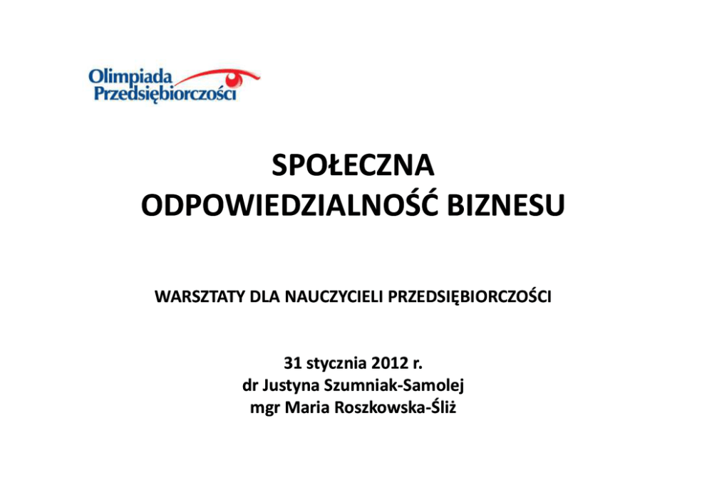 SPOŁECZNA ODPOWIEDZIALNOŚĆ BIZNESU WARSZTATY DLA NAUCZYCIELI PRZEDSIĘBIORCZOŚCI 31 stycznia 2012 r. dr Justyna SzumniakSzumniak-Samolej mgr Maria RoszkowskaRoszkowska-Śliż 5. BIZNES A RYNEK: DOSTAWCY Łańcuch dostaw ≈ łańcuch wartości Producent surowca Dostawca II rzędu Dostawca I rzędu Sprzedawca/ marketer Dystrybutor FIRMA KONSUMENT Dostawca usług posprzedażowych Recykling/ utylizacja JAK DALEKO SIĘGA ODPOWIEDZIALNOŚĆ FIRMY ZA JEJ ŁAŃCUCH DOSTAW? Obszary relacji w łańcuchu dostaw 1. Kwestie ekonomiczne 2. Kwestie społeczne 3. Kwestie ekologiczne Kwestie ekonomiczne • • • • Kondycja finansowa dostawców Niezawodność dostawców Poziom uzależnienia dostawców Niesprawiedliwe i nieracjonalne warunki kontraktów – Warunki płatności – Cena • Różnorodność dostawców – Lokalni dostawcy – SME – Mniejszości społeczne (co najmniej 51% w strukturze własności) • Łapówki i korupcja Kwestie społeczne • • • • • • • • • MOP Wolność stowarzyszeń Deklaracja Zniesienie praca przymusowej podstawowych Likwidacja pracy dzieci zasad i praw w Likwidacja dyskryminacji w zatrudnieniu pracy Godziwa płaca (tzw. living wage) Godziny pracy Warunki pracy (w tym kwestie zdrowia i bezpieczeństwa) Zabezpieczenie socjalne Przeciwdziałanie niekorzystny wpływom na społeczność lokalną Kwestie środowiska naturalnego • • • • • • Emisja CO2 i innych gazów cieplarnianych Incydentalne zanieczyszczenia środowiska Szkody w bioróżnorodności Zużycie wody i innych surowców Efektywność energetyczna Gospodarka odpadami Konieczne spojrzenie na cały cykl życia produktu (wykorzystanie surowców, logistykę, charakter produktu, opakowanie, możliwości recyklingu) Poziomy zarządzania relacjami z dostawcami Współpraca Budowanie potencjału Kontrola Kontrola • Standardy/ kodeksy postępowania – odzwierciedlenie rzeczywistych, indywidualnych potrzeb firmy oraz jej otoczenia – odwołanie do autorytetów – porozumienia branżowe – projektowane w porozumieniu z różnymi grupami interesariuszy, w tym organizacjami pozarządowymi, społecznościami i władzami lokalnymi oraz dostawcami • Monitoring/audyt – – – – audyt wewnętrzny lub zewnętrzny zapowiedzi audytów, częstotliwość kontakt z pracownikami dostawców komunikacja wyników Pomorska Spółka Gazownictwa • Zaprezentuj się odpowiedzialnie: opracowanie i wdrożenie zasad postępowania przy dokonywaniu zakupów upominków firmowych • Upominki firmowe powinny być m.in. ekologiczne, czyli wyprodukowane w technologii przyjaznej dla środowiska, przy użyciu materiałów naturalnych i nadających się do recyklingu, wyprodukowane w Polsce np. na obszarze działania spółki oraz bezpieczne dla zdrowia i życia ludzkiego, powinny posiadać specjalne certyfikaty i atesty. Budowanie potencjału • Jasna i przejrzysta komunikacji – szczególnie istotna przy implementacji standardów i w procesie oceny – przedstawienie celów i korzyści • Edukacja, szkolenia, budowanie świadomości – – – – – wsparcie przy dostosowywaniu się do standardów wsparcie przy wykryciu niezgodności z kodeksem wsparcie w optymalizacji działań dostawców zarówno kadra zarządzająca jak i pracownicy dostawców dążenie do samodzielności dostawców i ich pracowników • Pomoc finansowa – pożyczki na preferencyjnych warunkach, systemy mikropożyczek Danone • Danone Na początku działalności w Polsce problem z zabezpieczeniem dostaw mleka, którego produkcja wciąż maleje, a jego jakość nie spełniała wymogów UE. Polskie gospodarstwa były nienowoczesne i niezinformatyzowane • Podjęte działania: – szkolenia dla rolników, – gwarancja cen skupu, – system nisko- lub nieoprocentowanych pożyczek, – „Emilka pod strzechy” Cadbury Cocoa Partnership • Platforma wymiany wiedzy i doświadczeń między Cadbury, dostawcami, jak i partnerami społecznymi • System mikropożyczek i wsparcia biznesowego dla nowopowstających plantacji • Cele projektu: – odpowiedź na drastyczny spadek produktywności upraw kakao – zachęcenie do uprawy kakao nowej generacji rolników – zwiększenie zysków z upraw kakao – zabezpieczenie przyszłych British American Tobacco • Wsparcie technologiczne i szkolenia dla farmerów – zwiększenia plonów tytoniu – zabezpieczenie przyszłych dostaw • W całej grupie w latach 2000-2006 wzrost plonów o 22% Tesco „Akademia Dostawców Regionalnych” • Program bezpłatnego wsparcia lokalnych dostawców: – Możliwości współpracy z Tesco – Warsztaty „Szansa na rozwój Twojej Firmy” • Liczba dostawców lokalnych współpracujących z Tesco zwiększyła się z 235 w 2009 r. do 400 w 2010 r. • Liczba produktów regionalnych na półkach wzrosła o 105% Współpraca • Ocena satysfakcji dostawców • Tworzenie platformy wymiany doświadczeń i wiedzy: pomiędzy firmą a dostawcami pomiędzy samymi dostawcami włączenie innych interesariuszy angażowanie dostawców w proces budowania relacji w ramach całego łańcucha dostaw (ustalanie celów, wypracowanie rozwiązań) – promocja zrównoważonego rozwoju w całym łańcuchu dostaw (wśród dostawców 2-, 3- rzędu) – wspólne inicjatywy i projekty na rzecz lokalnych społeczności czy środowiska – – – – Wal Mart • Udział dostawców w grupach roboczych SVN • Współpraca z dostawcami na rzecz wprowadzania nowych zrównoważonych produktów, przy utrzymaniu wciąż niskich cen dla klientów: – wszyscy dostawcy płynów do prania rozpoczęli produkcję skoncentrowanych płynów, dzięki czemu możliwe było zredukowanie opakowań do 1/3 wielkości dotychczasowych – nowe opakowania na mleko o kwadratowym kształcie, umożliwiających przechowywanie mleka jedno na drugim bez regałów, a także bardziej efektywne wykorzystanie powierzchni załadunkowej przy transporcie (9% więcej produktu mieści się w ciężarówce)