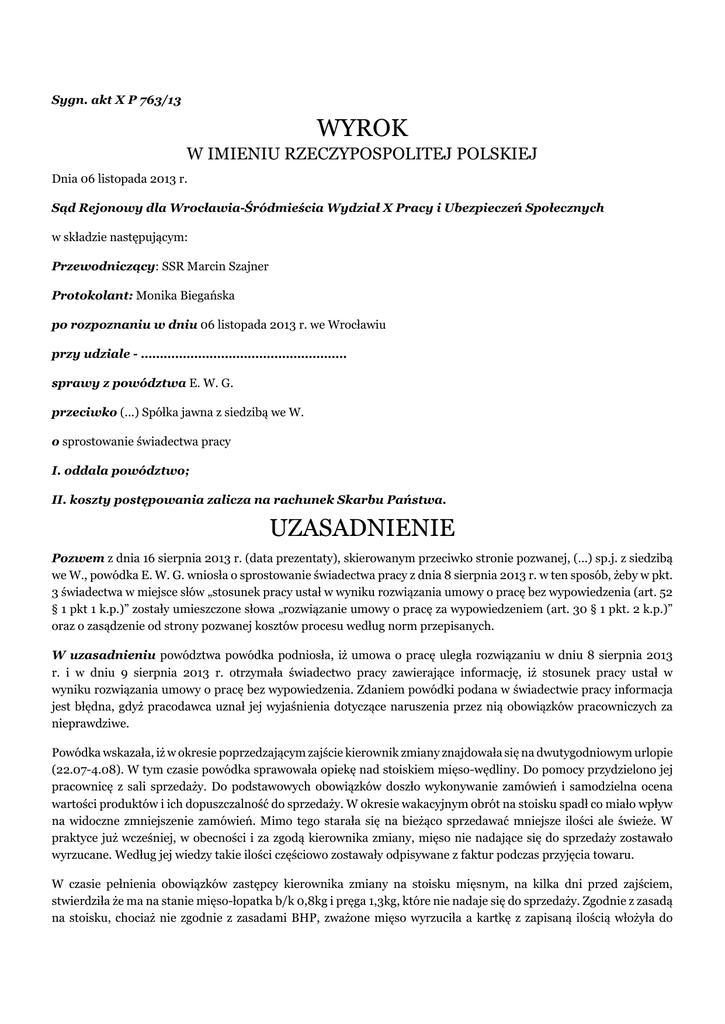 Sygn. akt X P 763/13 WYROK W IMIENIU RZECZYPOSPOLITEJ POLSKIEJ Dnia 06 listopada 2013 r. Sąd Rejonowy dla Wrocławia-Śródmieścia Wydział X Pracy i Ubezpieczeń Społecznych w składzie następującym: Przewodniczący: SSR Marcin Szajner Protokolant: Monika Biegańska po rozpoznaniu w dniu 06 listopada 2013 r. we Wrocławiu przy udziale - ……………………………………………… sprawy z powództwa E. W. G. przeciwko (...) Spółka jawna z siedzibą we W. o sprostowanie świadectwa pracy I. oddala powództwo; II. koszty postępowania zalicza na rachunek Skarbu Państwa. UZASADNIENIE Pozwem z dnia 16 sierpnia 2013 r. (data prezentaty), skierowanym przeciwko stronie pozwanej, (...) sp.j. z siedzibą we W., powódka E. W. G. wniosła o sprostowanie świadectwa pracy z dnia 8 sierpnia 2013 r. w ten sposób, żeby w pkt. 3 świadectwa w miejsce słów „stosunek pracy ustał w wyniku rozwiązania umowy o pracę bez wypowiedzenia (art. 52 § 1 pkt 1 k.p.)” zostały umieszczone słowa „rozwiązanie umowy o pracę za wypowiedzeniem (art. 30 § 1 pkt. 2 k.p.)” oraz o zasądzenie od strony pozwanej kosztów procesu według norm przepisanych. W uzasadnieniu powództwa powódka podniosła, iż umowa o pracę uległa rozwiązaniu w dniu 8 sierpnia 2013 r. i w dniu 9 sierpnia 2013 r. otrzymała świadectwo pracy zawierające informację, iż stosunek pracy ustał w wyniku rozwiązania umowy o pracę bez wypowiedzenia. Zdaniem powódki podana w świadectwie pracy informacja jest błędna, gdyż pracodawca uznał jej wyjaśnienia dotyczące naruszenia przez nią obowiązków pracowniczych za nieprawdziwe. Powódka wskazała, iż w okresie poprzedzającym zajście kierownik zmiany znajdowała się na dwutygodniowym urlopie (22.07-4.08). W tym czasie powódka sprawowała opiekę nad stoiskiem mięso-wędliny. Do pomocy przydzielono jej pracownicę z sali sprzedaży. Do podstawowych obowiązków doszło wykonywanie zamówień i samodzielna ocena wartości produktów i ich dopuszczalność do sprzedaży. W okresie wakacyjnym obrót na stoisku spadł co miało wpływ na widoczne zmniejszenie zamówień. Mimo tego starała się na bieżąco sprzedawać mniejsze ilości ale świeże. W praktyce już wcześniej, w obecności i za zgodą kierownika zmiany, mięso nie nadające się do sprzedaży zostawało wyrzucane. Według jej wiedzy takie ilości częściowo zostawały odpisywane z faktur podczas przyjęcia towaru. W czasie pełnienia obowiązków zastępcy kierownika zmiany na stoisku mięsnym, na kilka dni przed zajściem, stwierdziła że ma na stanie mięso-łopatka b/k 0,8kg i pręga 1,3kg, które nie nadaje się do sprzedaży. Zgodnie z zasadą na stoisku, chociaż nie zgodnie z zasadami BHP, zważone mięso wyrzuciła a kartkę z zapisaną ilością włożyła do szuflady na stoisku. Zdecydowała że za ten towar zapłaci sama gdyż chciała być uczciwa. W pierwszym dniu pracy po zakończonym urlopie kierownik zmiany zastała kartkę z zapisem dot. ilości mięsa w szufladzie. W tym samym dniu pracując na drugą zmianę powódka skasowała jedną pozycję mięsa, a drugą pozycję skasowała dnia następnego. Obie transakcję dokonała bez obecności kierownika. Dwa dni później tj. czwartek 08.08.2013 została poproszona przez szefa o wytłumaczenie się z zaistniałej sytuacji i okazanie paragonu skasowanych towarów. Powódka wskazała, iż jej błędem było nie zatrzymanie ich do kontroli a po odnalezieniu ich na rolkach kontrolnych okazało się że w jednej z pozycji jest brak nie odpowiadający ilości widniejącej na kartce. W zaistniałej sytuacji jej błąd uznano za przywłaszczenie całości zapisanego mięsa. Mimo tego że towar został przez nią skasowany, zapłacony i okazany szefowi na rolkach kontrolnych. W samym dniu otrzymała wypowiedzenie z pracy, mimo jej wyjaśnień szef jej nie uwierzył. Pismem z dnia 9 sierpnia 2013 r. powódka wystąpiła do pracodawcy o sprostowanie świadectwa pracy lecz nie otrzymała żadnej odpowiedzi (k. 3-4). W odpowiedzi na pozew, strona pozwana (...) sp.j. z siedzibą we W., wniosła o oddalenie powództwa w całości. W uzasadnieniu swojego stanowiska, strona pozwana zarzuciła, iż powódka została zatrudniona w dniu 6 września 2011 r., na samodzielnym stanowisku, na którym towar zostaje przygotowywany do sprzedaży, porcjowany, wykładany a następnie sprzedawany a sprzedaż ta jest rejestrowana na kasie w sklepie. W pierwszych tygodniach pracy powódka dała się poznać jako pracownik sumiennie wykonujący swoje obowiązki i ze strony kierownika stoiska nie było uwag na temat jakości jej pracy. Po upływie przepracowanego roku sytuacja ta zaczęła ulegać zmianie. Problemy dotyczyły braku należytego zachowania czystości w obrębie stoiska oraz komory chłodniczej. Kilkukrotne udzielane uwagi przez kierownika stoiska w zakresie tych niedociągnięć nie skutkowały poprawą jakości pracy w związku z czym zostały przeprowadzone rozmowy dyscyplinujące z powódką z ostrzeżeniem, że w przypadku braku reakcji dalsza współpraca będzie niemożliwa. Po przeprowadzeniu takich rozmów ostrzegawczych następowała krótkotrwała poprawa. W okresie 22 lipca 2013 r. do dnia 4 sierpnia 2013 r. kierownik stoiska przebywał na urlopie. W tym czasie część obowiązków ze względu na specyfikę z zakresu towaroznawstwa przejęła powódka. Otrzymała do pomocy pracownika z sali sprzedaży, którego obowiązkiem było utrzymanie ciągłości sprzedaży. W dniu 5 sierpnia 2013 r. powróciła do pracy kierownik sklepu w kasie sklepowej zastała kartkę z zapisem o określonej ilości dwóch rodzajów mięs. W pierwszym momencie pomyślała, że może to być informacja o jakimś braku przy dostawie i towar ten jest do oddania przez dostawcę. Dnia następnego zapytała powódkę o zapis na kartce znalezionej z kasie sklepowej, ktora wyjaśniła, że jest to towar który sobie odłożyła a następnie dokonała sprze
