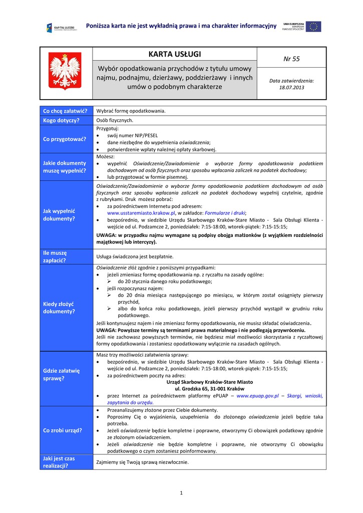Poniższa karta nie jest wykładnią prawa i ma charakter informacyjny KARTA USŁUGI Wybór opodatkowania przychodów z tytułu umowy najmu, podnajmu, dzierżawy, poddzierżawy i innych umów o podobnym charakterze Co chcę załatwić? Wybrać formę opodatkowania. Kogo dotyczy? Osób fizycznych. Co przygotować? Jakie dokumenty muszę wypełnić? Jak wypełnić dokumenty? Nr 55 Data zatwierdzenia: 18.07.2013 Przygotuj: swój numer NIP/PESEL dane niezbędne do wypełnienia oświadczenia; potwierdzenie wpłaty należnej opłaty skarbowej. Możesz: wypełnić Oświadczenie/Zawiadomienie o wyborze formy opodatkowania podatkiem dochodowym od osób fizycznych oraz sposobu wpłacania zaliczek na podatek dochodowy; lub przygotować w formie pisemnej. Oświadczenie/Zawiadomienie o wyborze formy opodatkowania podatkiem dochodowym od osób fizycznych oraz sposobu wpłacania zaliczek na podatek dochodowy wypełnij czytelnie, zgodnie z rubrykami. Druk możesz pobrać: za pośrednictwem Internetu pod adresem: www.usstaremiasto.krakow.pl, w zakładce: Formularze i druki; bezpośrednio, w siedzibie Urzędu Skarbowego Kraków-Stare Miasto - Sala Obsługi Klienta wejście od ul. Podzamcze 2, poniedziałek: 7:15-18:00, wtorek-piątek: 7:15-15:15; UWAGA: w przypadku najmu wymagane są podpisy obojga małżonków (z wyjątkiem rozdzielności majątkowej lub intercyzy). Ile muszę zapłacić? Usługa świadczona jest bezpłatnie. Kiedy złożyć dokumenty? Oświadczenie złóż zgodnie z poniższymi przypadkami: jeżeli zmieniasz formę opodatkowania np. z ryczałtu na zasady ogólne: do 20 stycznia danego roku podatkowego; jeśli rozpoczynasz najem: do 20 dnia miesiąca następującego po miesiącu, w którym został osiągnięty pierwszy przychód, albo do końca roku podatkowego, jeżeli pierwszy przychód wystąpił w grudniu roku podatkowego. Jeśli kontynuujesz najem i nie zmieniasz formy opodatkowania, nie musisz składać oświadczenia. UWAGA: Powyższe terminy są terminami prawa materialnego i nie podlegają przywróceniu. Jeśli nie zachowasz powyższych terminów, nie będziesz miał możliwości skorzystania z ryczałtowej formy opodatkowania i zostaniesz opodatkowany wyłącznie na zasadach ogólnych. Gdzie załatwię sprawę? Co zrobi urząd? Jaki jest czas realizacji? Masz trzy możliwości załatwienia sprawy: bezpośrednio, w siedzibie Urzędu Skarbowego Kraków-Stare Miasto - Sala Obsługi Klienta wejście od ul. Podzamcze 2, poniedziałek: 7:15-18:00, wtorek-piątek: 7:15-15:15; za pośrednictwem poczty na adres: Urząd Skarbowy Kraków-Stare Miasto ul. Grodzka 65, 31-001 Kraków przez Internet za pośrednictwem platformy ePUAP – www.epuap.gov.pl – Skargi, wnioski, zapytania do urzędu. Przeanalizujemy złożone przez Ciebie dokumenty. Poprosimy Cię o wyjaśnienia, uzupełnienia do złożonego oświadczenia jeżeli będzie taka potrzeba. Jeżeli oświadczenie będzie kompletne i poprawne, otworzymy Ci obowiązek podatkowy zgodnie ze złożonym oświadczeniem. Jeżeli oświadczenie nie będzie kompletne i poprawne, nie otworzymy Ci obowiązku podatkowego o czym zostaniesz poinformowany. Zajmiemy się Twoją sprawą niezwłocznie. 1 Poniższa karta nie jest wykładnią prawa i ma charakter informacyjny Jak się odwołać? W tym przypadku nie jest przewidziana droga odwoławcza. Informacje dodatkowe Podstawa prawna Forma ryczałtowa obowiązuje również w roku następnym - przychód jest opodatkowany nadal w formie ryczałtu, jeżeli do dnia 20 stycznia nie zostanie zgłoszony wybór innej formy opodatkowania. Zeznanie podatkowe PIT-28 wraz z Załącznikiem PIT-28A należy złożyć w terminie do 31 stycznia następnego roku. Kwartalny sposób opłacania podatku można wybrać składając zawiadomienie w terminie wyłącznie do 20 stycznia roku podatkowego. Kwartalny sposób opłacania podatku mogą wybrać tylko osoby które kontynuują wynajem. Małżonkowie między którymi istnieje wspólność majątkowa, osiągający przychody ze wspólnej własności, wspólnego posiadania lub wspólnego użytkowania rzeczy mogą złożyć pisemne oświadczenie o opodatkowaniu całości przychodu uzyskanego z tego tytułu przez jednego z nich: rozpoczynający - w terminie pierwszej wpłaty na ryczałt czyli do 20 dnia miesiąca następującego po miesiącu, w którym wystąpił pierwszy przychód, kontynuujący najpóźniej do 20 stycznia roku podatkowego Uwaga: powyższe oświadczenie obowiązuje tylko na dany rok podatkowy. Brak obowiązku prowadzenia ewidencji przychodów - pod warunkiem, że wysokość przychodów wynika z umowy zawartej w formie pisemnej. Ustawa z dnia 20 listopada 1998r. o zryczałtowanym podatku dochodowym od niektórych przychodów osiąganych przez osoby fizyczne (Dz. U. z 1998r. Nr 144, poz. 930 ze zm.) Ustawa z dnia 29 sierpnia 1997r. Ordynacja podatkowa (t.j. Dz. U. z 2012r. poz. 749 ze zm.). Ustawa z dnia 26 lipca 1991r. o podatku dochodowym od osób fizycznych (t.j. Dz. U. z 2012r. poz. 361 ze zm.) 2