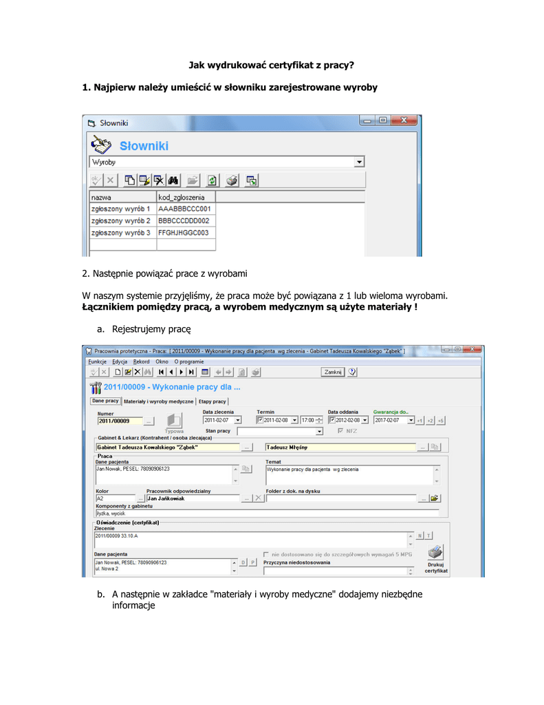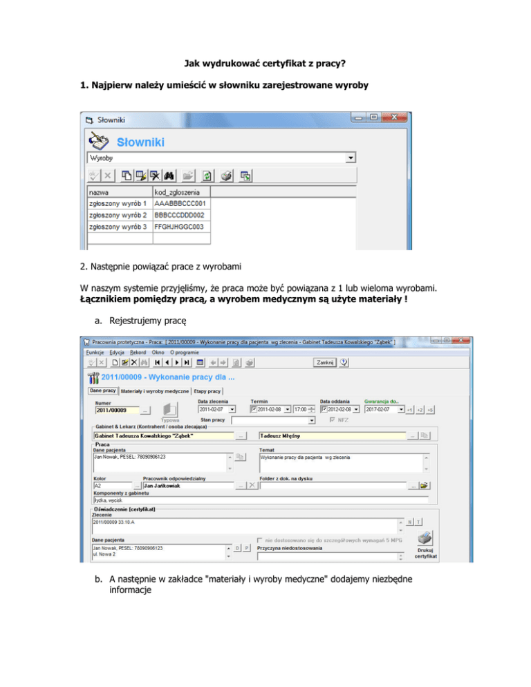 Jak wydrukować certyfikat z pracy? 1. Najpierw należy umieścić w słowniku zarejestrowane wyroby 2. Następnie powiązać prace z wyrobami W naszym systemie przyjęliśmy, że praca może być powiązana z 1 lub wieloma wyrobami. Łącznikiem pomiędzy pracą, a wyrobem medycznym są użyte materiały ! a. Rejestrujemy pracę b. A następnie w zakładce "materiały i wyroby medyczne" dodajemy niezbędne informacje 3. W ten możliwe jest uzyskanie certyfikatu 4. Jeżeli nie chcą Państwo wprowadzać informacji o użytych materiałach, należy w systemie zarejestrować jeden "pusty" materiał np. "brak danych", a następnie korzystać z wydruku certyfikatu, który nie zawiera listy materiałów.