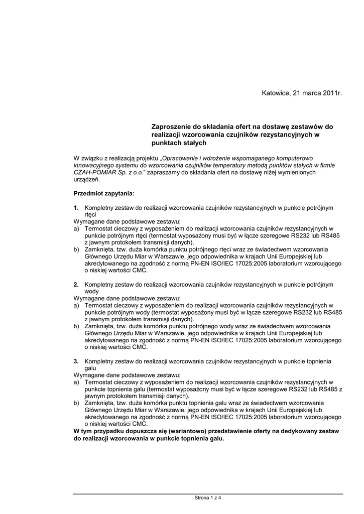Katowice, 21 marca 2011r. Zaproszenie do składania ofert na dostawę zestawów do realizacji wzorcowania czujników rezystancyjnych w punktach stałych W związku z realizacją projektu „Opracowanie i wdrożenie wspomaganego komputerowo innowacyjnego systemu do wzorcowania czujników temperatury metodą punktów stałych w firmie CZAH-POMIAR Sp. z o.o.” zapraszamy do składania ofert na dostawę niżej wymienionych urządzeń. Przedmiot zapytania: 1. Kompletny zestaw do realizacji wzorcowania czujników rezystancyjnych w punkcie potrójnym rtęci Wymagane dane podstawowe zestawu: a) Termostat cieczowy z wyposażeniem do realizacji wzorcowania czujników rezystancyjnych w punkcie potrójnym rtęci (termostat wyposażony musi być w łącze szeregowe RS232 lub RS485 z jawnym protokołem transmisji danych). b) Zamknięta, tzw. duża komórka punktu potrójnego rtęci wraz ze świadectwem wzorcowania Głównego Urzędu Miar w Warszawie, jego odpowiednika w krajach Unii Europejskiej lub akredytowanego na zgodność z normą PN-EN ISO/IEC 17025:2005 laboratorium wzorcującego o niskiej wartości CMC. 2. Kompletny zestaw do realizacji wzorcowania czujników rezystancyjnych w punkcie potrójnym wody Wymagane dane podstawowe zestawu: a) Termostat cieczowy z wyposażeniem do realizacji wzorcowania czujników rezystancyjnych w punkcie potrójnym wody (termostat wyposażony musi być w łącze szeregowe RS232 lub RS485 z jawnym protokołem transmisji danych). b) Zamknięta, tzw. duża komórka punktu potrójnego wody wraz ze świadectwem wzorcowania Głównego Urzędu Miar w Warszawie, jego odpowiednika w krajach Unii Europejskiej lub akredytowanego na zgodność z normą PN-EN ISO/IEC 17025:2005 laboratorium wzorcującego o niskiej wartości CMC. 3. Kompletny zestaw do realizacji wzorcowania czujników rezystancyjnych w punkcie topnienia galu Wymagane dane podstawowe zestawu: a) Termostat cieczowy z wyposażeniem do realizacji wzorcowania czujników rezystancyjnych w punkcie topnienia galu (termostat wyposażony musi być w łącze szeregowe RS232 lub RS485 z jawnym protokołem transmisji danych). b) Zamknięta, tzw. duża komórka punktu topnienia galu wraz ze świadectwem wzorcowania Głównego Urzędu Miar w Warszawie, jego odpowiednika w krajach Unii Europejskiej lub akredytowanego na zgodność z normą PN-EN ISO/IEC 17025:2005 laboratorium wzorcującego o niskiej wartości CMC. W tym przypadku dopuszcza się (wariantowo) przedstawienie oferty na dedykowany zestaw do realizacji wzorcowania w punkcie topnienia galu. Strona 1 z 4 4. Czujnik rezystancyjny SPRT wraz ze świadectwem wzorcowania Głównego Urzędu Miar w Warszawie, jego odpowiednika w krajach Unii Europejskiej lub akredytowanego na zgodność z normą PN-EN ISO/IEC 17025:2005 laboratorium wzorcującego o niskiej wartości CMC Wymagane dane podstawowe: a) Rezystancja nominalna 25 b) W Ga ≥ 1,11807 c) W Hg ≤0,844235 d) Wysoka stabilność, powtarzalność e) Niski efekt samonagrzewania się f) Długość części pomiarowej: ok. 480mm. g) Średnica części pomiarowej: ok. 7,5mm. h) Materiał osłony: szkło kwarcowe 5. Mostek rezystancyjny prądu przemiennego (z kompletem kabli przyłączeniowych i zasilających) wraz ze świadectwem wzorcowania Głównego Urzędu Miar w Warszawie, jego odpowiednika w krajach Unii Europejskiej lub akredytowanego na zgodność z normą PN-EN ISO/IEC 17025:2005 laboratorium wzorcującego o niskiej wartości CMC Wymagane dane podstawowe zestawu: a) Dokładność: nie gorsza niż ±0.1 ppm (±25K) b) Pomiar różnicowy lub absolutny c) Ręczne lub automatyczne równoważenie mostka d) Regulowany (wybierany) prąd pomiarowy e) Regulowana (wybierana) częstotliwość prądu pomiarowego f) Możliwość wyboru prądów nagrzewania g) Możliwość współpracy z zewnętrznymi rezystorami wzorcowymi (odniesienia) h) Możliwość współpracy z wielokanałowym multiplekserem i) Łącze komunikacyjne (szeregowe RS232 lub IEEE) z jawnym protokołem transmisji danych 6. Wielokanałowy multiplekser do współpracy z ww. mostkiem rezystancyjnym (dopuszczalne wykonanie wspólne – w jednej obudowie z mostkiem) 7. Rezystor wzorcowy z obudową termiczną, wraz ze świadectwem wzorcowania Głównego Urzędu Miar w Warszawie, jego odpowiednika w krajach Unii Europejskiej lub akredytowanego na zgodność z normą PN-EN ISO/IEC 17025:2005 laboratorium wzorcującego o niskiej wartości CMC Wymagane dane podstawowe zestawu: a) Rezystancja nominalna 25. 8. Rezystor wzorcowy z obudową termiczną, wraz ze świadectwem wzorcowania Głównego Urzędu Miar w Warszawie, jego odpowiednika w krajach Unii Europejskiej lub akredytowanego na zgodność z normą PN-EN ISO/IEC 17025:2005 laboratorium wzorcującego o niskiej wartości CMC Wymagane dane podstawowe zestawu: a) Rezystancja nominalna 100. Informacje ogólne Miejsce dostawy: loco zamawiający W ofercie proszę podać koszt sumaryczny zestawu jak i poszczególnych jego składowych oraz dołączyć karty katalogowe. Składający ofertę musi być jednostką prawną. Do oferty dołączyć należy aktualny wyciąg z KRS, NIP, REGON, zaświadczenie o nie zaleganiu składek do US i ZUS. Ofertę o minimalnym terminie ważności do 31.05.2011 roku należy składać w formie papierowej osobiście lub przesłać pocztą (firmą kurierską) w terminie do dnia 29 marca 2011 roku na adres: CZAH-POMIAR Sp. z o.o. Ul. Porcelanowa 25 40-241 Katowice Strona 2 z 4 Kryteria oceny ofert Wybór oferty dokonany zostanie na podstawie niżej przedstawionych kryteriów: cena: 60, referencje (zrealizowane dostawy tego typu na terenie kraju, wykaz - lista użytkowników): 10, termin realizacji dostawy: 10, termin płatności: 10, gwarancja: 10, Oferta spełniająca w najwyższym stopniu ww. kryteria otrzyma maksymalną liczbę punktów. Pozostałym oferentom, spełniającym wymagania, przypisana zostanie odpowiednio mniejsza liczba punktów. Wynik będzie traktowany jako wartość punktowa ofe